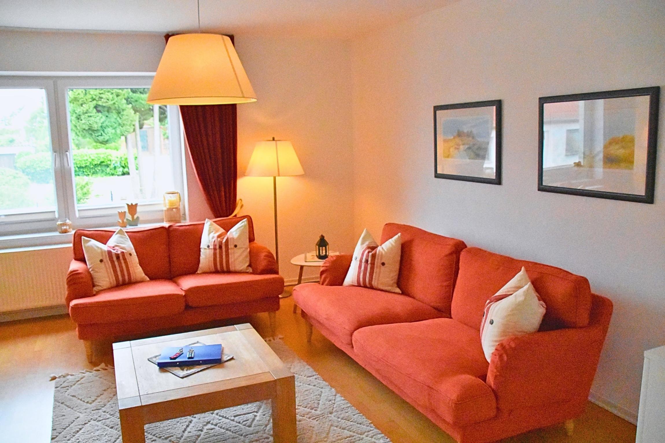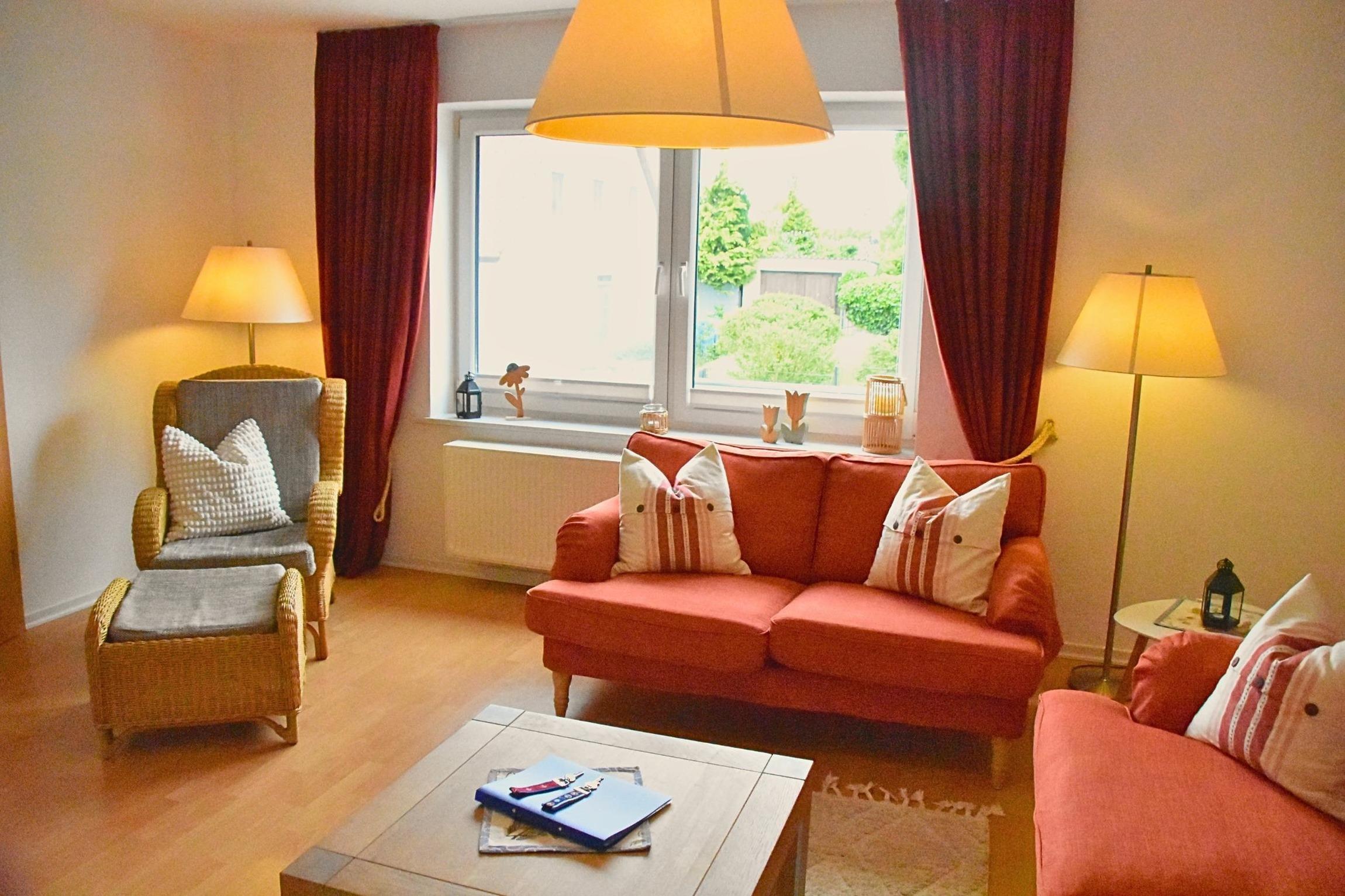 Drei separate Schlafzimmer, ein großer Wohnbereich mit angrenzendem Essbereich, Einbauküche, Badezimmer und Gäste-WC, Hauswirtschaftsraum mit Waschmaschine und Tiefkühlschrank , WLAN, Garten mit Strandkorb und Loungemöbeln, Grillplatz, kostenlose Autostellplätze vor dem Haus und eine abschließbare Garage für Fahrräder.
