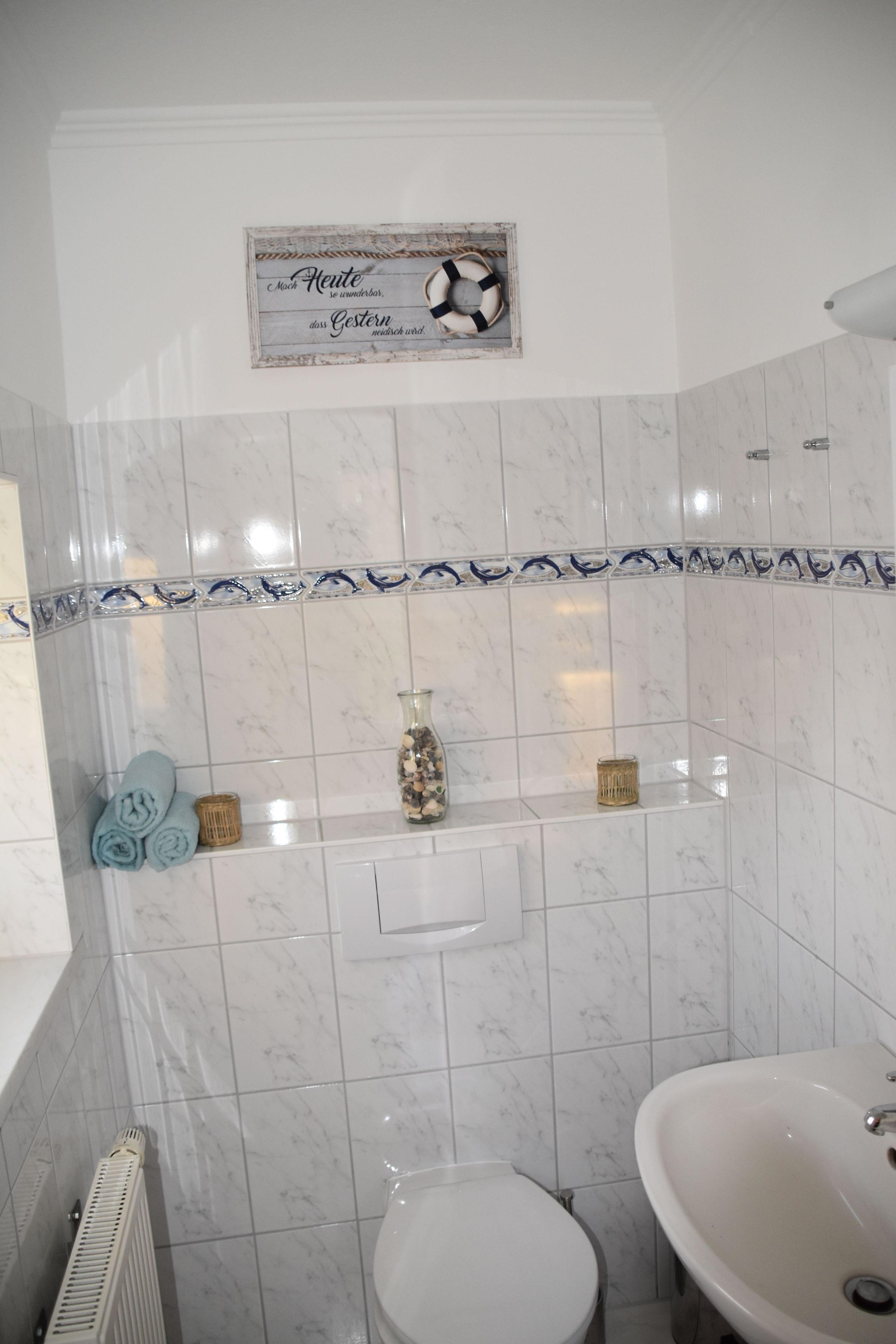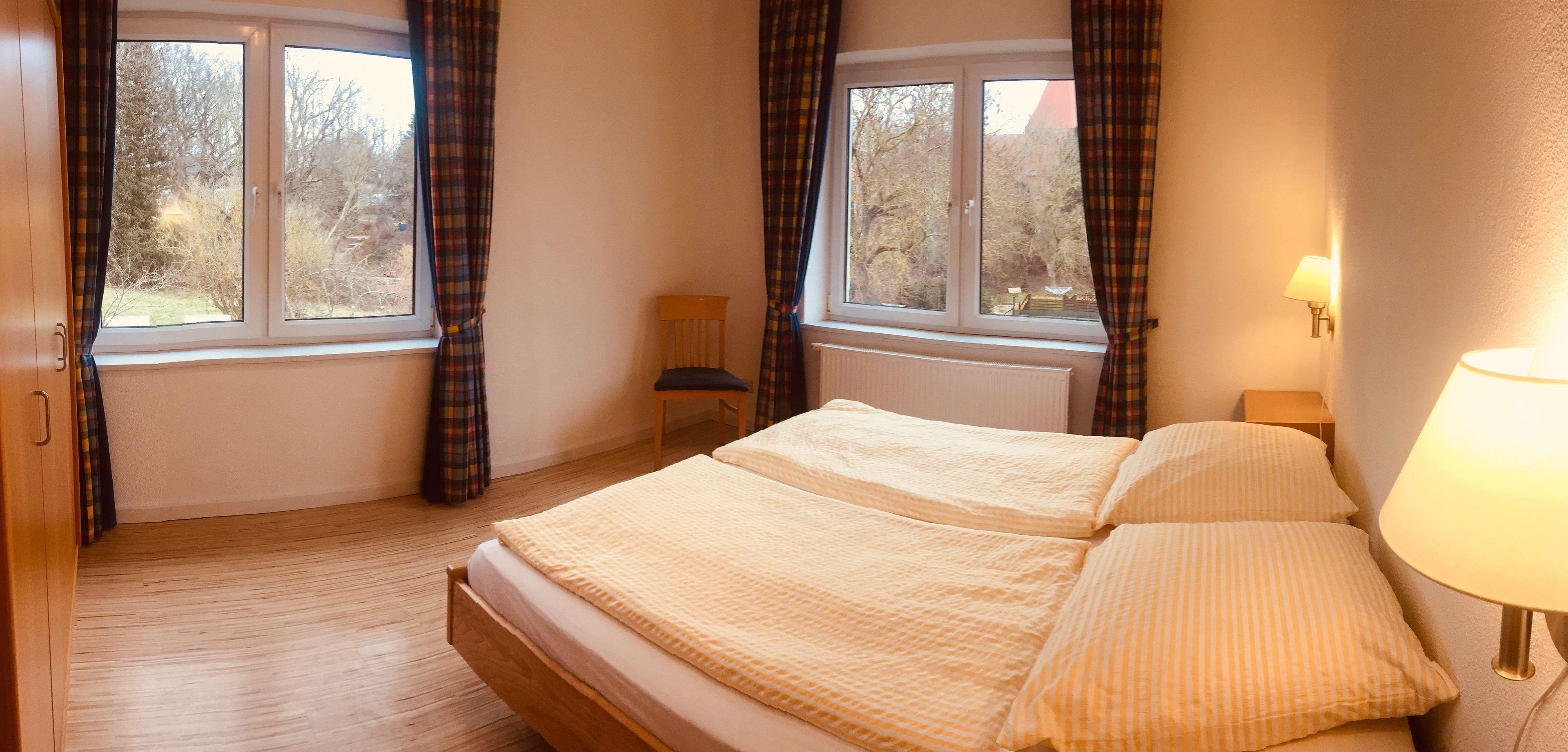 Auf dieser Etage gibt es ein geräumiges Familienschlafzimmer mit zwei Einzelbetten (Fiete 1) bzw. einem Doppelbett (180x200 cm) (Fiete 2) und jeweils einem Etagenbett (2x90x200cm). Ein weiteres Elternschlafzimmer ( Doppelbett 180x200 cm) mit Blick in den Garten Richtung Parkanlage "Brunnenaue". Ein weiteres Schlafzimmer für weitere zwei Gäste (Doppelbett 180x200 cm) mit einem weiteren Fernseher. Auch haben Sie ein großes Bad mit Badewanne, Dusche, zwei Waschbecken und Fön. Alle Wohn- und Schlafzimmer haben Fenster mit Sicht- und Insektenschutz.