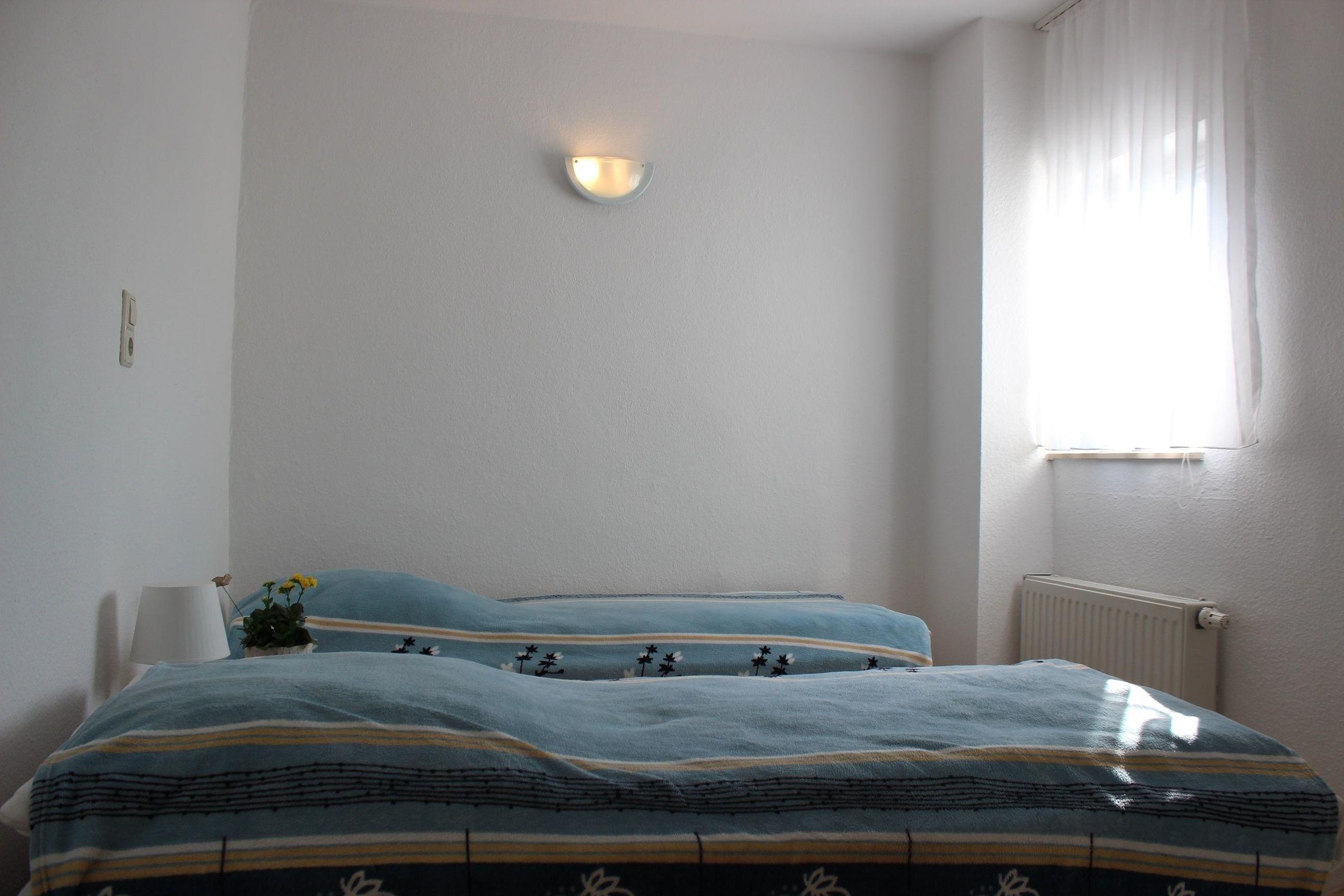 Die zwei separaten Schlafzimmer bieten Platz für vier Erwachsene und sind ruhig gelegen, mit Blick zum Garten . Auf Wunsch kann ein Babybett zur Verfügung gestellt werden.