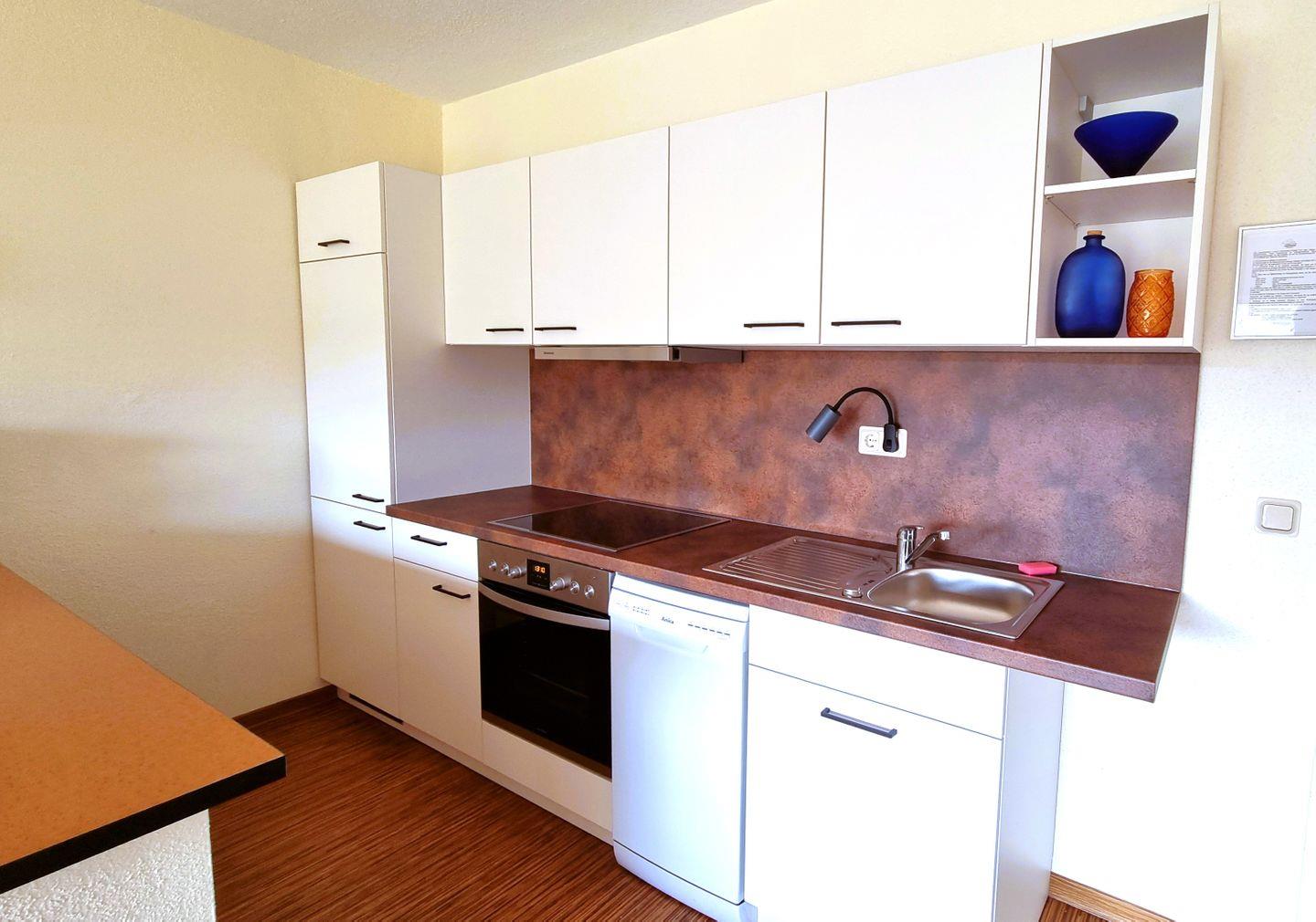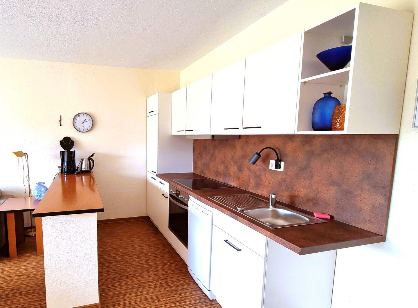 Eine integrierte Küchenzeile mit gemütlicher Essecke bietet alles, was Sie für eine unkomplizierte Selbstverpflegung benötigen.