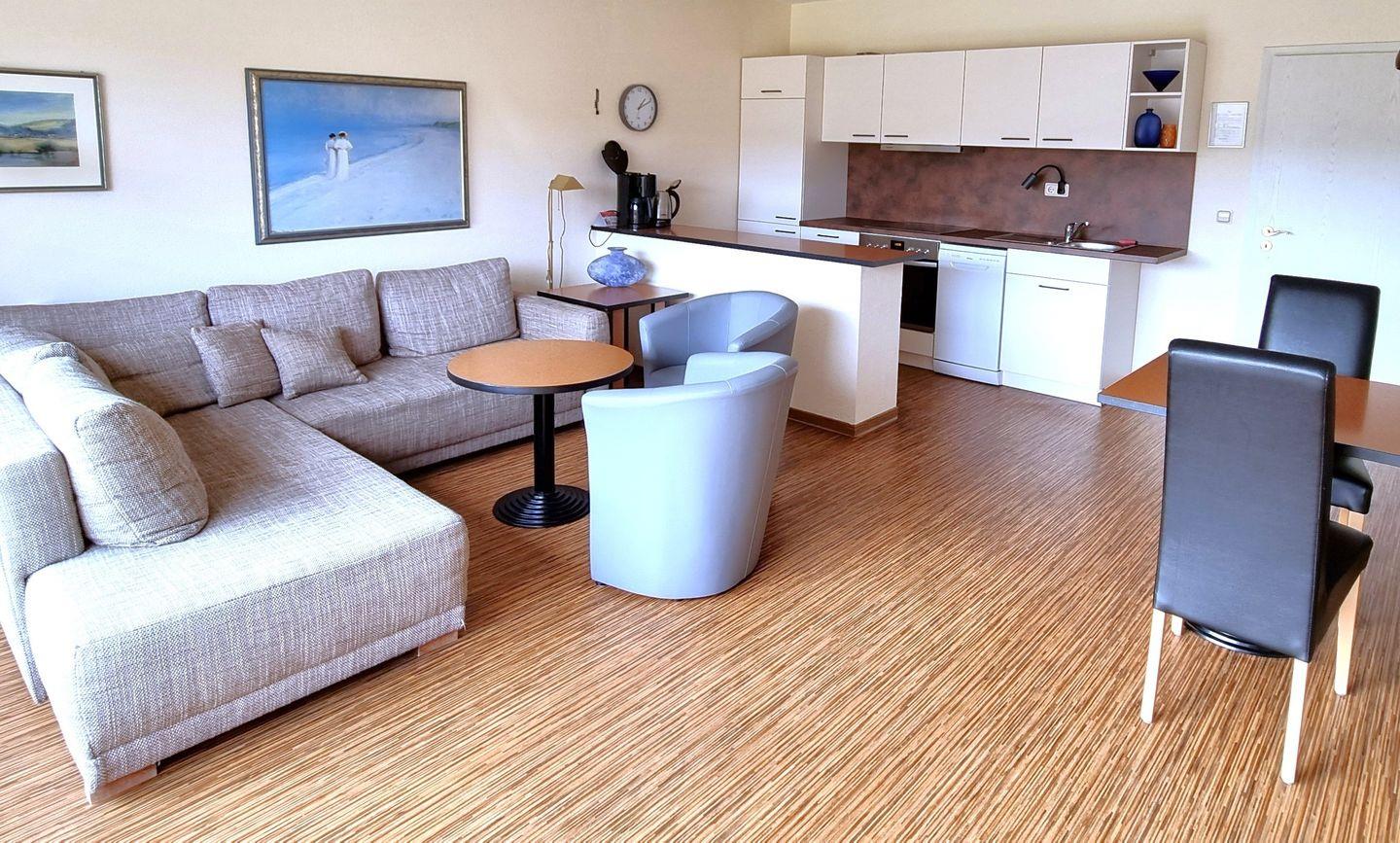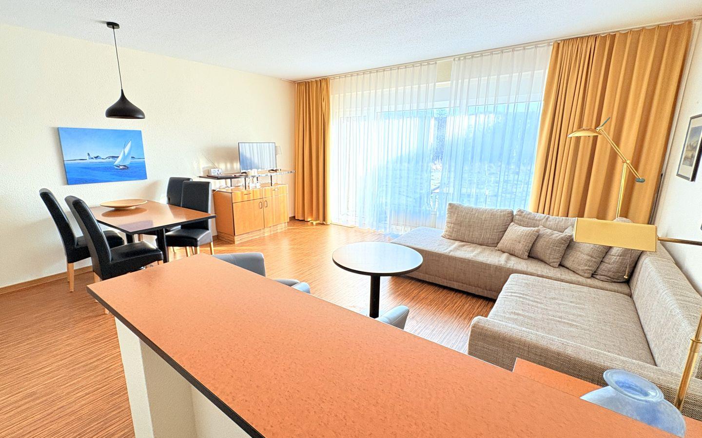 Der offene Wohnbereich mit bequemer Doppelschlafcouch und Sesseln lädt zum Entspannen ein. Dank der großen bodentiefen Fenster ist der Raum lichtdurchflutet und vermittelt ein angenehmes Wohngefühl.