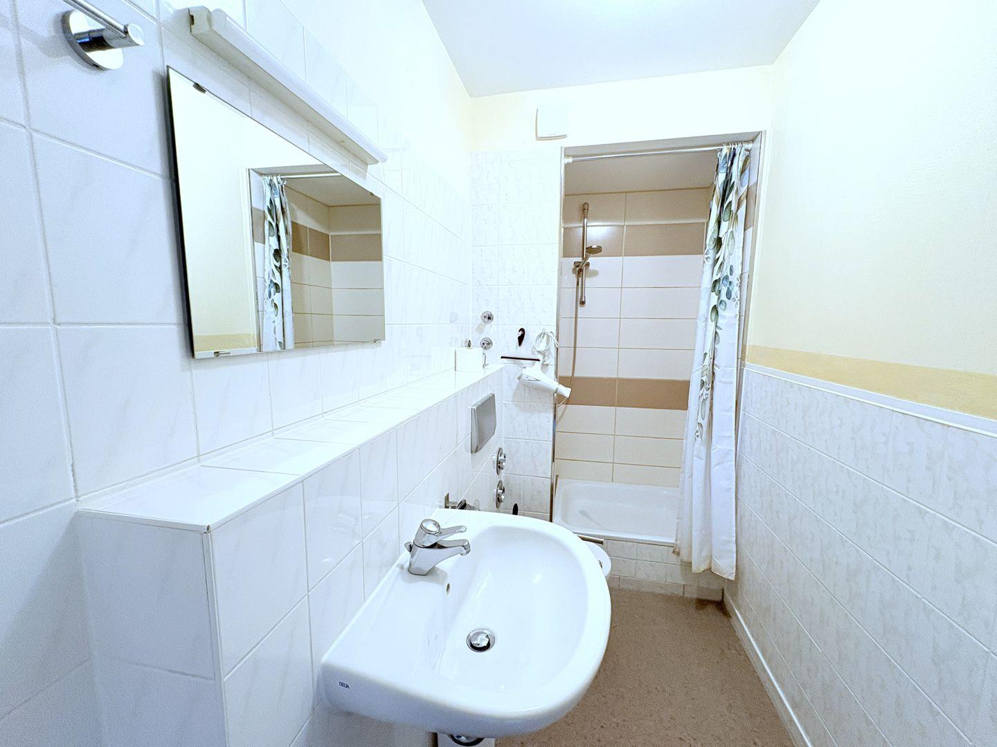 Das moderne Badezimmer verfügt über Dusche und WC.