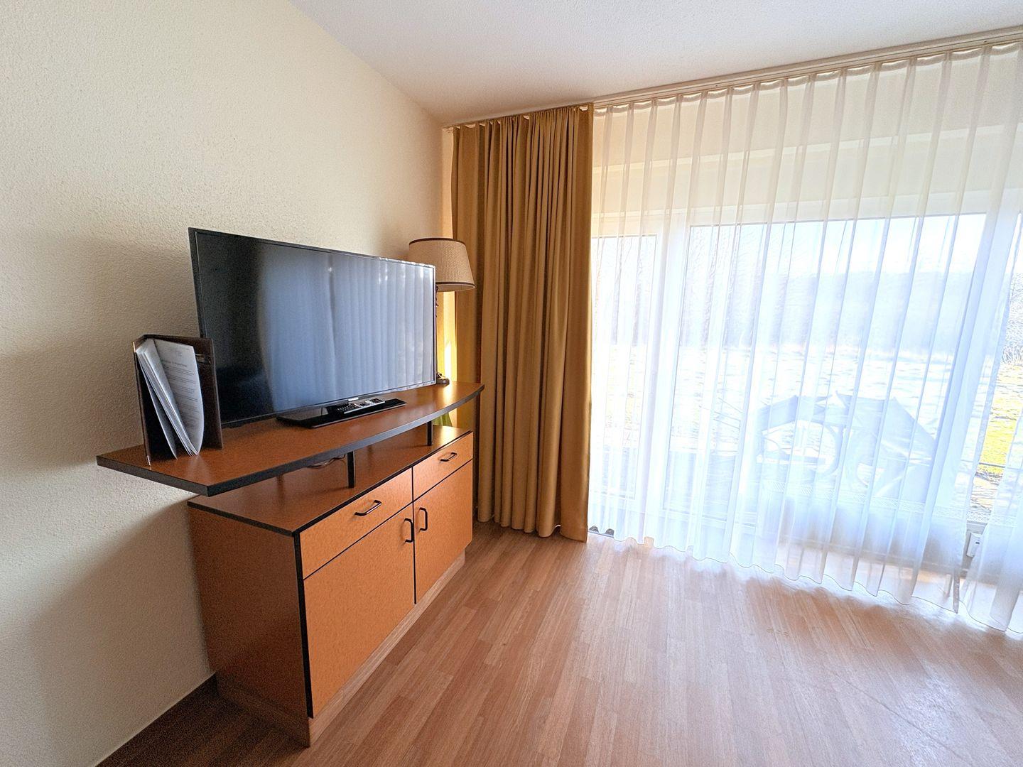 Der offene Wohnbereich mit bequemer Doppelschlafcouch und Sesseln lädt zum Entspannen ein. Dank der großen bodentiefen Fenster ist der Raum lichtdurchflutet und vermittelt ein angenehmes Wohngefühl.