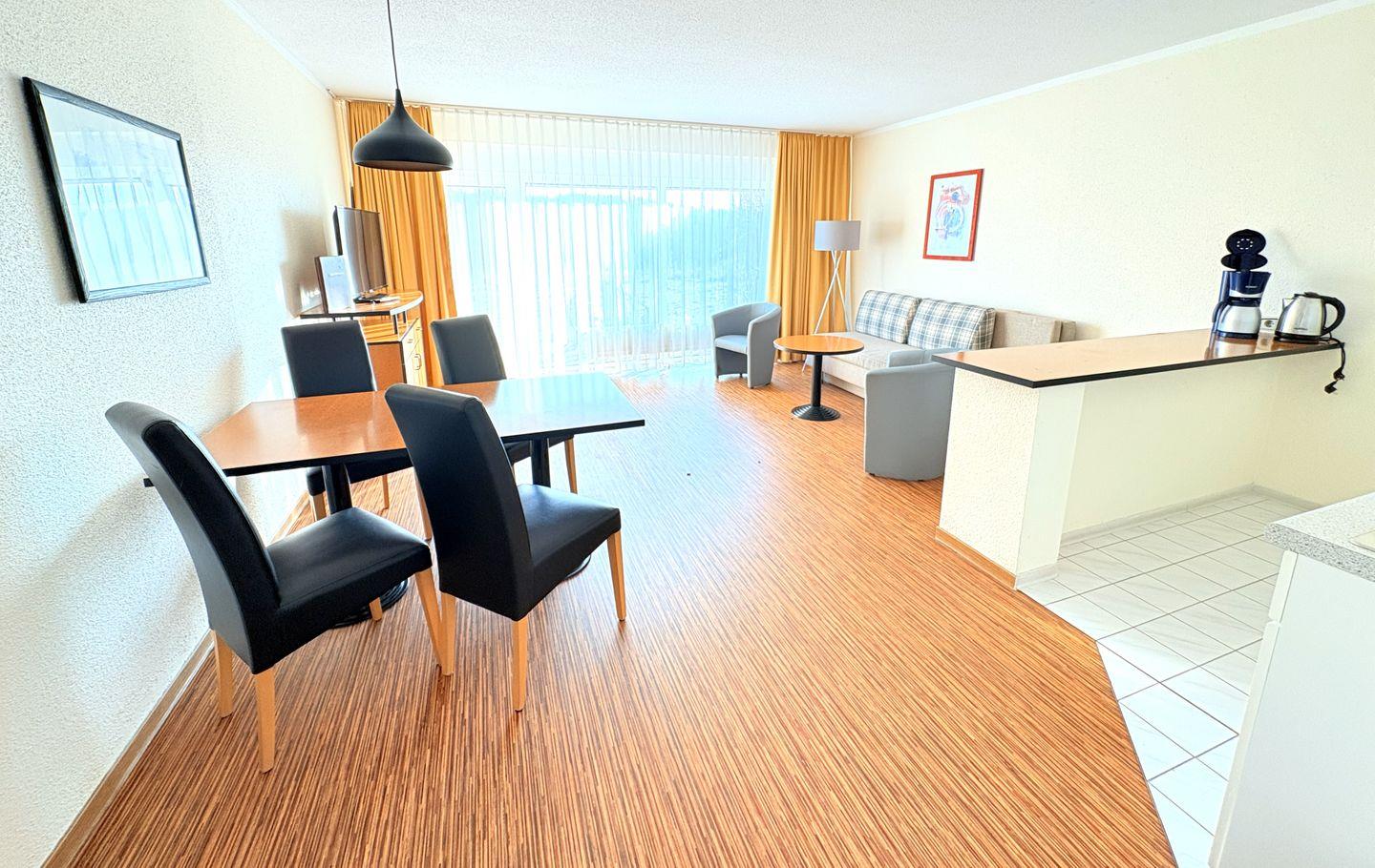 Der offene Wohnbereich mit bequemer Doppelschlafcouch und Sesseln lädt zum Entspannen ein. Dank der großen bodentiefen Fenster ist der Raum lichtdurchflutet und vermittelt ein angenehmes Wohngefühl.