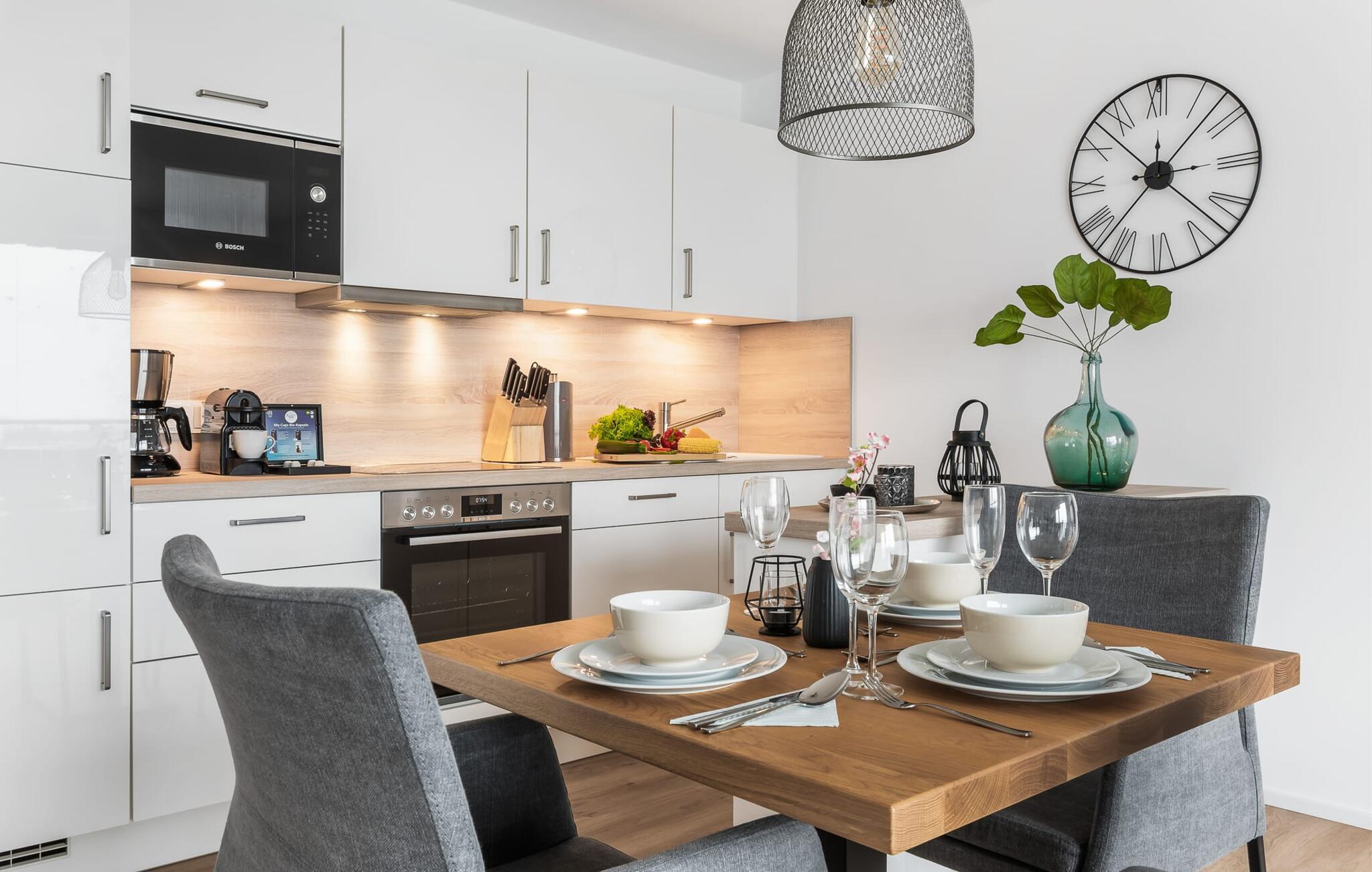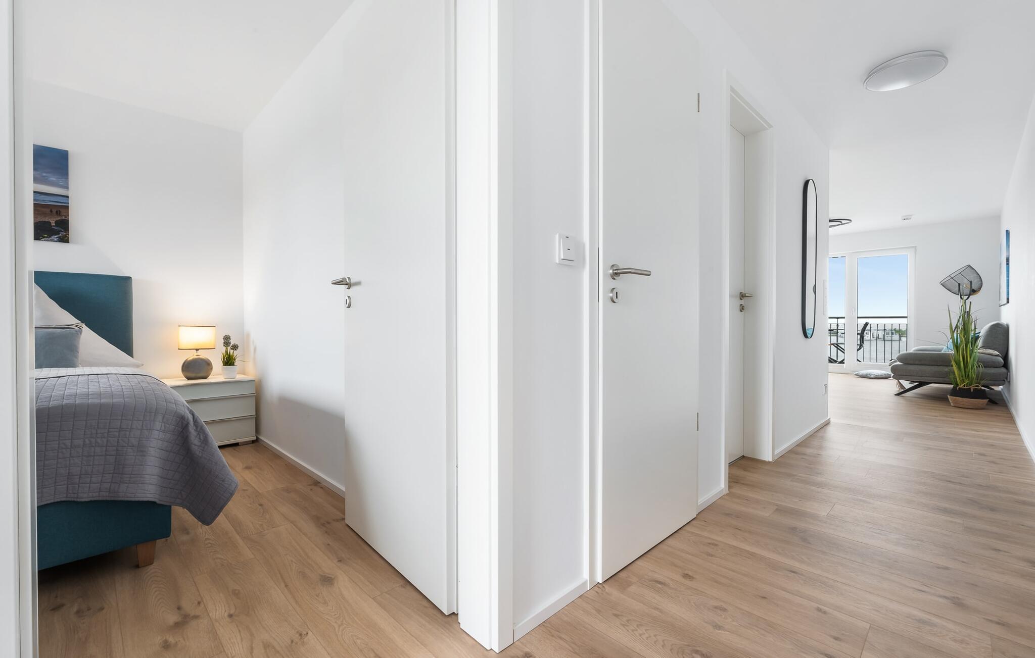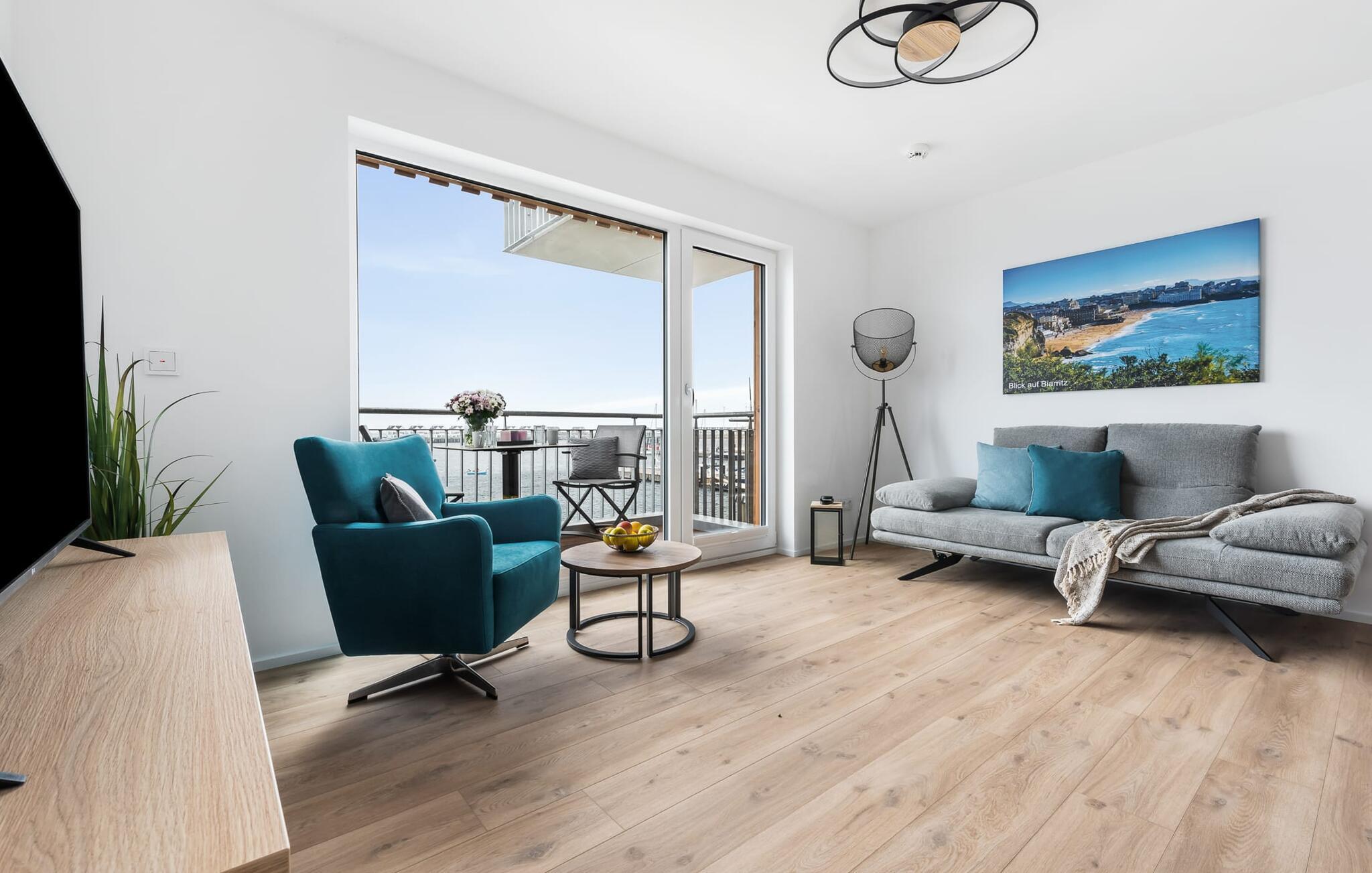 Schließt die Wohnungstür auf, tretet ein und fühlt sich einfach nur wohl! Euer Blick fällt direkt durch die bodentiefen Fenster über den Balkon auf den Hafen und Wasser bis zum Horizont. Das ist Urlaubsfeeling pur!