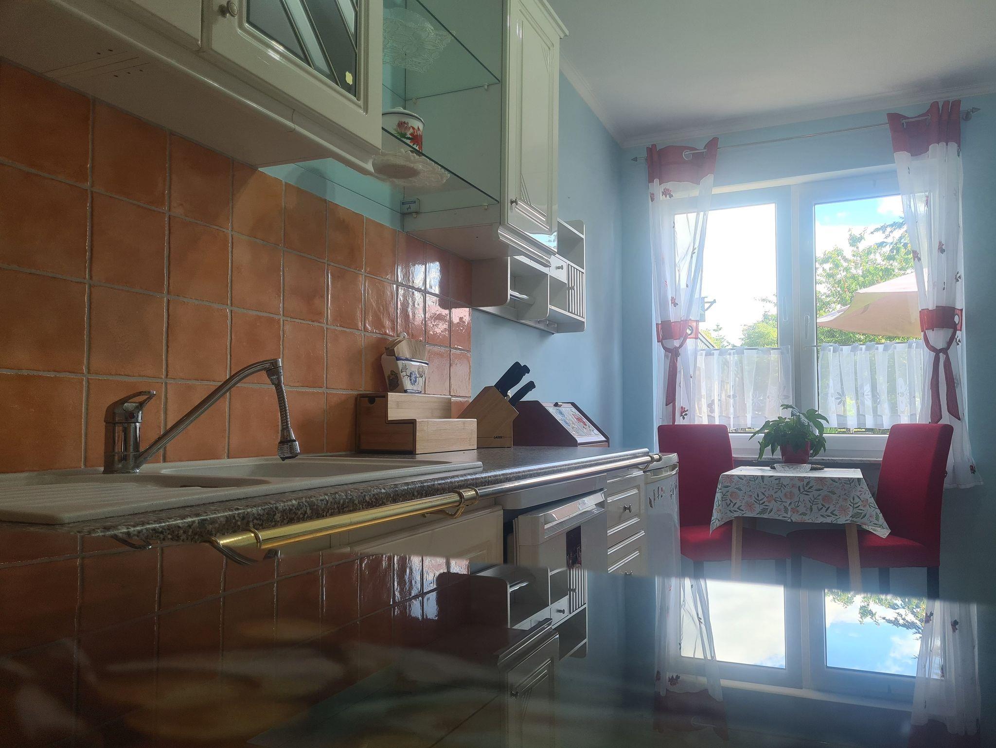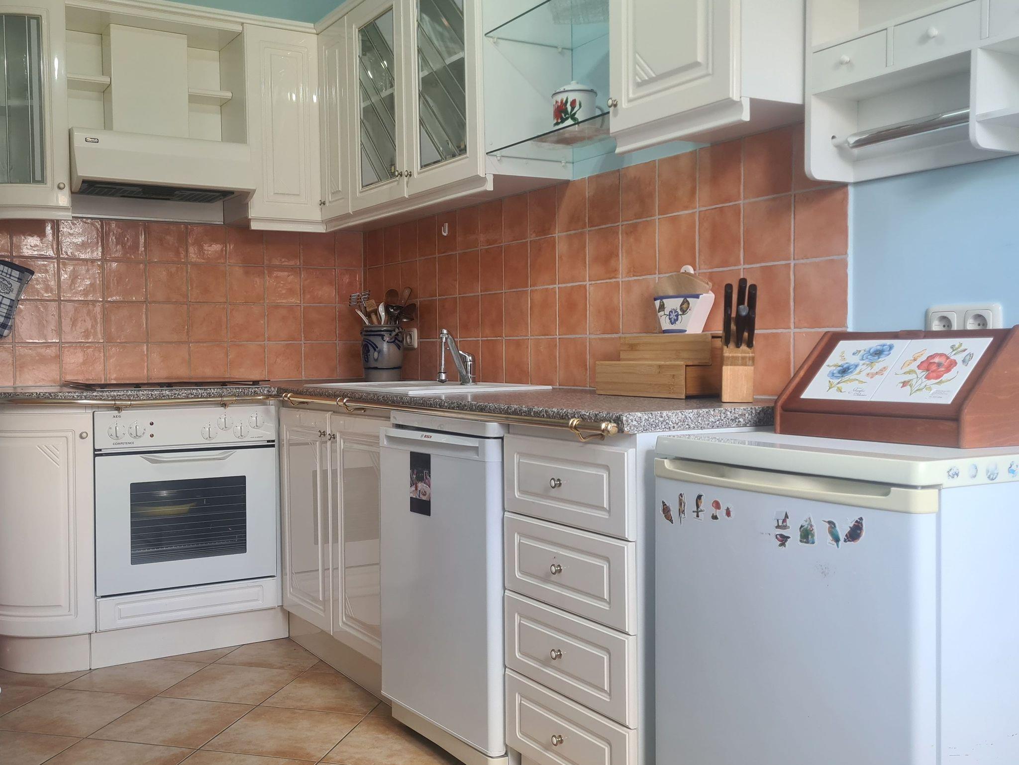 Erdgeschoss: Küche (Ceran-Herd, Backofen, Kaffeemaschine, Toaster, Wasserkocher, Kühl/Gefrierschrank). Ebenerdiges Duschbad/WC. Waschmaschine und Fußbodenheizung.