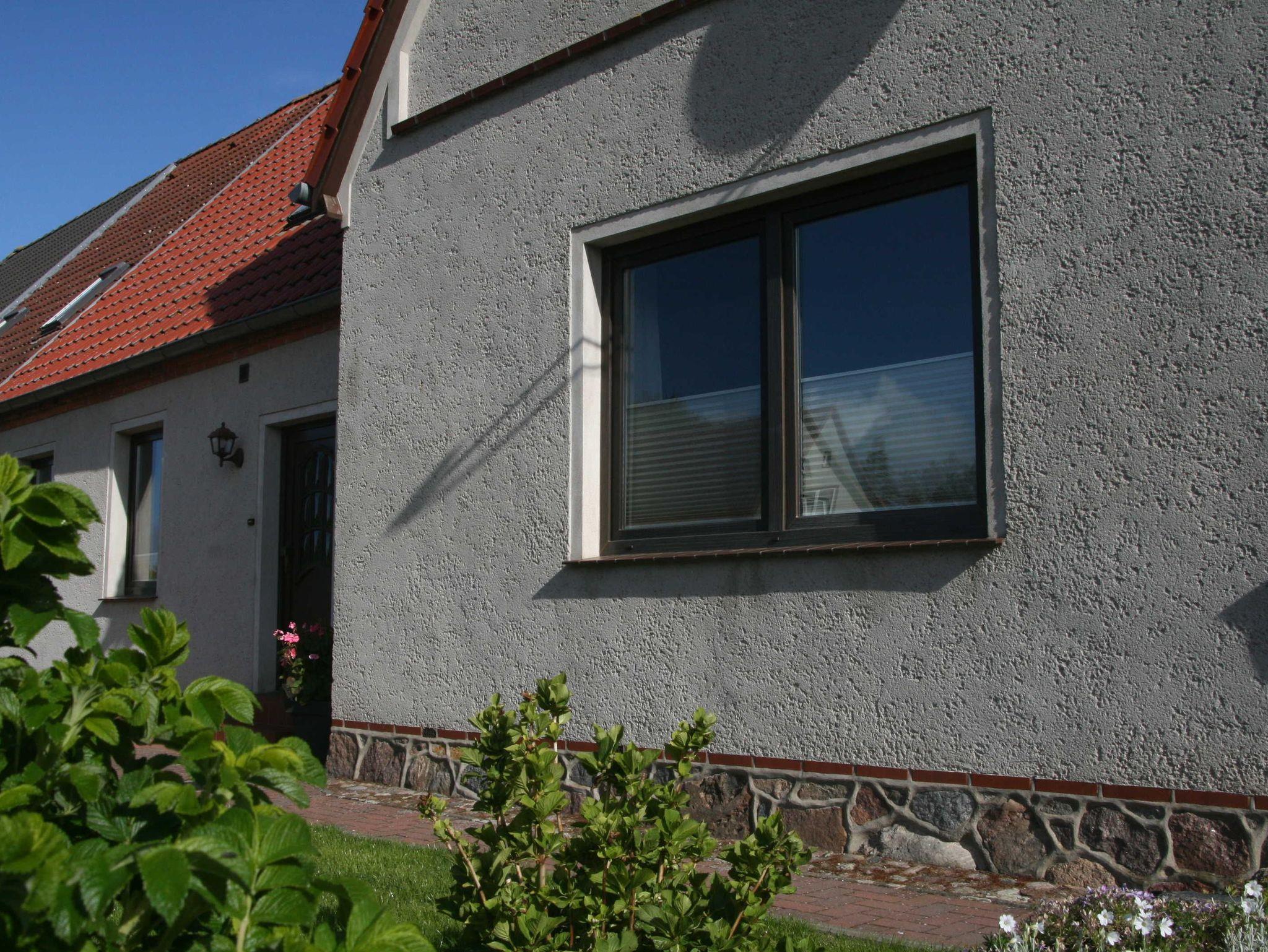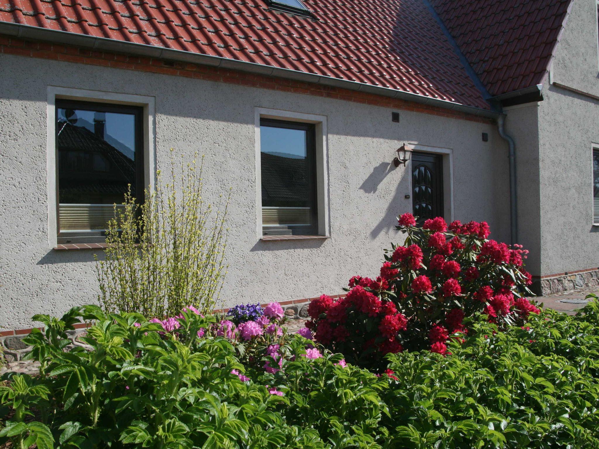 Landhaus mit 3-Raum-Ferienwohnung (max 4 Pers. + 1 Baby, 63m²) mit Terrasse, Parkplatz und separatem Eingang, im Erdgeschoß des typisch Mecklenburgischen Reihenhauses (Baujahr 1899) mit 3.000m² großem und sehr gepflegtem Gartengrundstück im wunderbar ruhigem Gutsdorf.