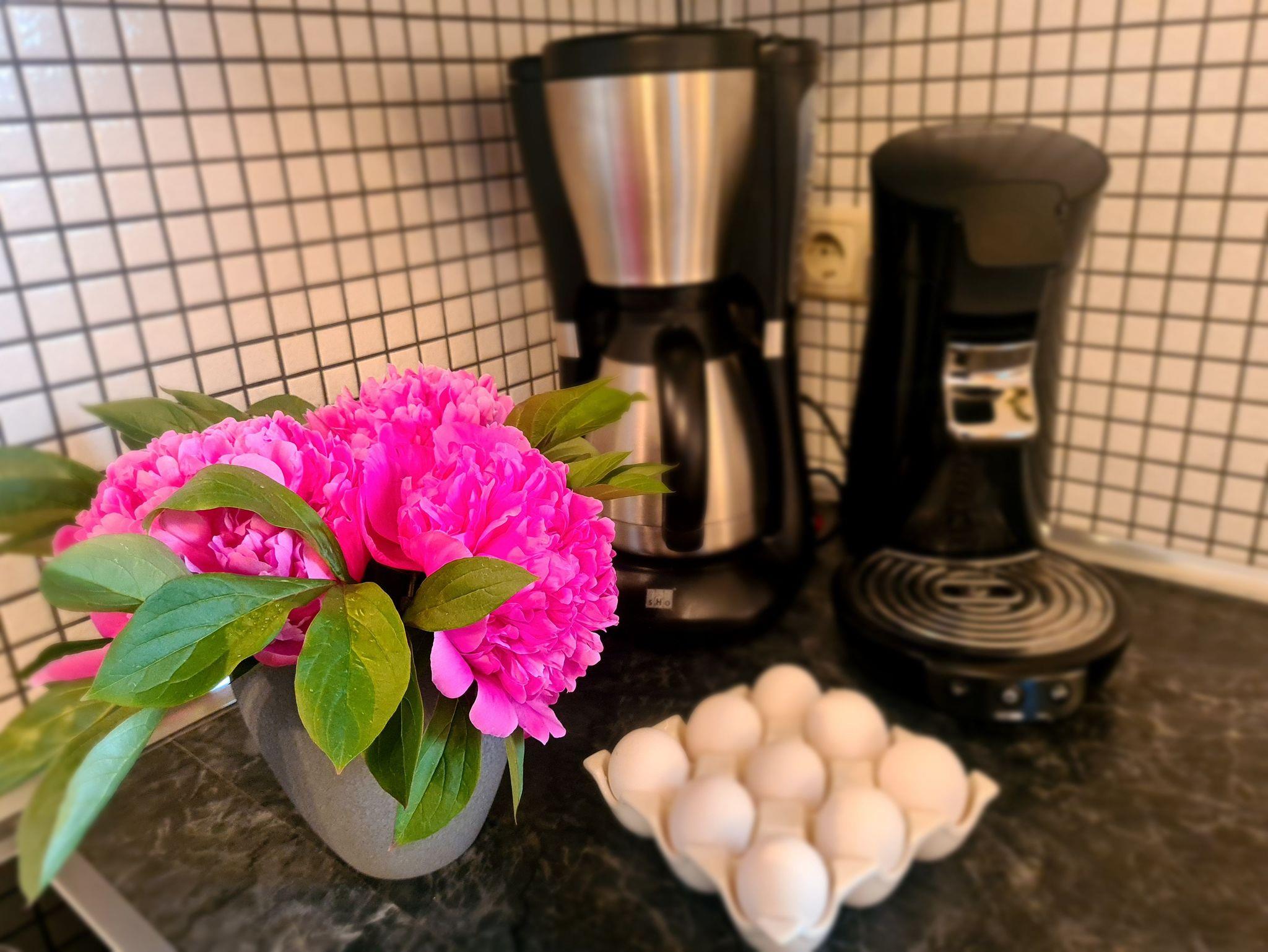 Küchenzeile mit 4-Kochfeld-Ceran-Herd, Backofen, Mikrowelle, Kaffeemaschine, Senseo- Kaffeepad- Automat, Toaster, Wasserkocher. Esstisch. 1 Babyhochstuhl vorhanden.
