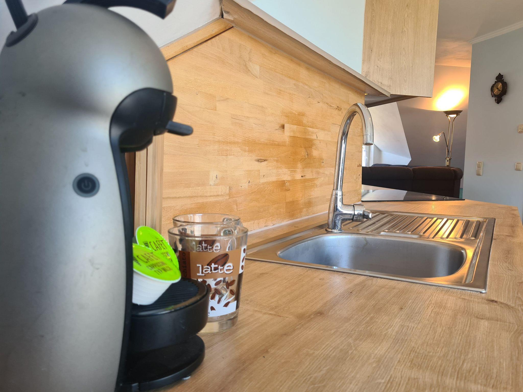 Helle, offene Wohnküche mit Kamin: Esstisch für 4 Personen und Küchenzeile (Ceran-Herd, Backofen, Kaffeemaschine, Toaster, Wasserkocher, Kühl/Gefrierfach). Große Eckcouch und Schlafnische mit 1 Einzelbett (0.90x2m).