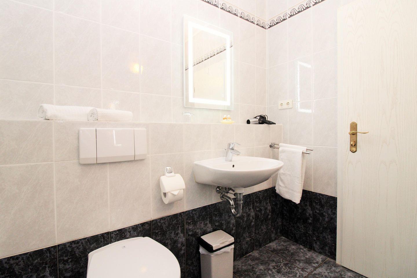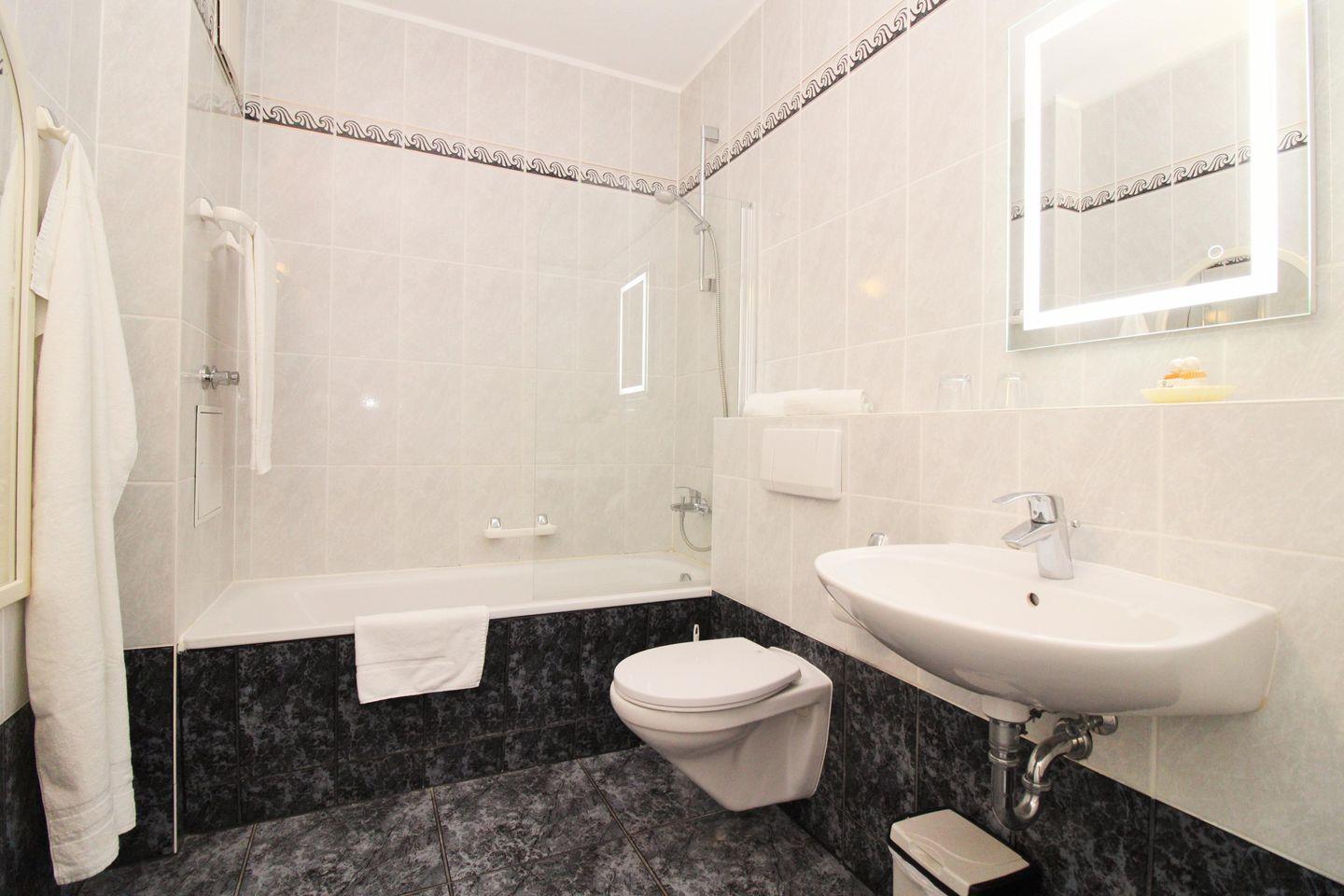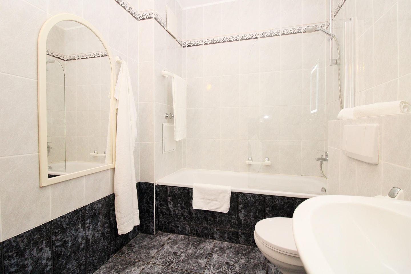 Das geräumige Badezimmer verfügt über eine Badewanne mit Echtglas-Duschabtrennung, Waschbecken und WC, einen Föhn sowie ausreichend Ablagemöglichkeiten.