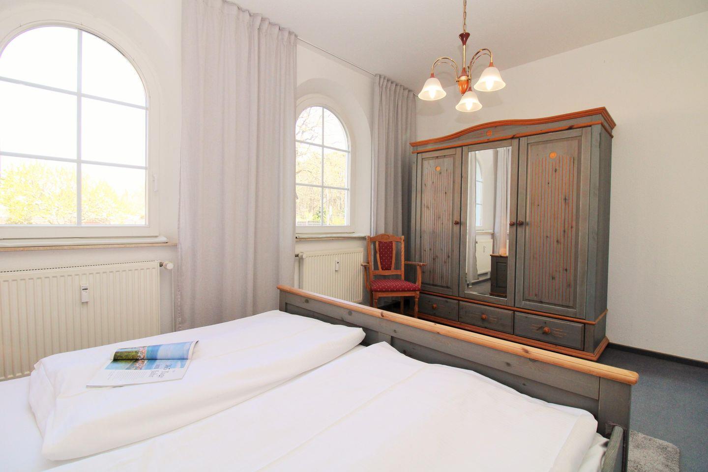 Das gemütliche und helle Schlafzimmer ist mit einem bequemen Doppelbett, Nachttischen, einem geräumigen Kleiderschrank sowie einem Stuhl eingerichtet. Zusätzliche Verdunkelungsvorhänge an den Fenstern ermöglichen eine ungestörte Nachtruhe.