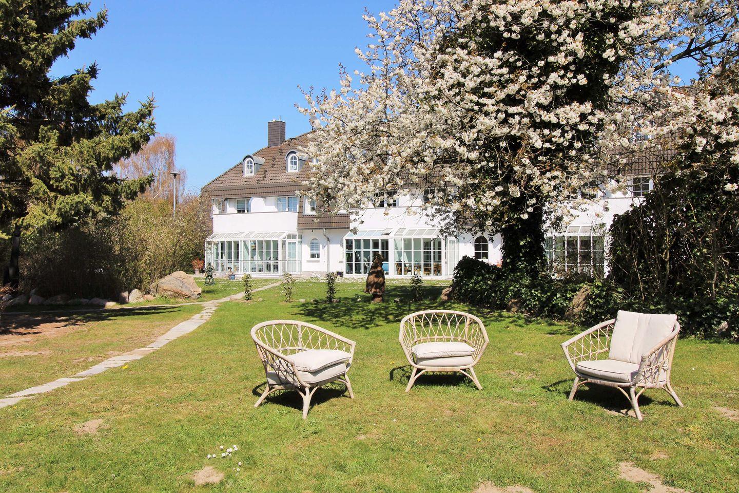 Das freundliche und geräumige Wohn-/Esszimmer verfügt über eine separate Sitzgruppe mit bequemer Couch, 2 Korbsesseln, Couchtisch sowie eine Kommode. Vom Wohnzimmer aus haben Sie Zugang zu dem großen und lichtdurchfluteten Wintergarten (nach Süden ausgerichtet) mit einer weiteren Sitzgruppe bestehend aus einer Sitzbank, 2 Stühlen sowie einem großen Esstisch. Hier sitzen Sie entspannt und gemütlich im Grünen und können abends bei einem guten Glas Wein in Ruhe die lauen Sommernächte genießen! Die Wohnung verfügt im Außenbereich weiterhin über eine ebenfalls nach Süden ausgerichtete ca. 4 m² große und sonnige Terrasse.