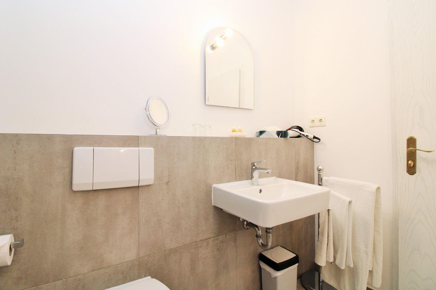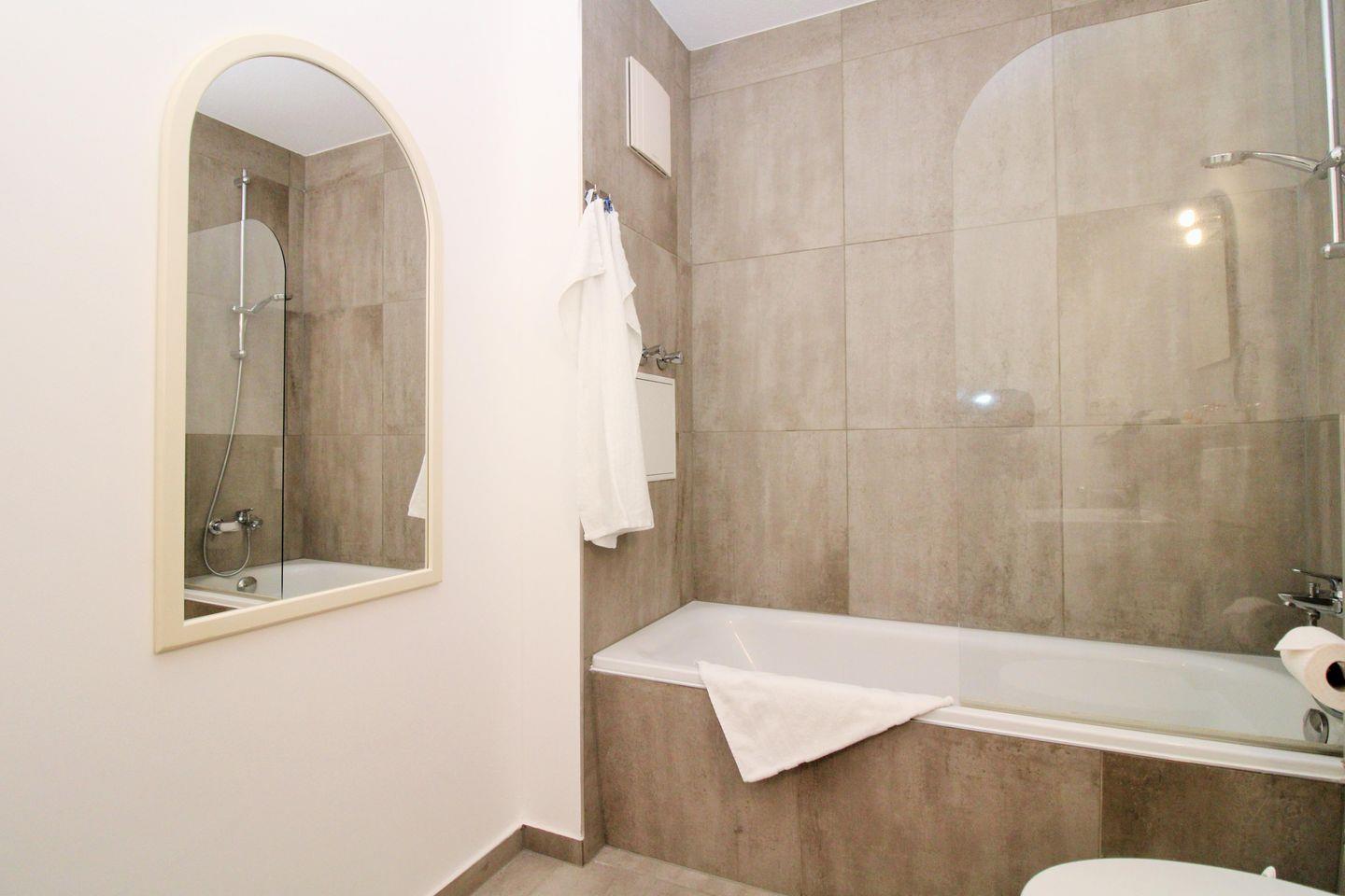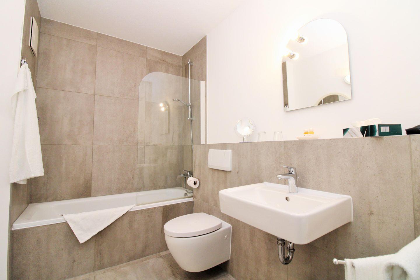 Das geräumige Badezimmer verfügt über eine Badewanne mit Echtglas-Duschabtrennung, Waschbecken und WC, Föhn, Kosmetikspiegel sowie ausreichend Ablagemöglichkeiten.