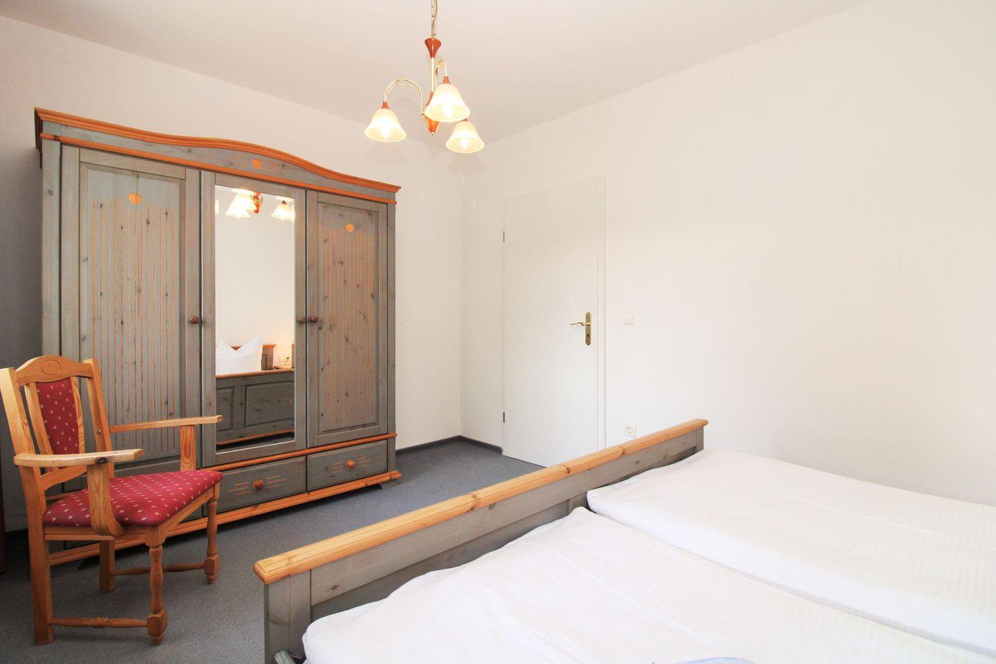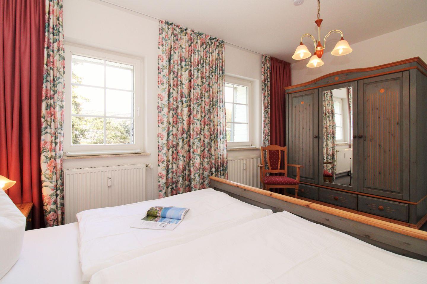 Das gemütliche und helle Schlafzimmer ist mit einem bequemen Doppelbett, Nachttischen, einem geräumigen Kleiderschrank sowie einem Stuhl eingerichtet. Zusätzliche Verdunkelungsvorhänge an den Fenstern ermöglichen eine ungestörte Nachtruhe.