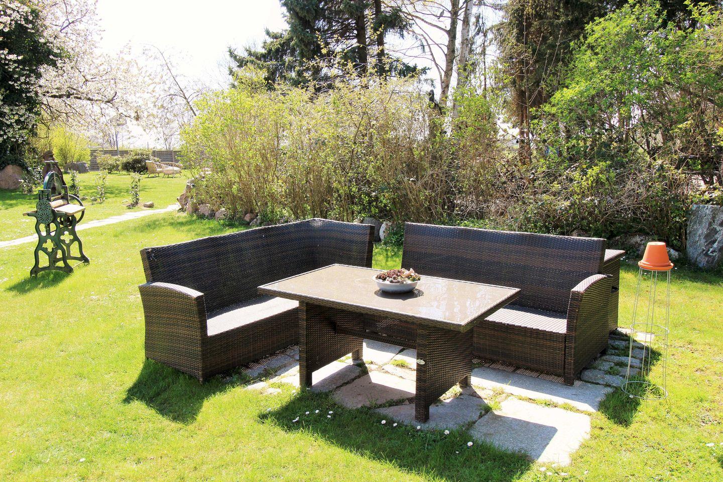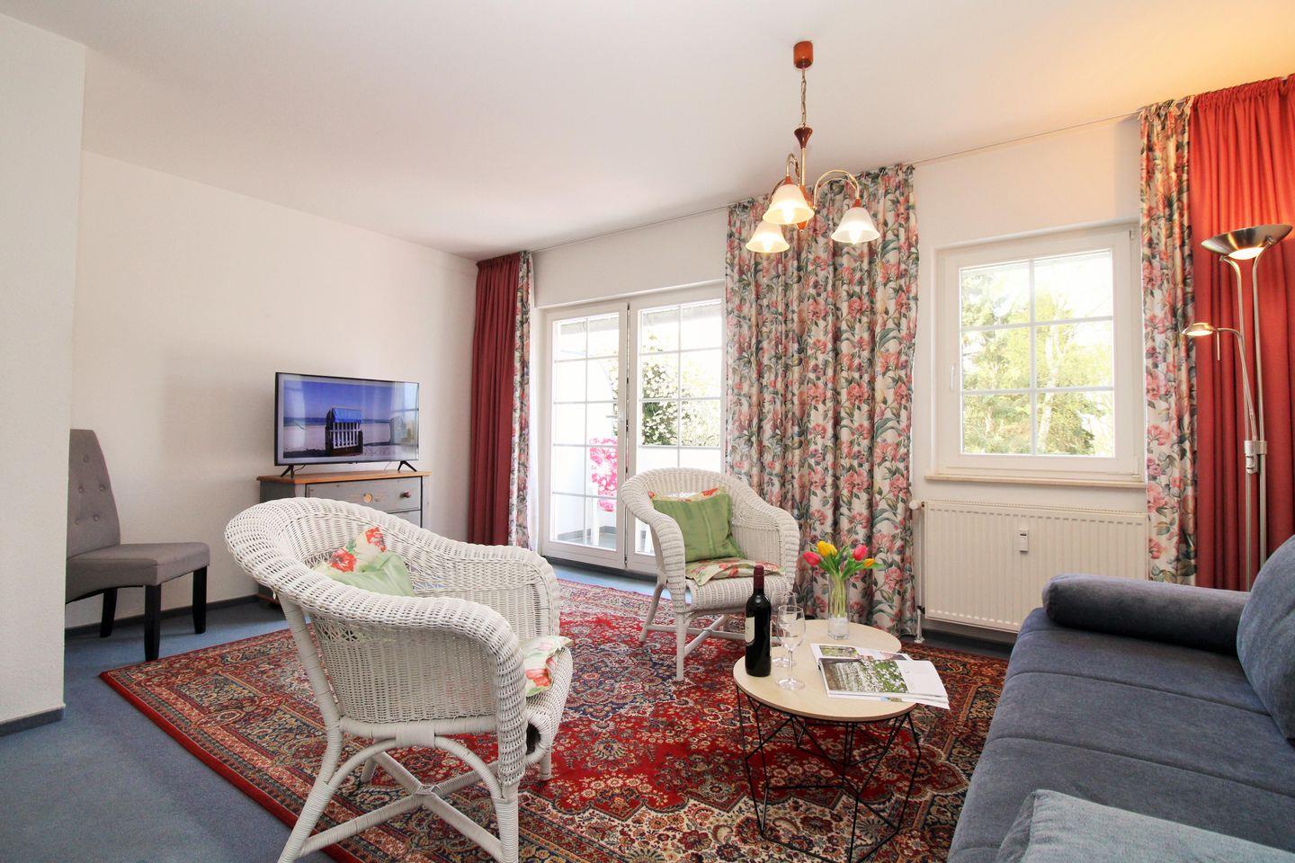 Das freundliche und geräumige Wohn-/Esszimmer verfügt über eine separate Sitzgruppe mit bequemer Couch, 2 Korbsesseln, Couchtisch sowie eine Kommode. Vom Wohnzimmer aus haben Sie Zugang zu dem ca. 4 m² großen Balkon (nach Süden ausgerichtet) mit Balkonmöbeln. Hier sitzen Sie entspannt und gemütlich im Grünen und können abends bei einem guten Glas Wein in Ruhe die lauen Sommernächte genießen!