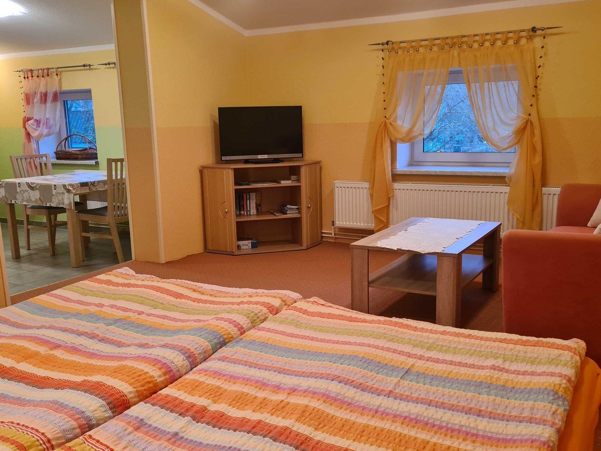 2-Raum-Ferienwohnung in der 1. Etage des Landgasthofes. Kombiniertes Wohn-/Schlafzimmer mit TV, Doppelbett, Pantryküche mit Esstisch, Duschbad/ WC. Internet WLAN und Erstausstattung Bettwäsche und Handtücher inklusive. Sitzecke mit Grill, überdachte Gemeinschaftsterrasse und Parkplatz im Außenbereich am Haus.