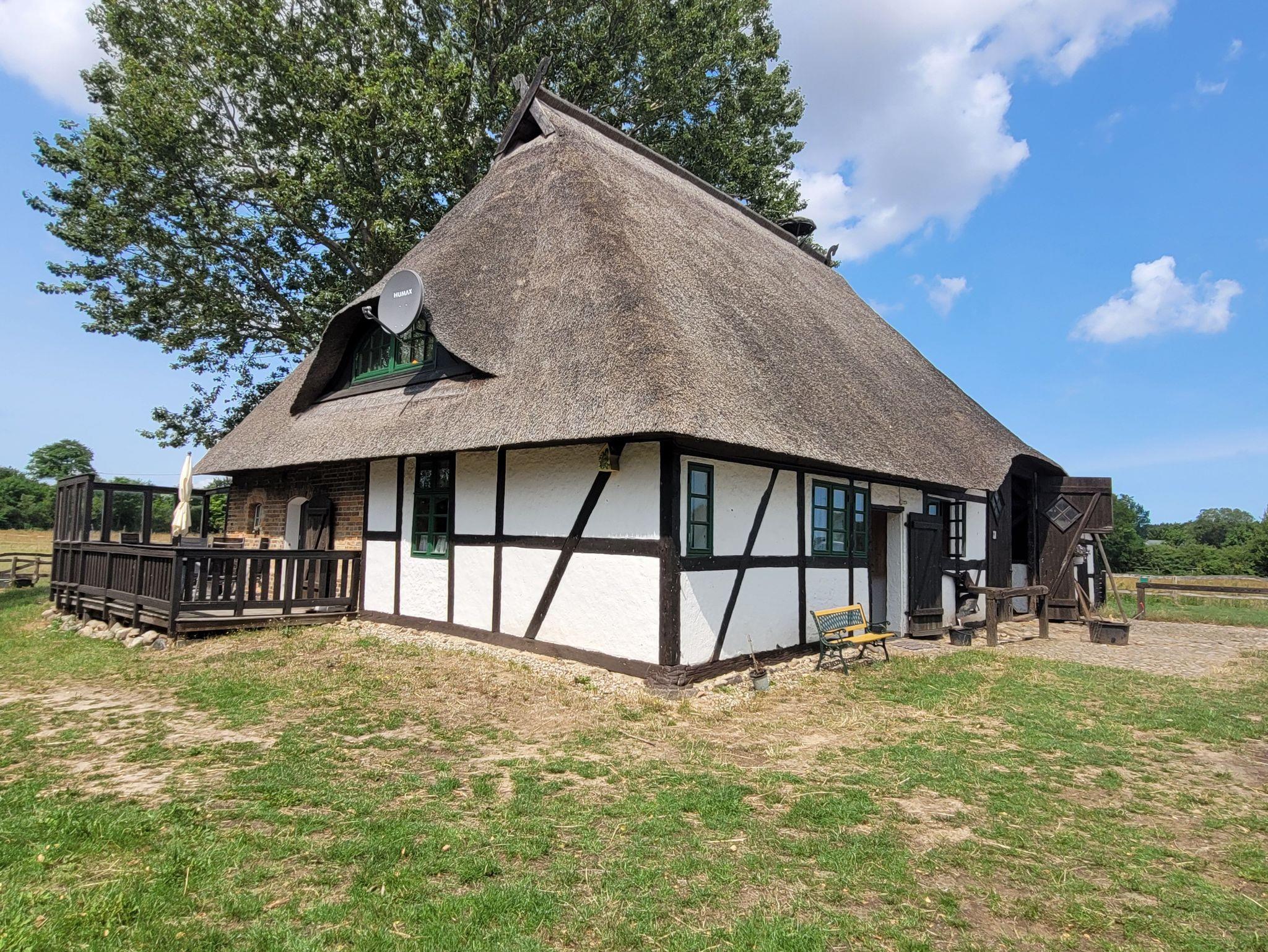 Historischer Bauernhof mit reetgedeckten Gebäuden und moderner Ausstattung an der Ostseeküste.