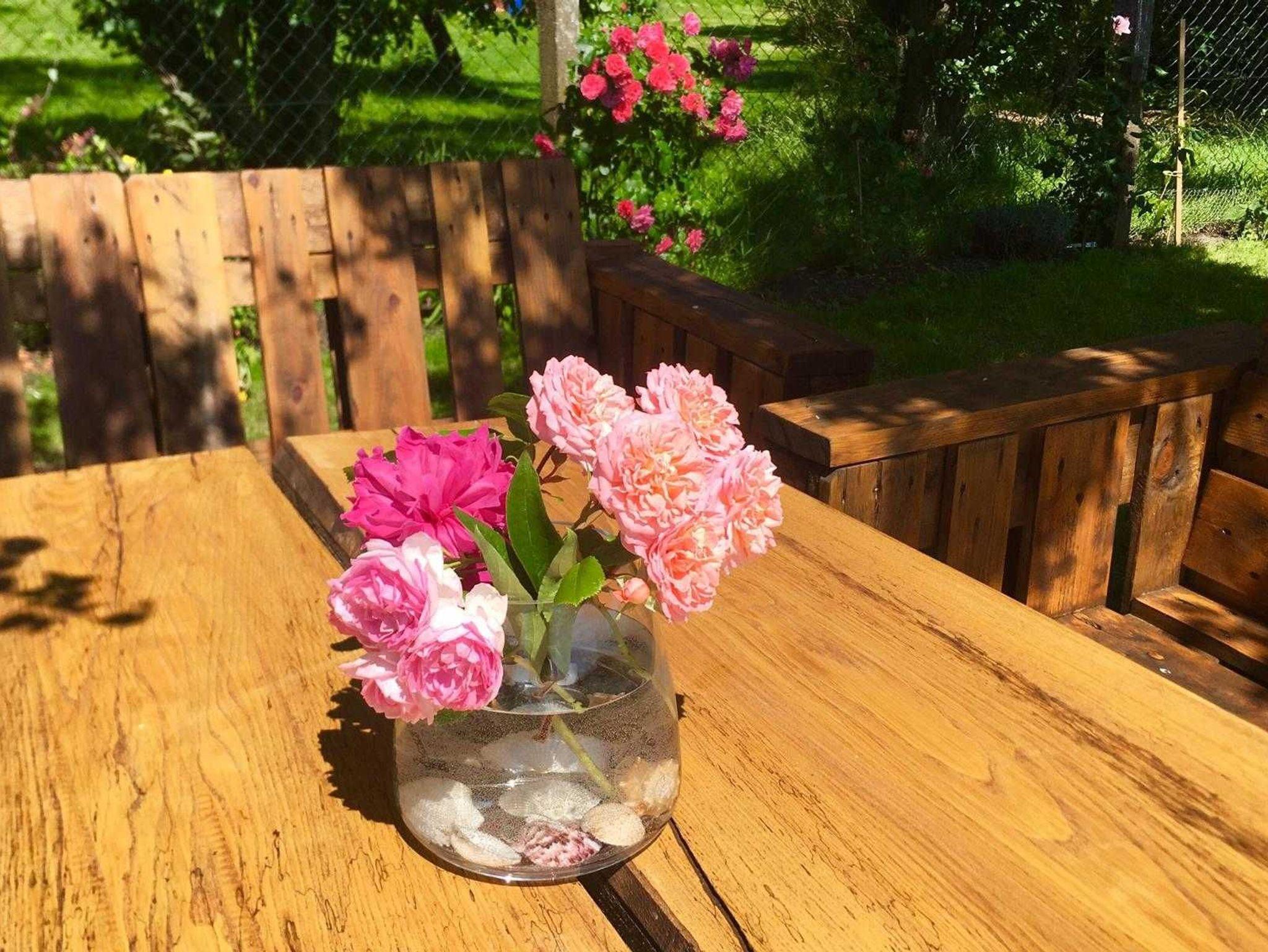 Im weitläufigen Garten des Landhauses mit alten Obstbäumen, separaten Sitzecken mit Grill und Kinder-Gartenhaus für Kinder findet sich genug Raum für Entspannung und Spiel.