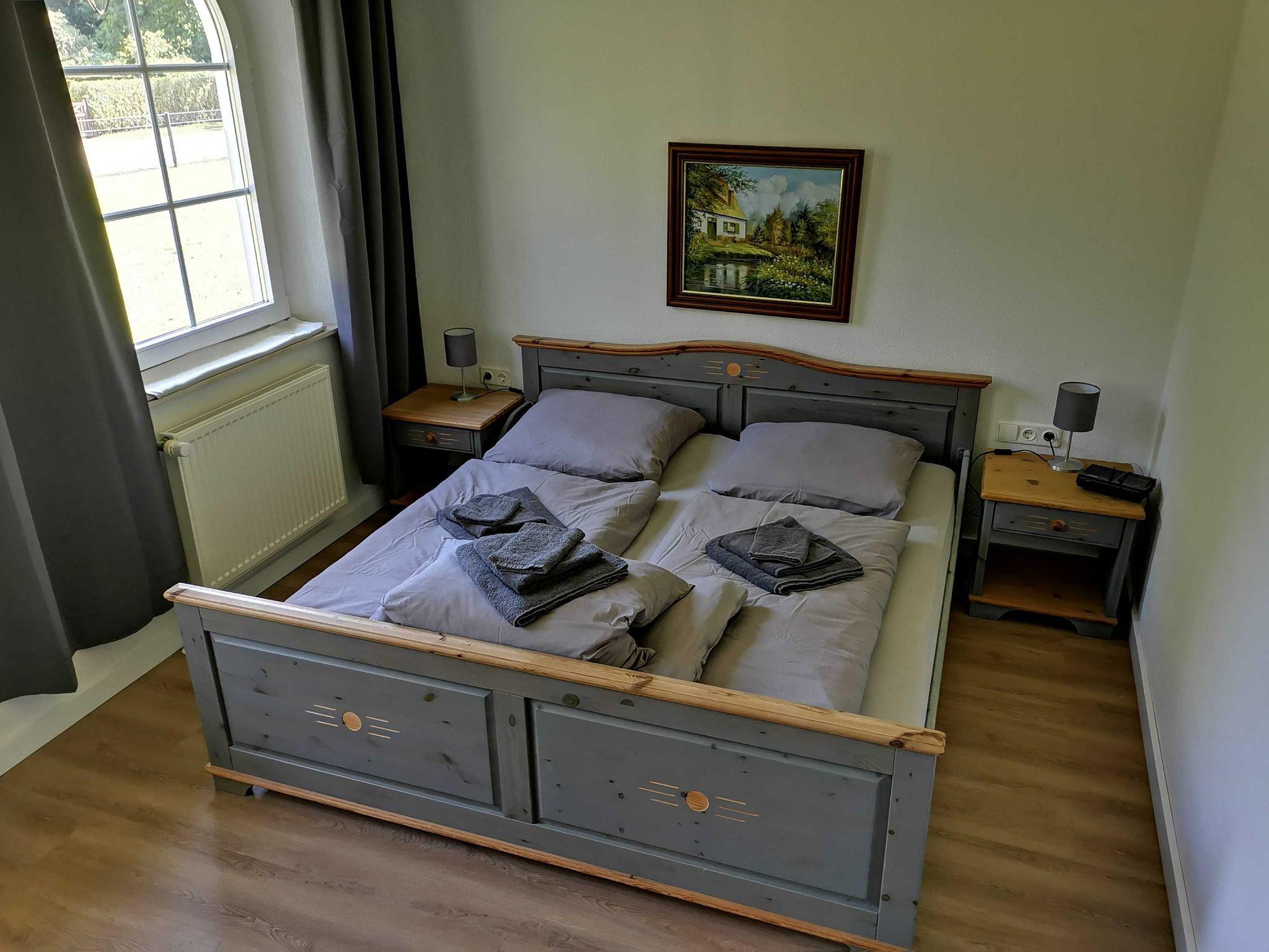(mit getrennten Matratzen) in der Größe 1,80 x 2,00m, Nachttischen, sowie einem geräumigen Kleiderschrank
