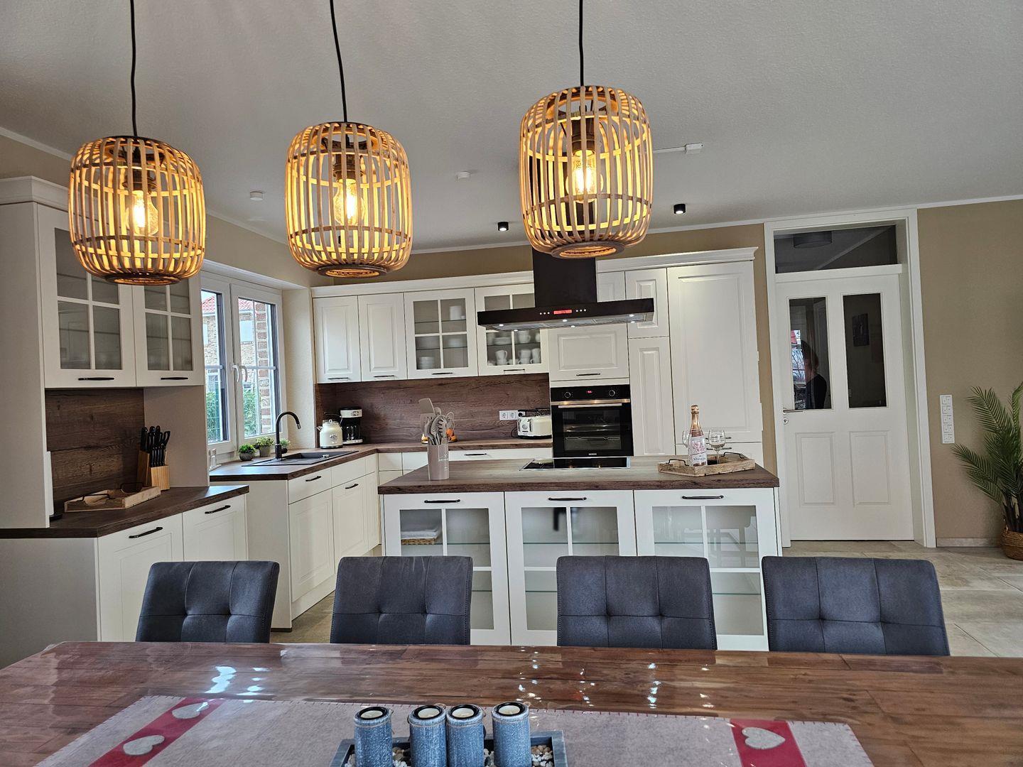 In der offenen Küche, die nahtlos ins Wohnzimmer übergeht, findet jeder Hobbykoch seine Freude. Sie ist voll ausgestattet mit modernen Geräten wie einem Herd, Kühlschrank, Spülmaschine, Mikrowelle und einer Kaffeemaschine. Das gemeinsame Kochen und Essen wird hier zum Highlight Ihres Aufenthalts. Der großzügige Essbereich und das gemütliche Wohnzimmer mit Sofaecke laden zum Verweilen ein und bieten ausreichend Platz für gesellige Abende.