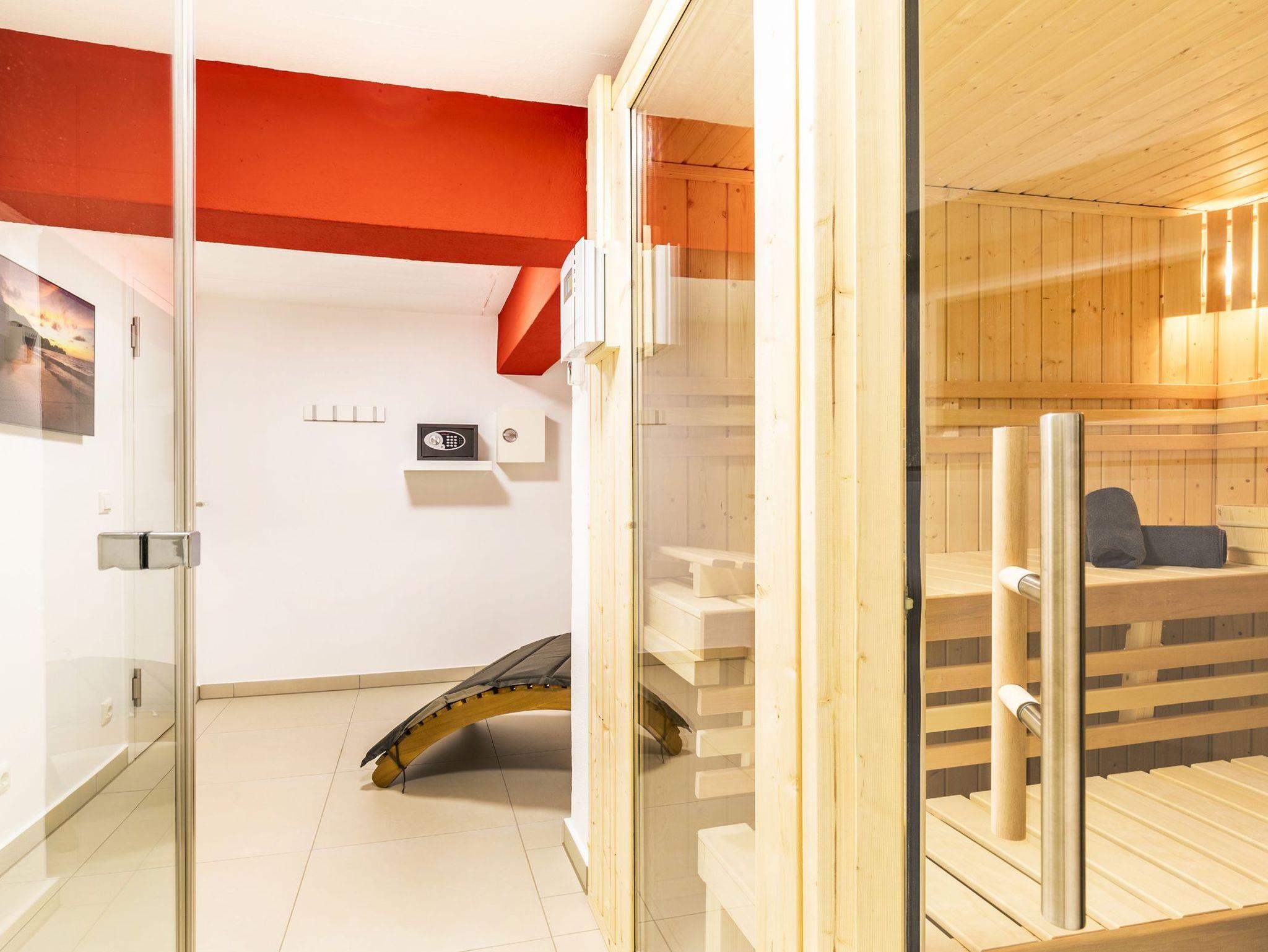 Im Kellergeschoss gibt es eine private Sauna, einen Relax-Liegestuhl und eine zusätzliche Dusche. Außerdem steht eine Waschmaschine zur Verfügung.