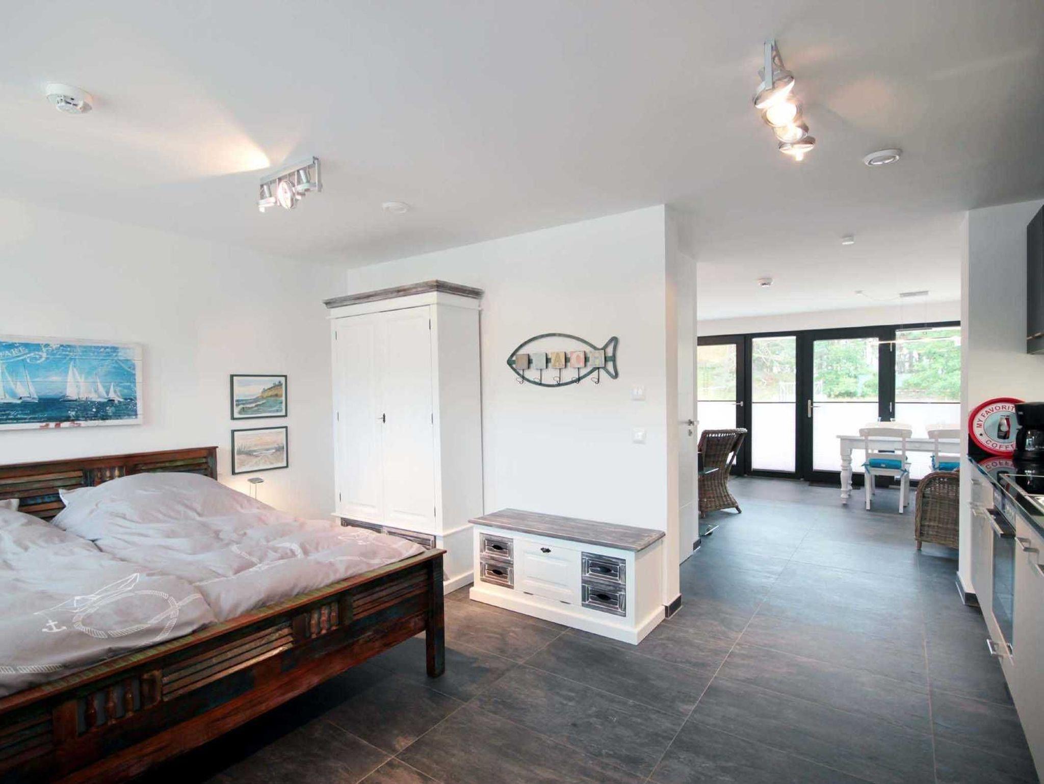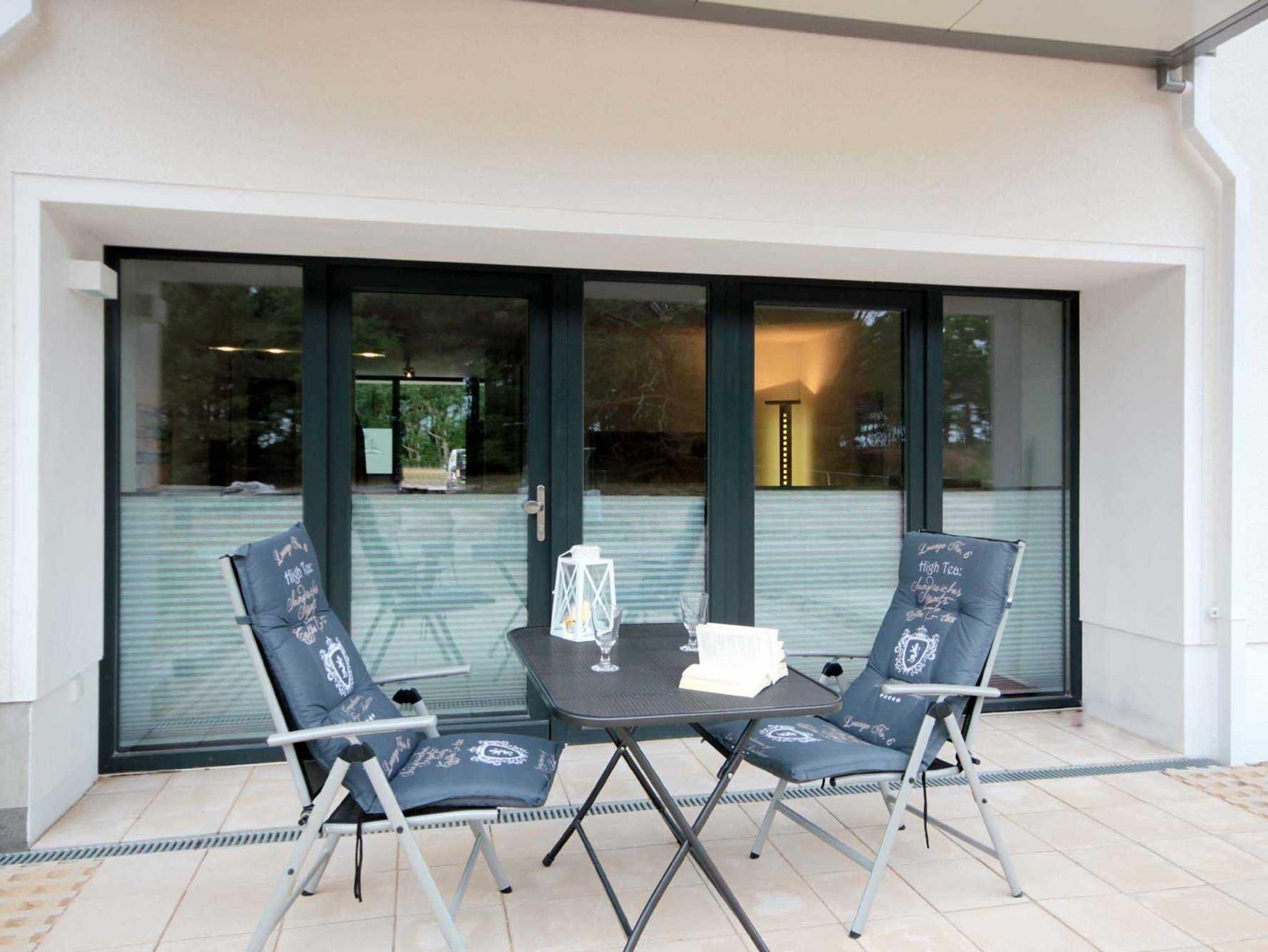Modernes Studio-Appartement in Binz mit zwei Terrassen und Blick auf Kiefernwald und Ostseedünen, ideal für 2 Personen.