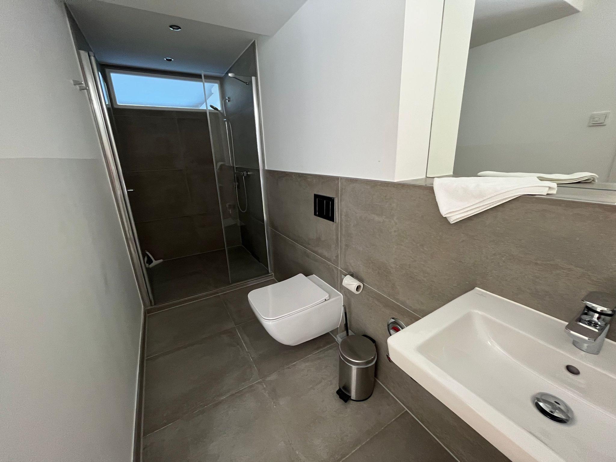 Sie besteht aus 1 großem Wohn- und Eßbereich mit integrierter Küche, 2 separaten Schlafzimmern, 1 großen Duschbad, sowie einem zweiten Bad mit WC, mit eigener Terrasse und eigenem Balkon mit Meerblick.