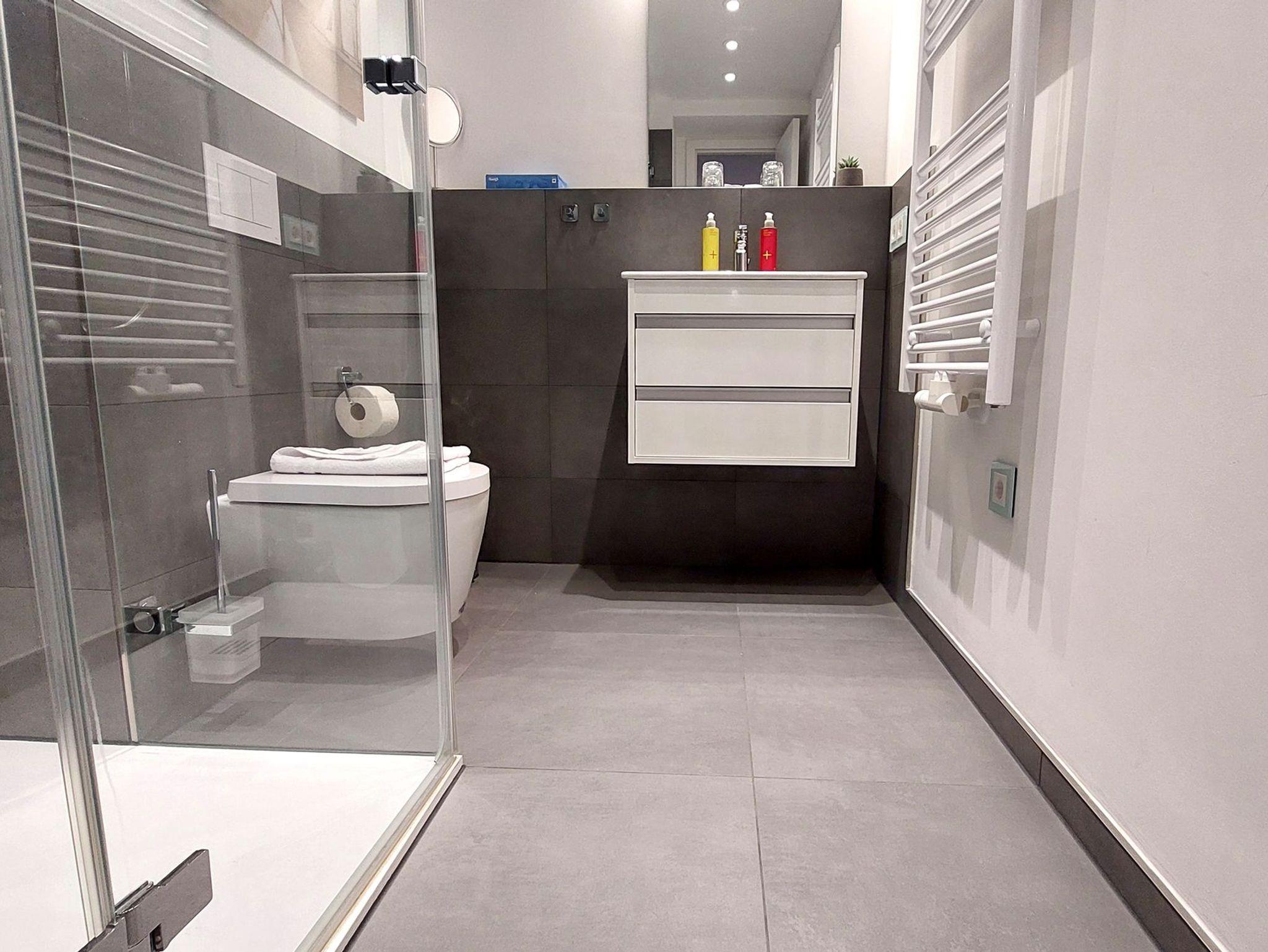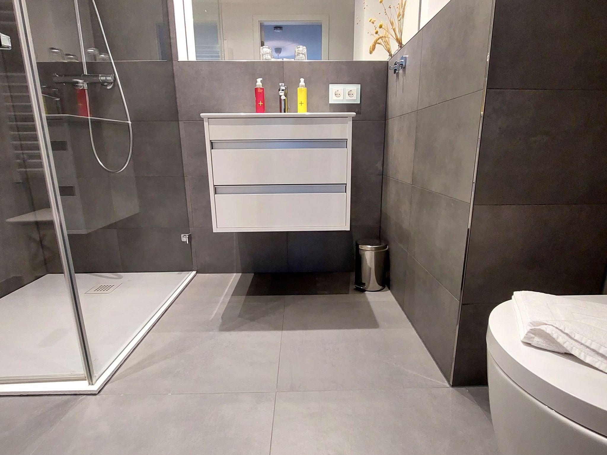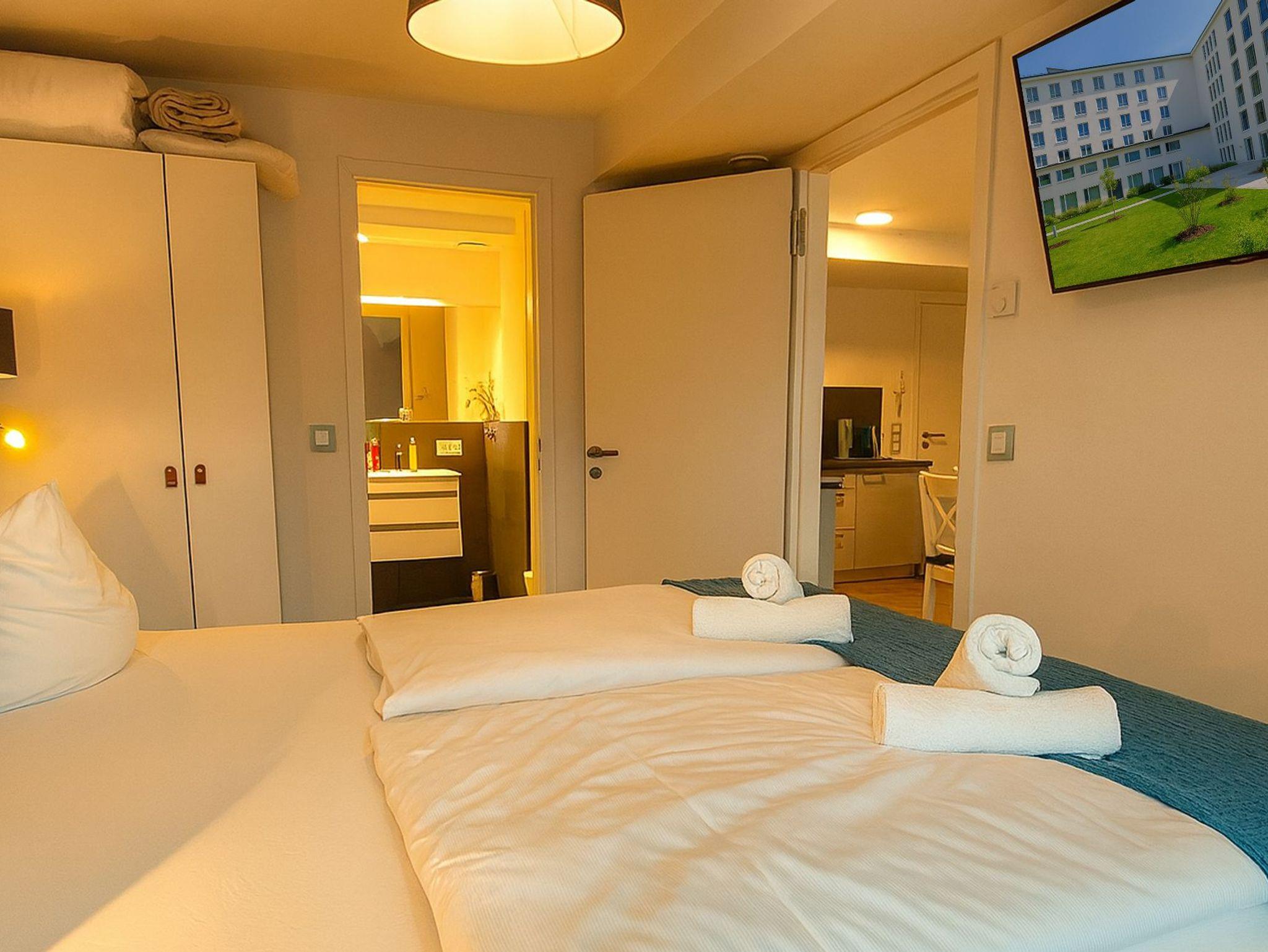 Die Wohnung verfügt über 2 vollwertige Schlafzimmer, jeweils mit einem Doppelbett, Kleiderschrank und eigenem Fernseher. Eines der Schlafzimmer hat außerdem ein eigenes Badezimmer (Bad en Suite). Das zweite Badezimmer ist ebenfalls ausgestattet mit WC, Waschtisch und ebenerdiger Dusche.