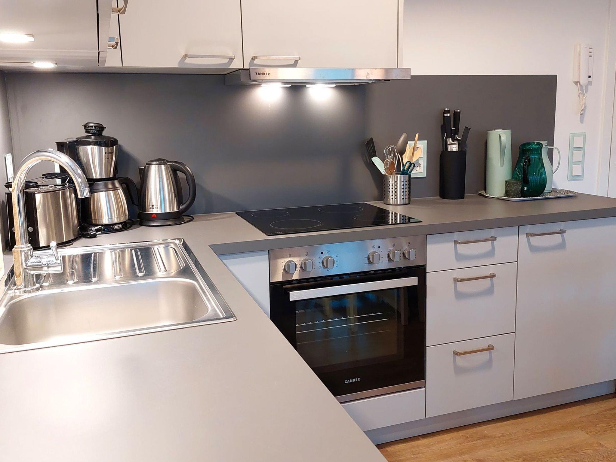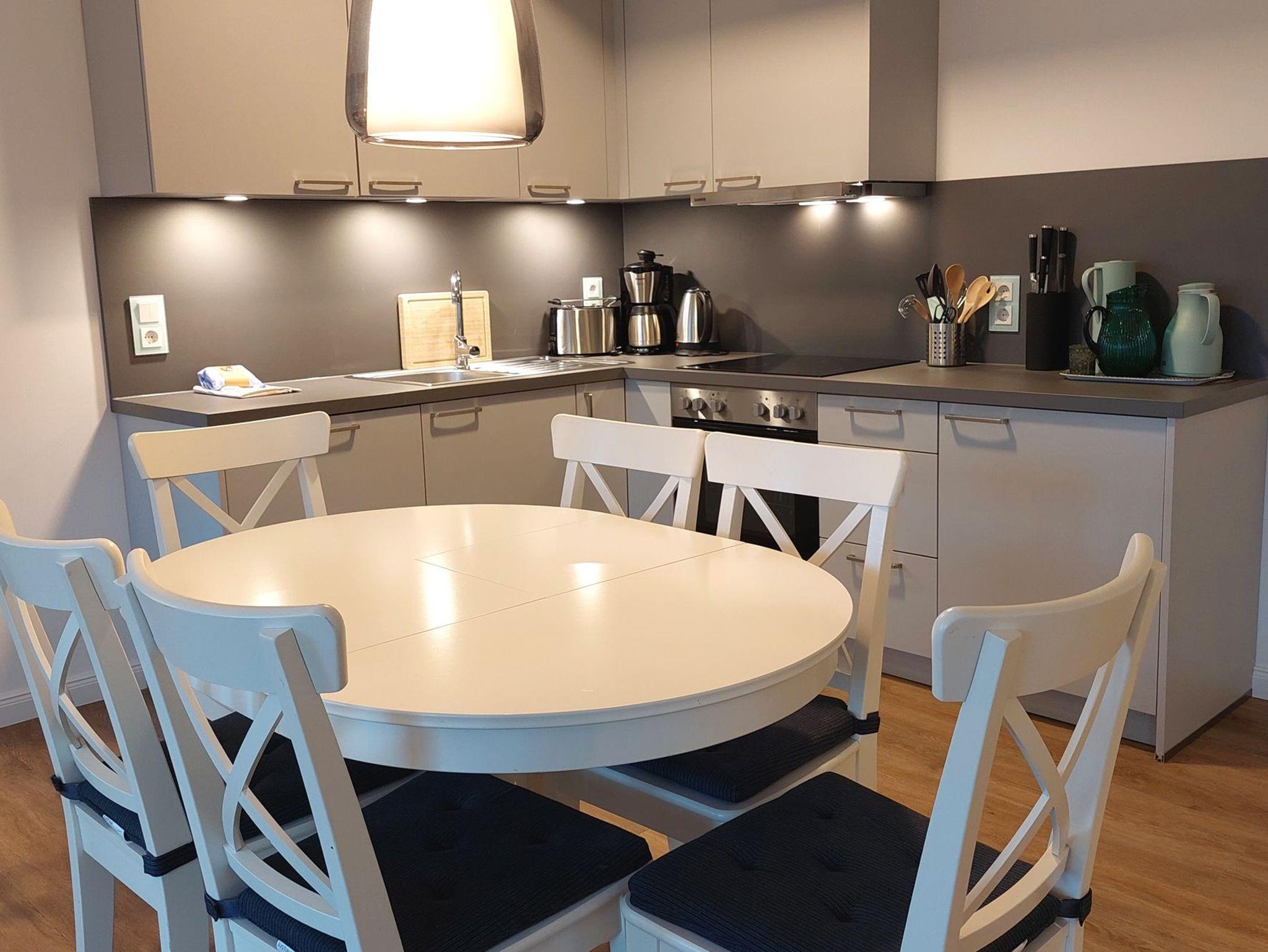 Die moderne Einbauküche ist komplett ausgestattet mit einem Geschirrspüler, einem Kühlschrank mit Gefrierfach, einem Cerankochfeld, einem Toaster, einer Kaffeemaschine und einem Wasserkocher.