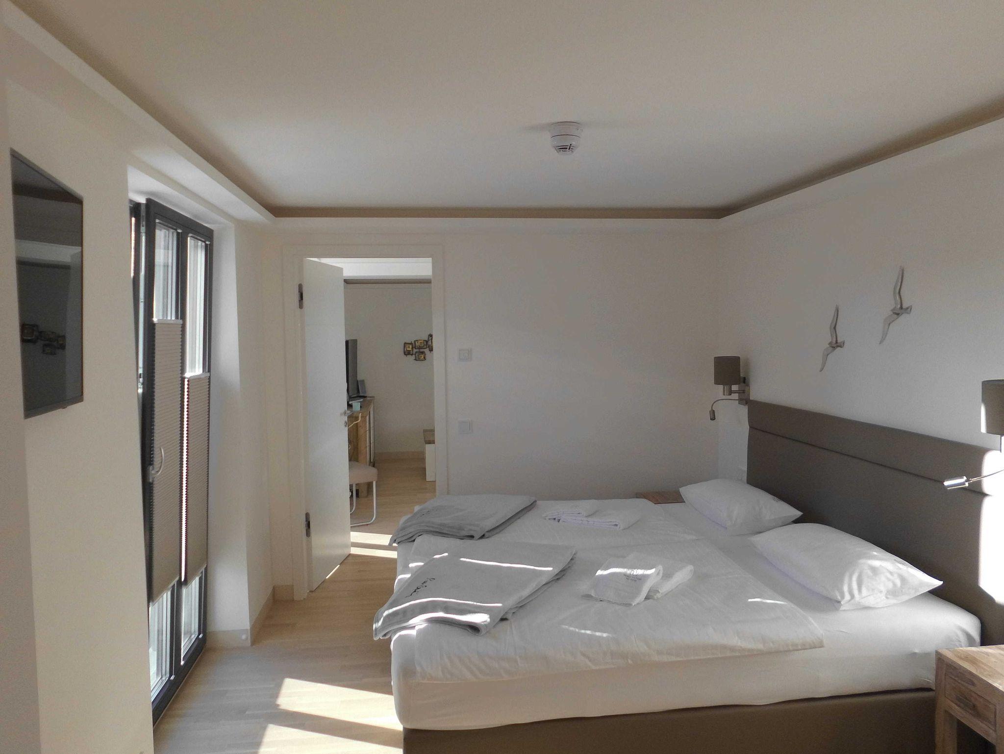 Die helle und sonnige Gardensuite liegt im Seitenflügel des denkmalgeschützten, komplett sanierten Gebäudes. Sie ist eine der ganz wenigen Wohnungen mit Fenstern zu allen drei Seiten. Der traumhafte Strand liegt direkt vor der Tür.