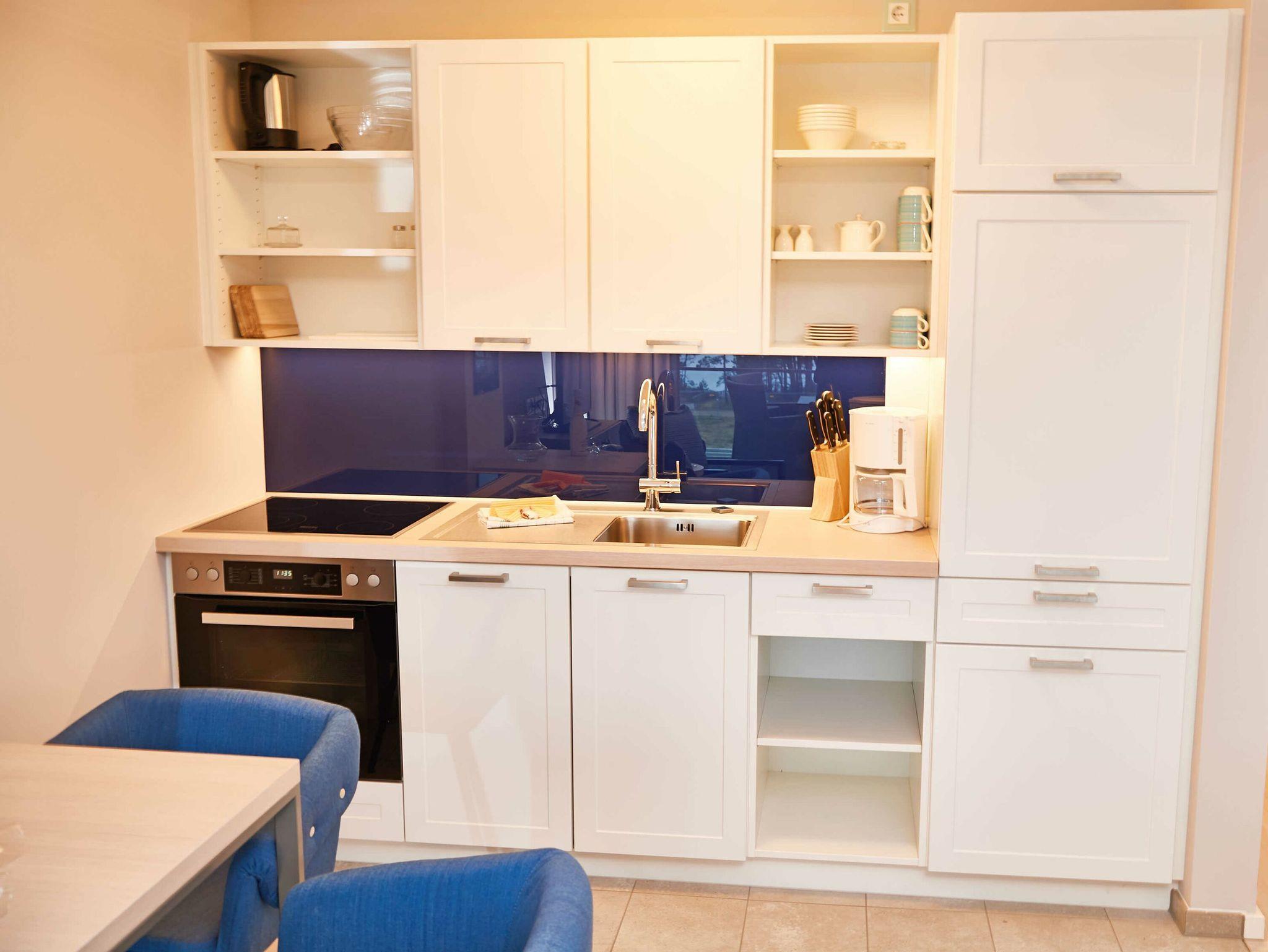 Die Wohnung verfügt über einen modern ausgestatteten Wohn-/Essbereich mit kleiner Sitzecke, einem Flachbild-TV, einem Radio mit USB-Anschluss, Bluetooth und Internet sowie einem komfortablen Boxpringbett (1,80 x 2,00 m). Vom großen Balkon und sogar vom Bett aus können Sie die Weite der Ostsee genießen. Die Balkonmöbel stehen saisonal - in der Regel von Mai bis Ende September - zur Verfügung.