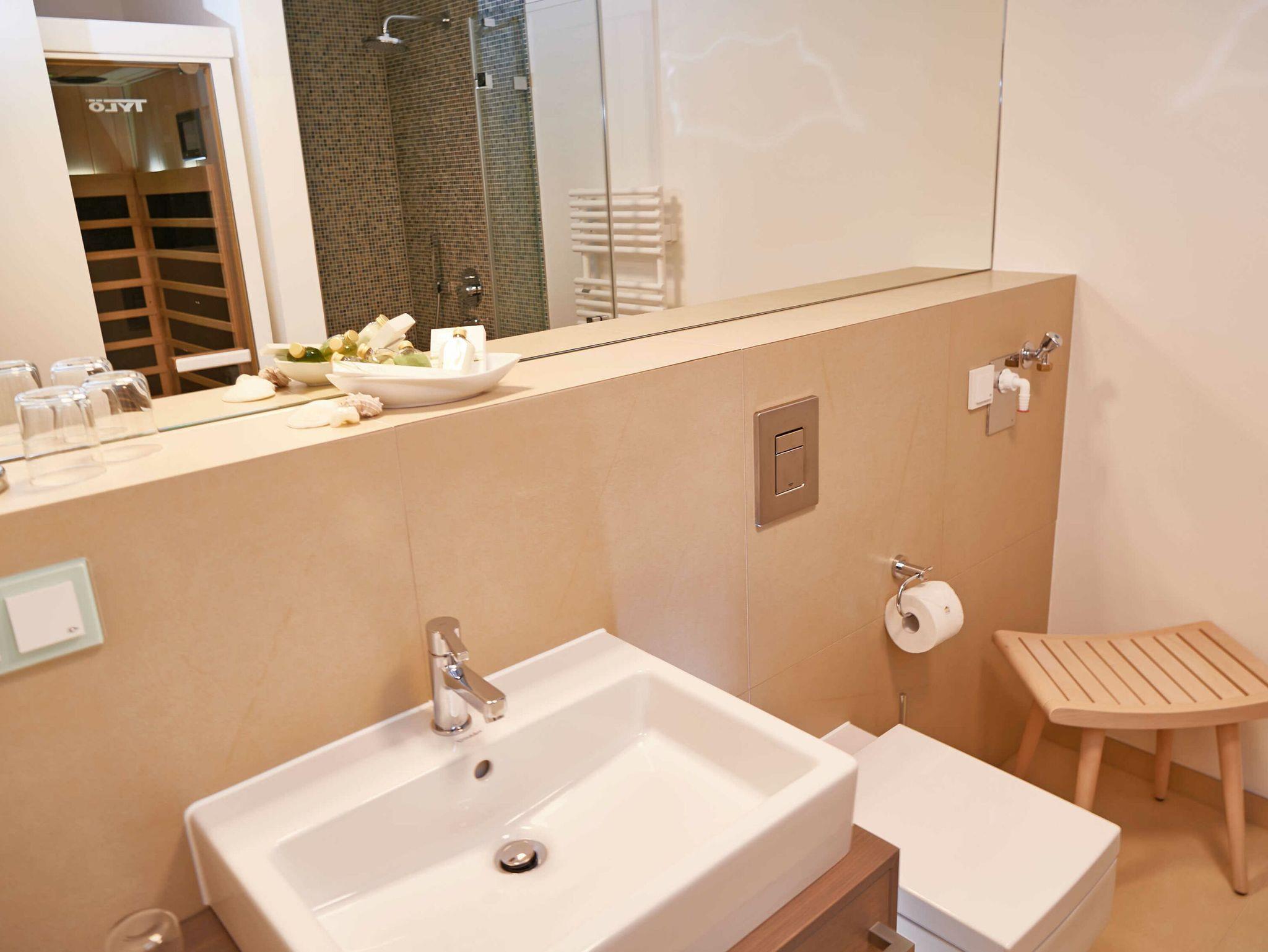 Die Wohnung verfügt weiterhin über ein modern gefliestes Badezimmer mit bodengleicher Dusche sowie eine Infrarotkabine der Marke Tylö für zwei Personen.