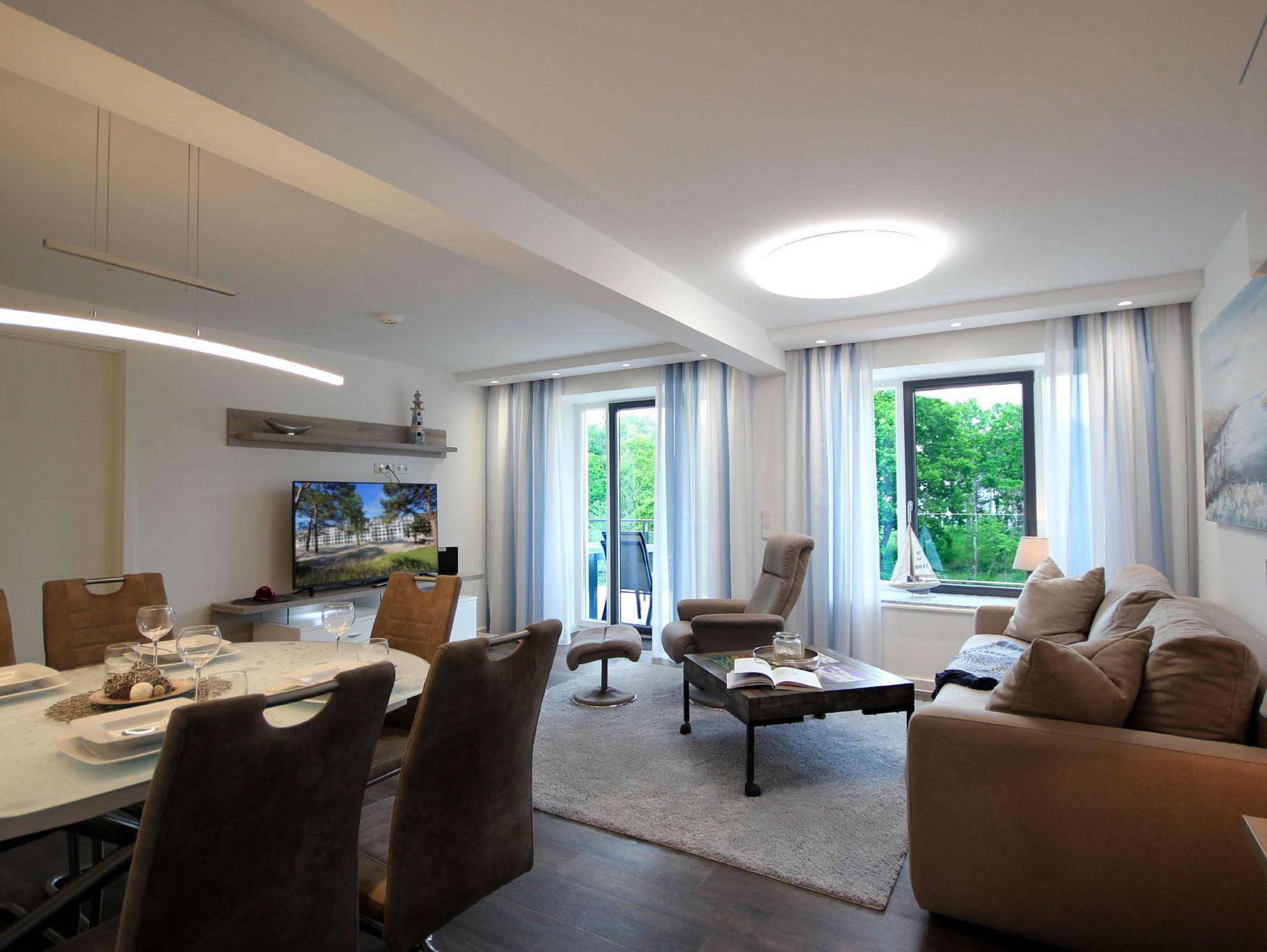 Moderne 3-Raumwohnung in Binz mit Balkon, Blick auf Kiefernwald und Ostseedünen für erholsamen Urlaub.