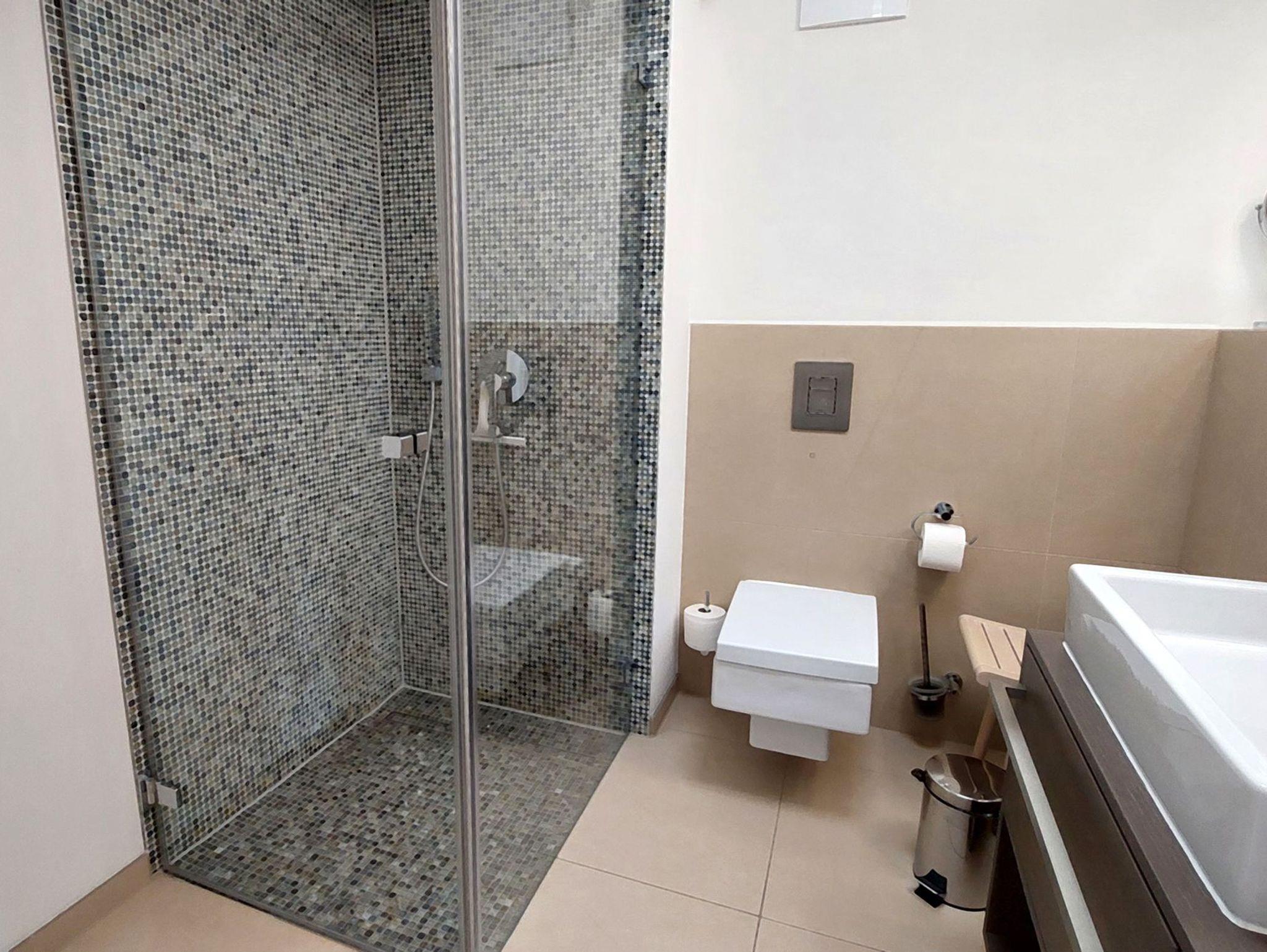 Das Badezimmer verfügt über WC, Waschtisch und großer ebenerdiger Dusche.