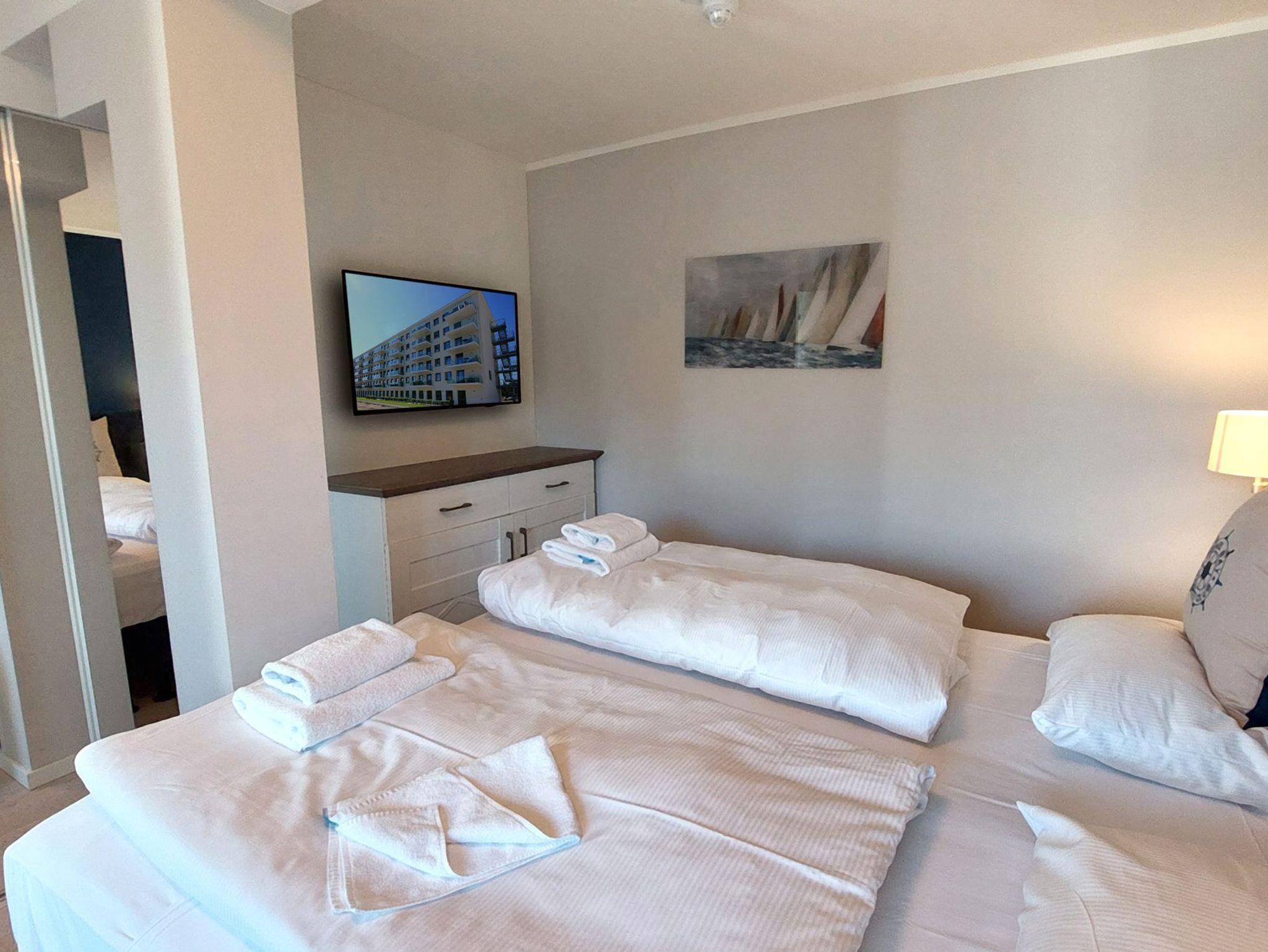 Im Schlafzimmer befindet sich ein Doppelbett, ein Kleiderschrank und ein zusätzlicher Flachbild-TV.