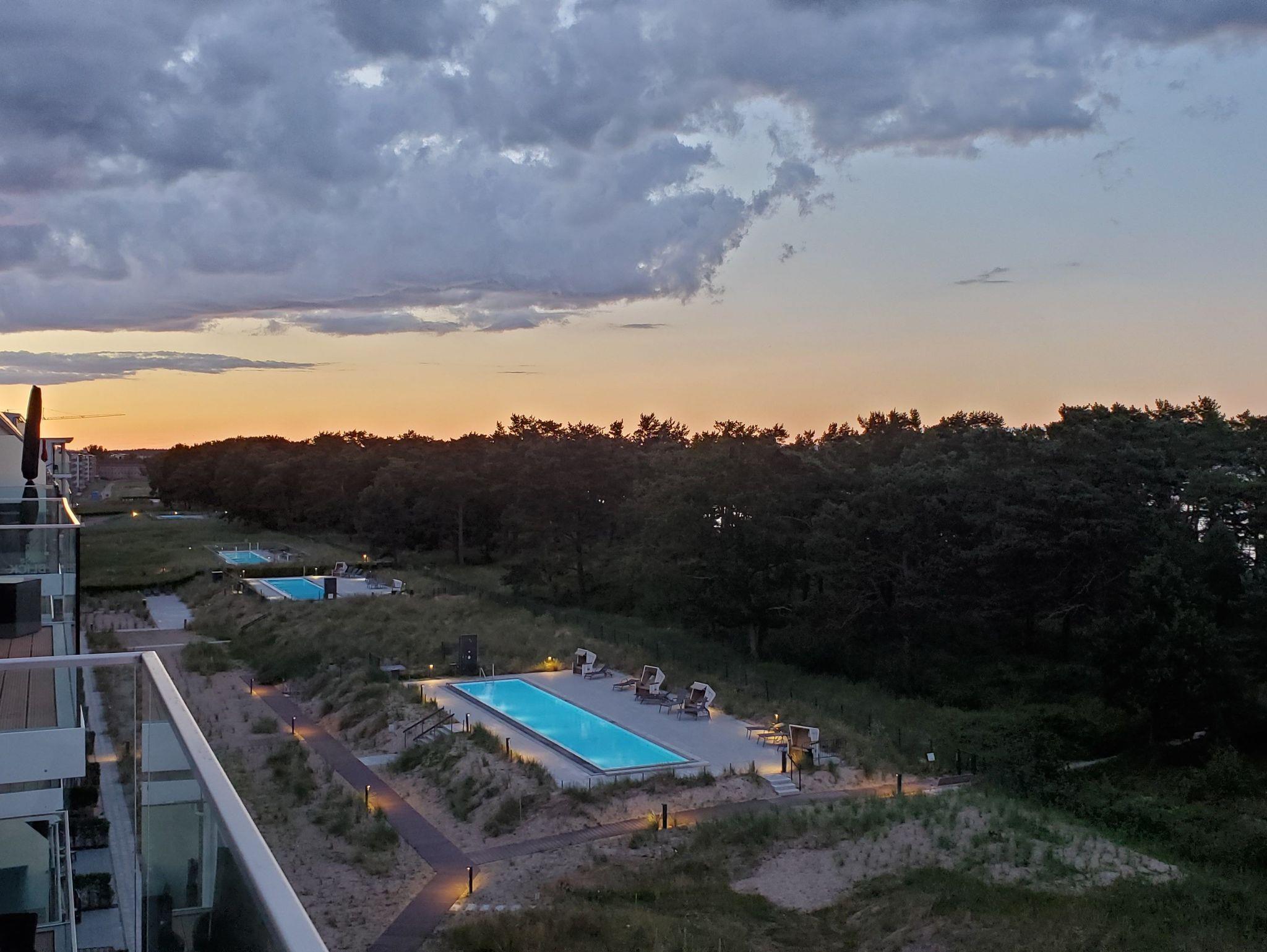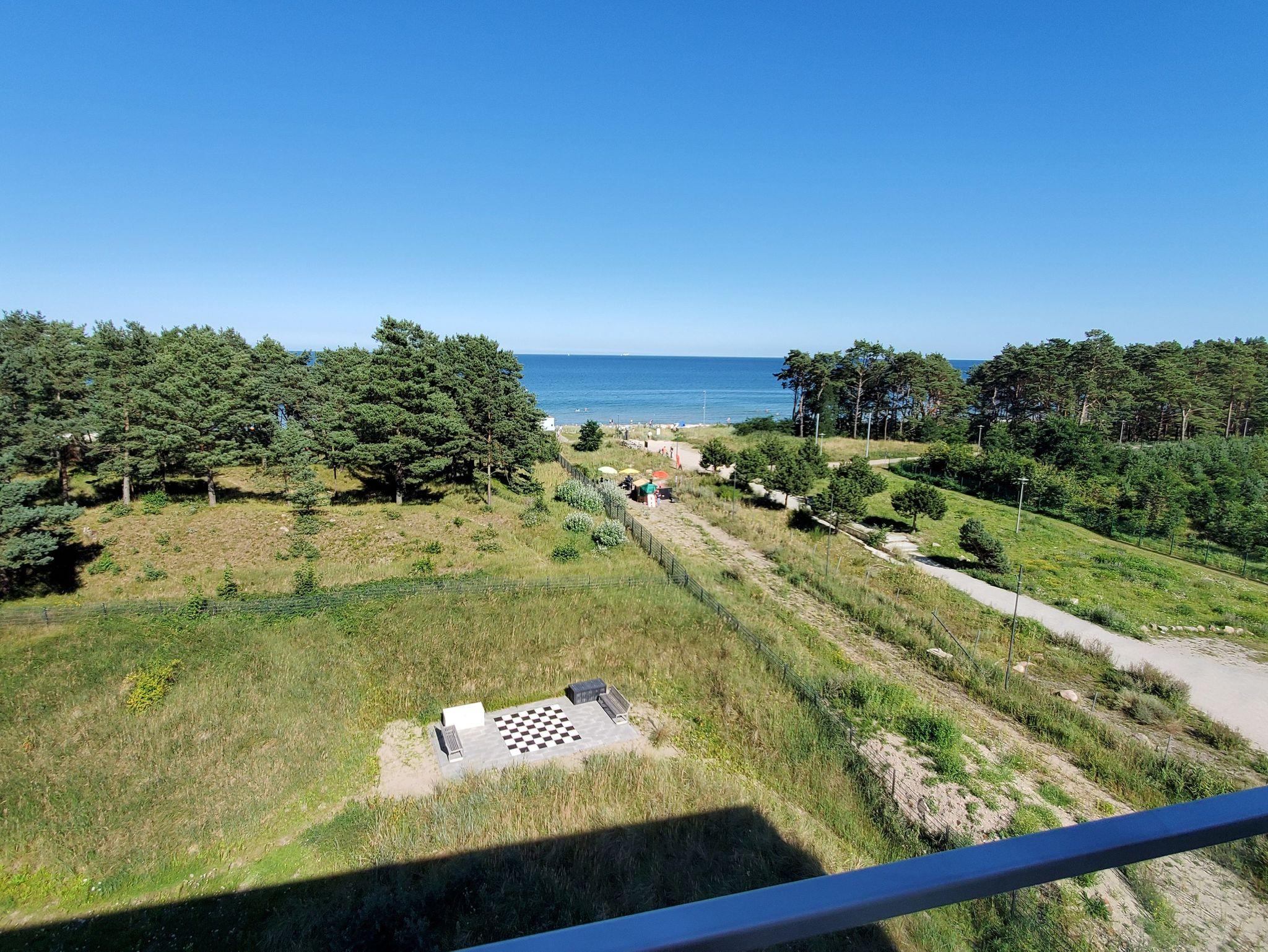 Die exklusive, hochwertig eingerichtete Ferienwohnung ganz oben im 5.OG mit unverbautem, herrlichen Blick auf die Ostsee befindet sich direkt am feinsandigen, kilometerweiten Ostseestrand inmitten einer privaten Ferienanlage. Grillplatz, Außenpool und Liegeplätzen, begrünt mit einheimischer Flora und Fauna, können Sie von oben, von Ihrem eigenen Balkon aus genießen oder exklusiv mit den Gästen der Ferienanlage teilen. Ein privater Strandzugang der Ferienanlage führt Sie durch ein kleines Kiefernwäldchen nach 20 m direkt zum Ostseesand. Ein großzügiger Innenpool mit Kinderbecken sowie eine Saunalandschaft mit Fitnessstudio sind von Ihrer Wohnung aus direkt trockenen Fußes erreichbar. Wenige Schritte führen zu einer Boutique, einem Bäcker, einer Pizzeria, einem Cafe und einem Fischbistro. Zum Ausklingen eines wunderschönen Tages oder für den größeren Hunger befindet sich ein Feinschmeckerrestaurant und eine Bar direkt im Haus.