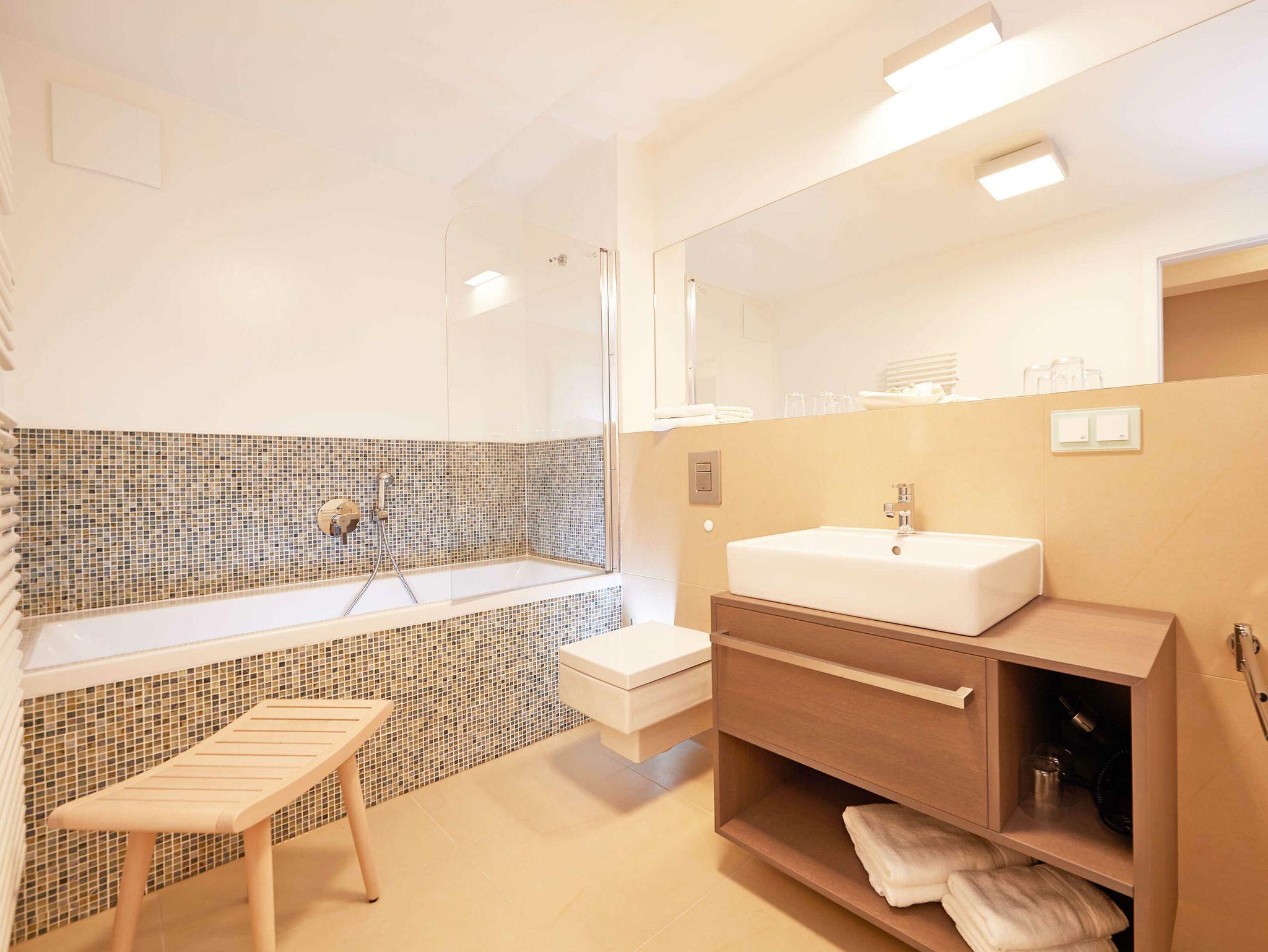 Die Wohnung verfügt weiterhin über ein modern gefliestes Badezimmer mit einer komfortablen Duschbadewanne.