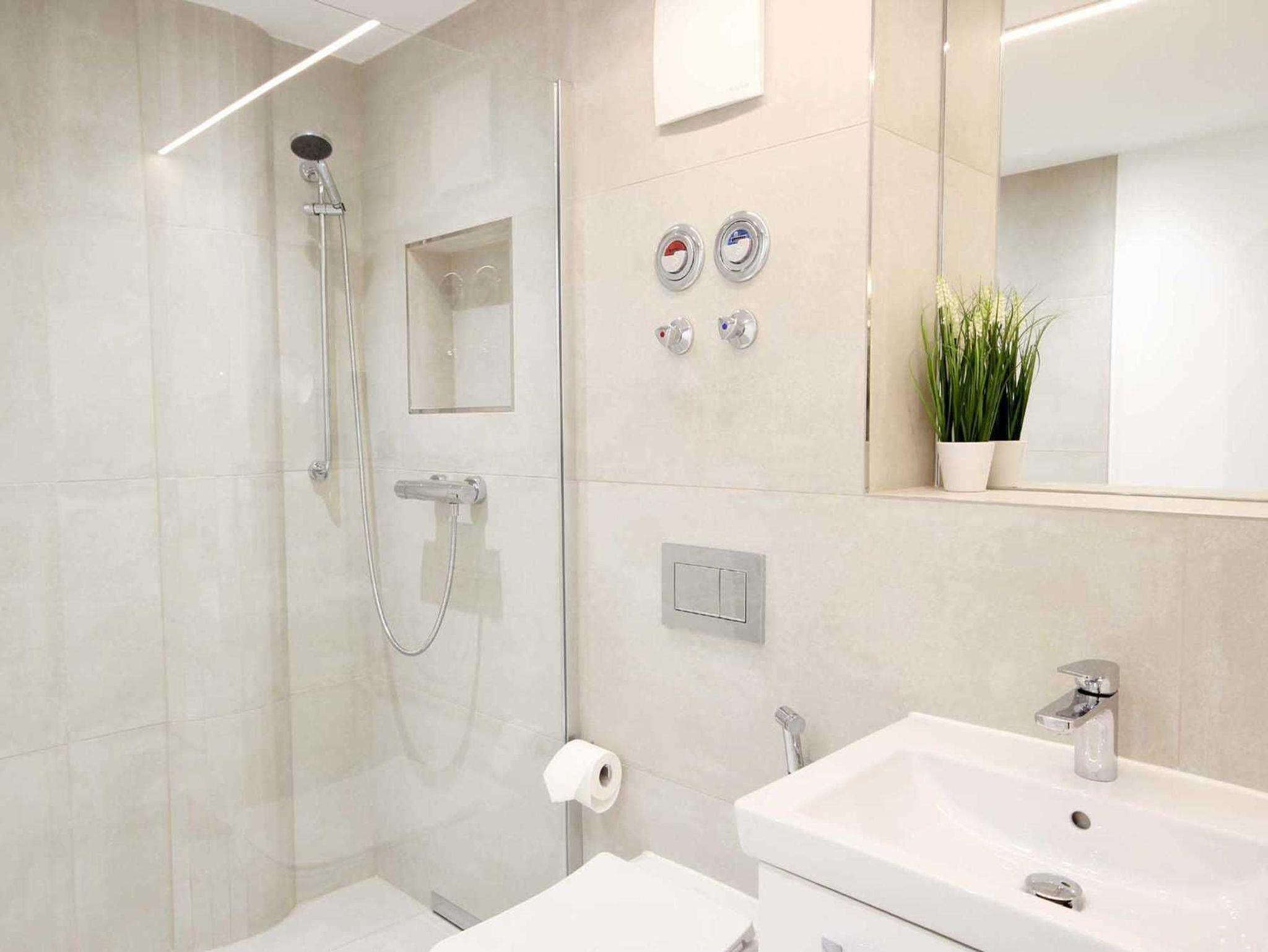 Das hell geflieste Duschbad bietet genügend Abstellflächen für Kosmetika, einen fest integrierten Fön und einen Handtuchheiztrockner.