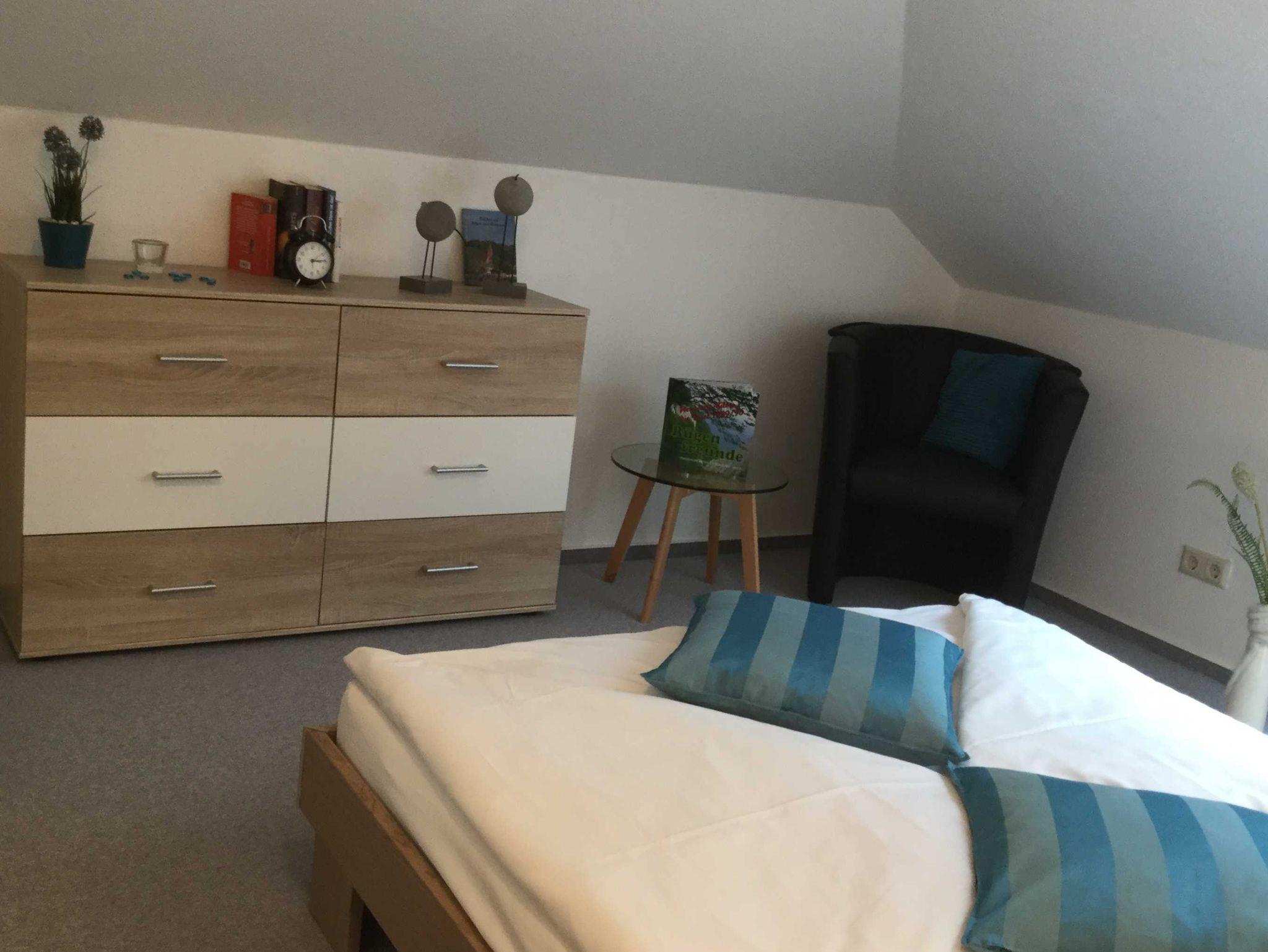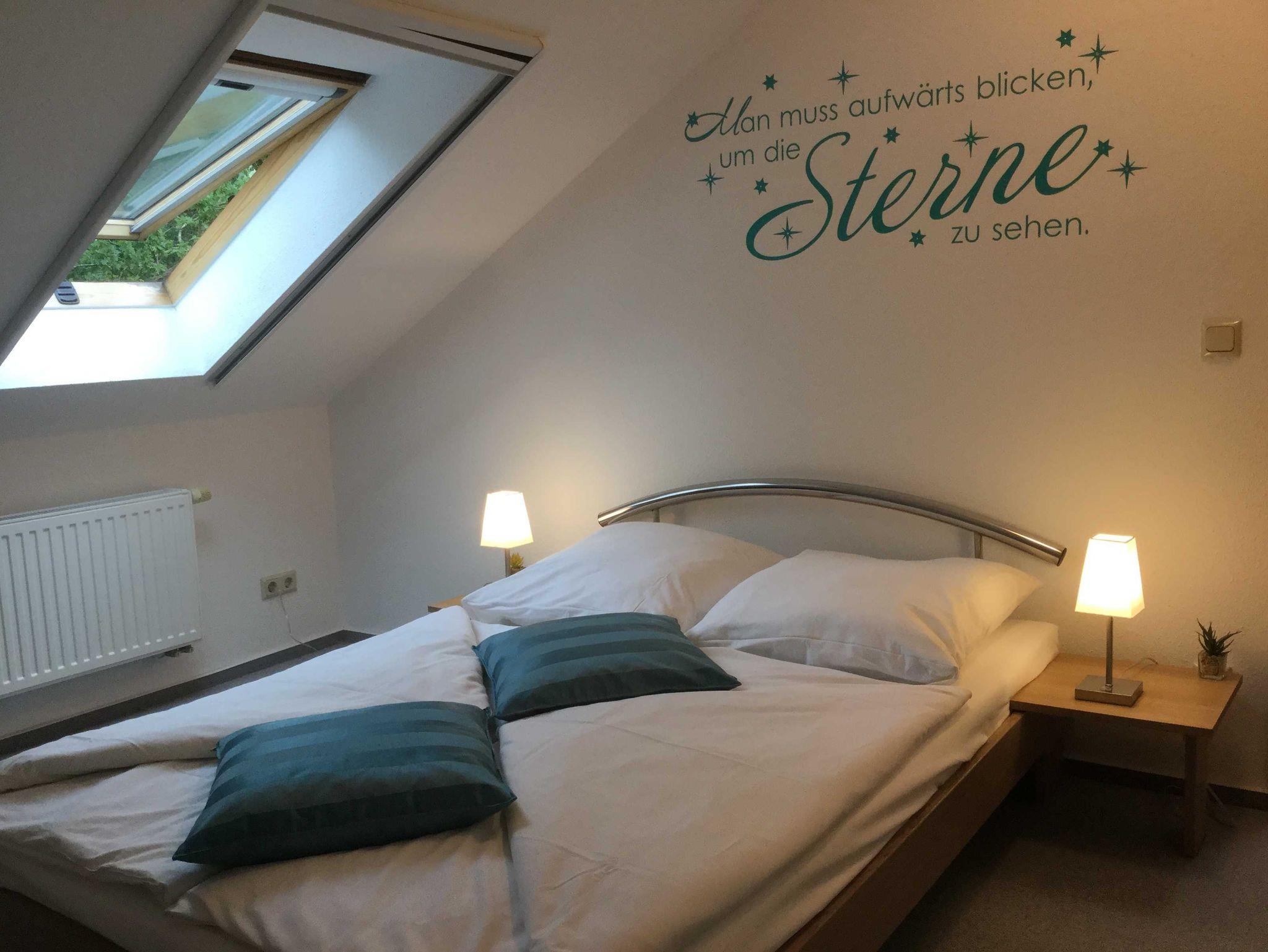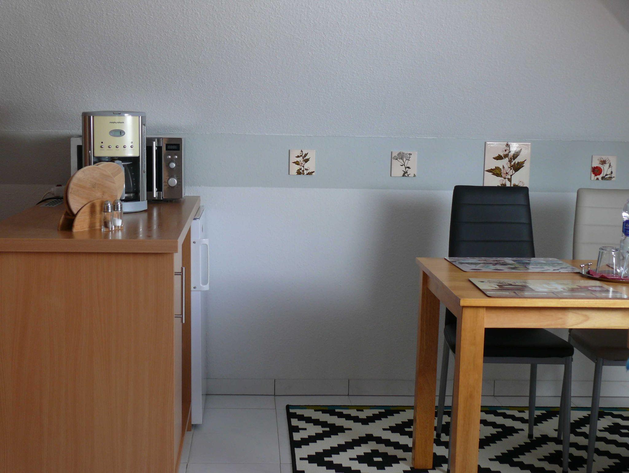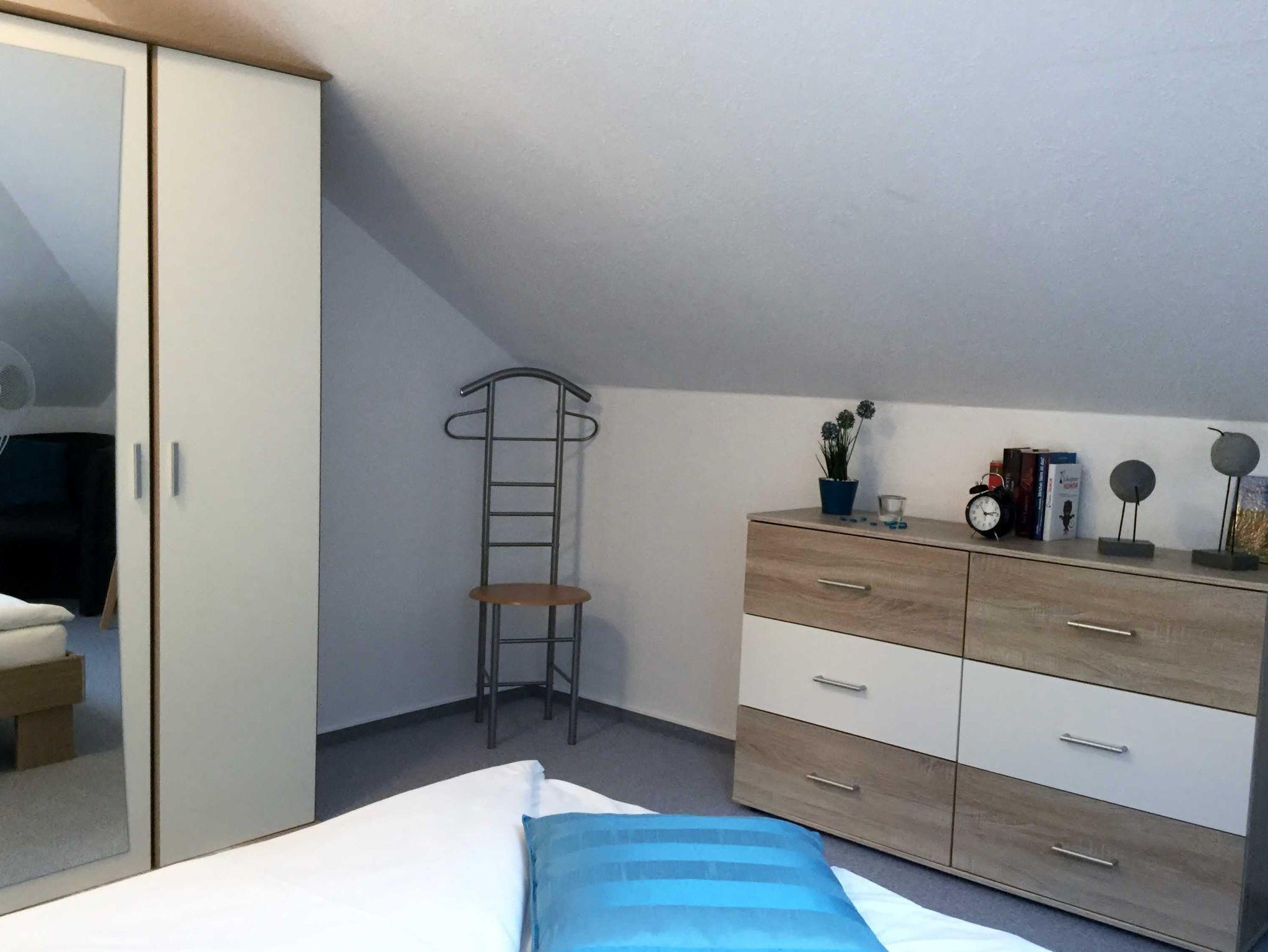 Dachgeschosswohnung 2015 renoviert und neu möbliert; Herbst 2017 Modernisierung des Bades; Herbst 2018 Modernisierung Küche; Herbst 2019 Renovierung Wohnzimmer; Wohnung mit Dachschrägen; moderne Ausstattung; Laminaten/ Teppichboden/ Fliesen; Doppelbett Standardgröße; Wannenbad; Fön, Wasserkocher,Grill, Mikrowelle, Einbauküche, Kühlschrank,TV, DVD-Player, Hochstuhl für Kinder, Kinderreisebett, Bügeleisen, Staubsauger, Radio mit CD Player