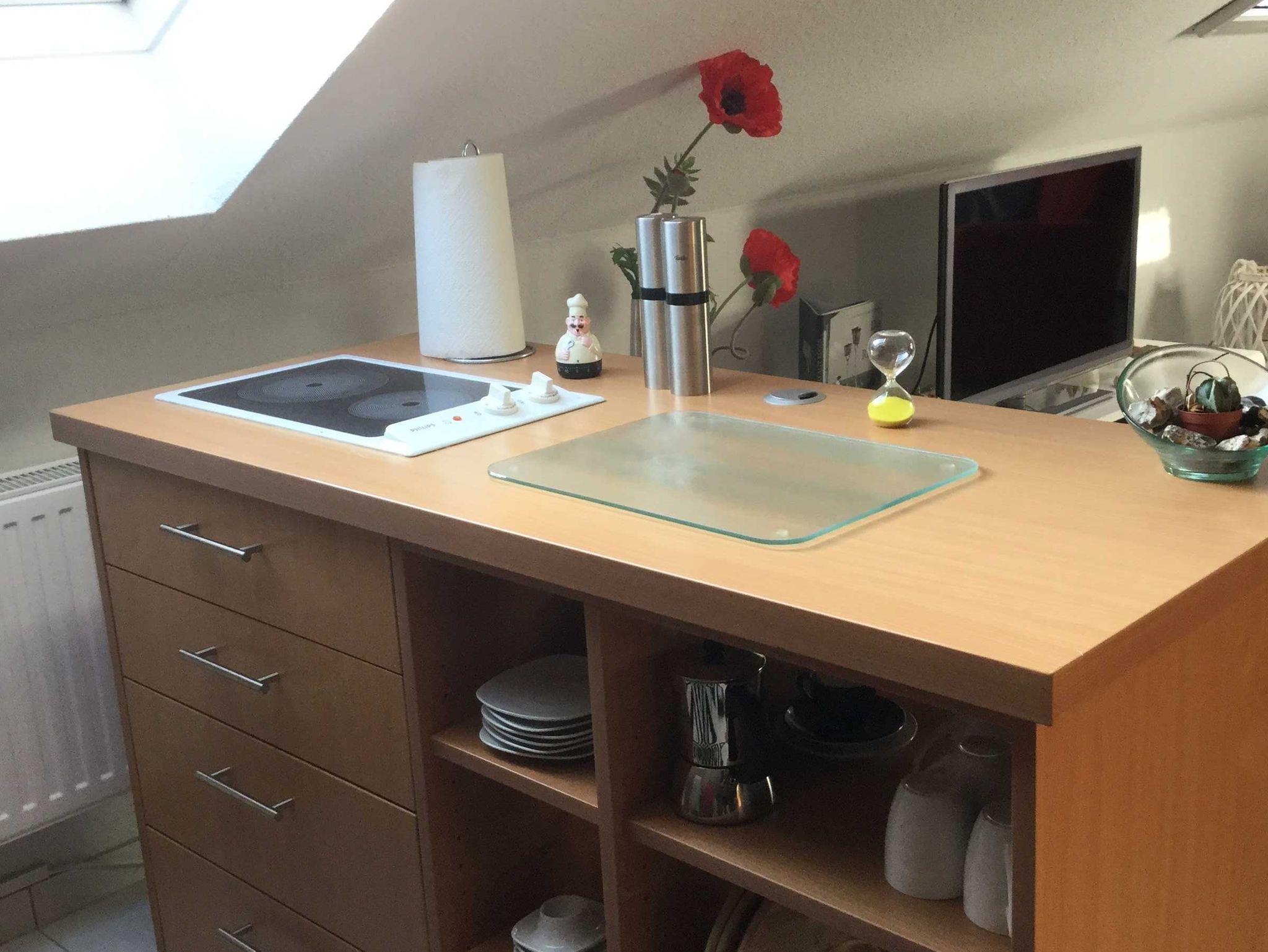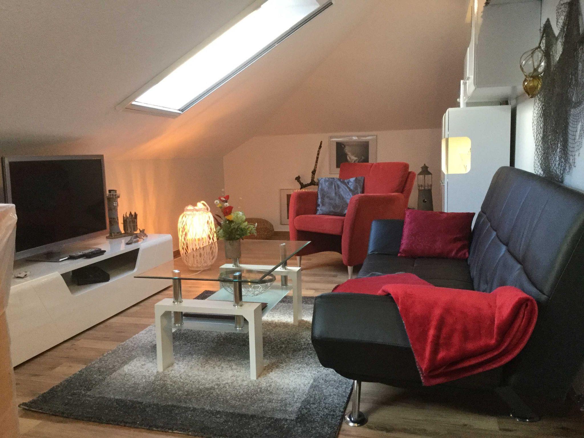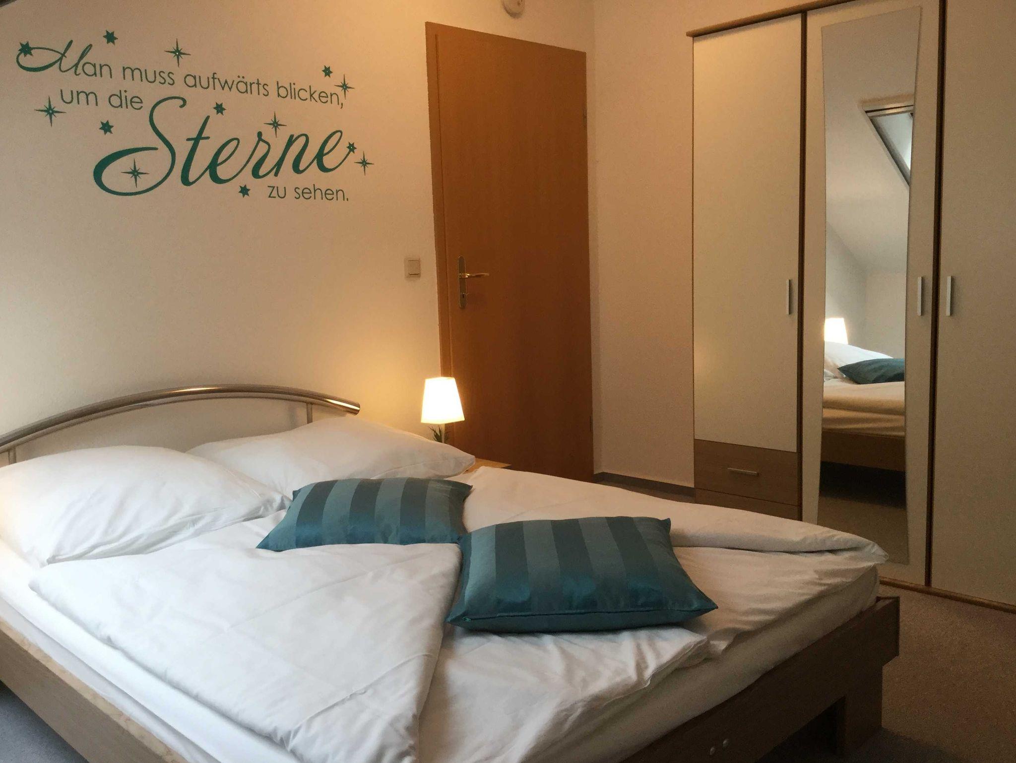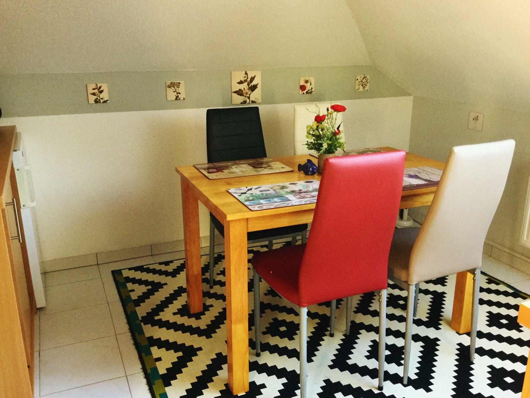Dachgeschosswohnung 2015 renoviert und neu möbliert; Herbst 2017 Modernisierung des Bades; Herbst 2018 Modernisierung Küche; Herbst 2019 Renovierung Wohnzimmer; Wohnung mit Dachschrägen; moderne Ausstattung; Laminaten/ Teppichboden/ Fliesen; Doppelbett Standardgröße; Wannenbad; Fön, Wasserkocher,Grill, Mikrowelle, Einbauküche, Kühlschrank,TV, DVD-Player, Hochstuhl für Kinder, Kinderreisebett, Bügeleisen, Staubsauger, Radio mit CD Player