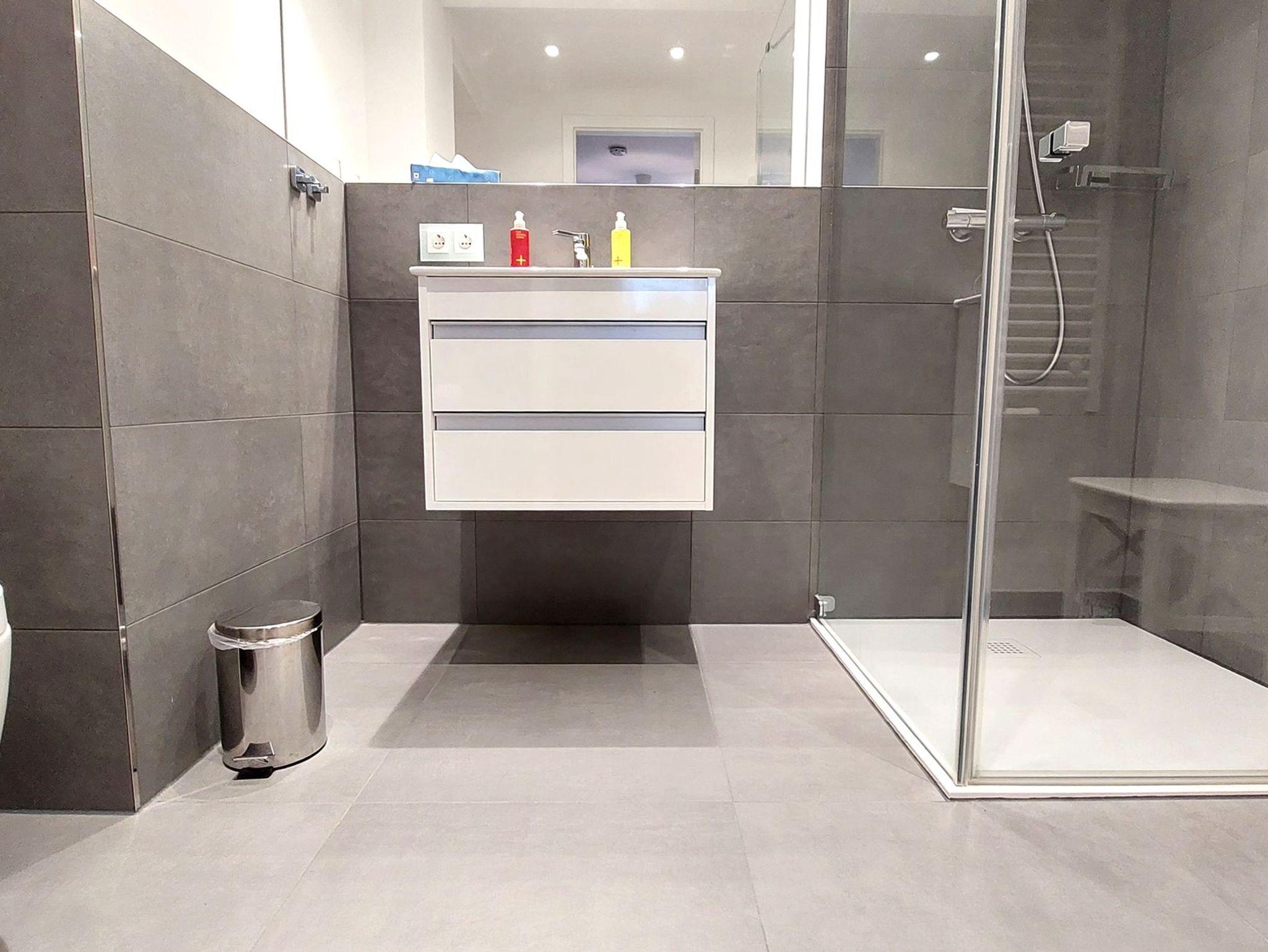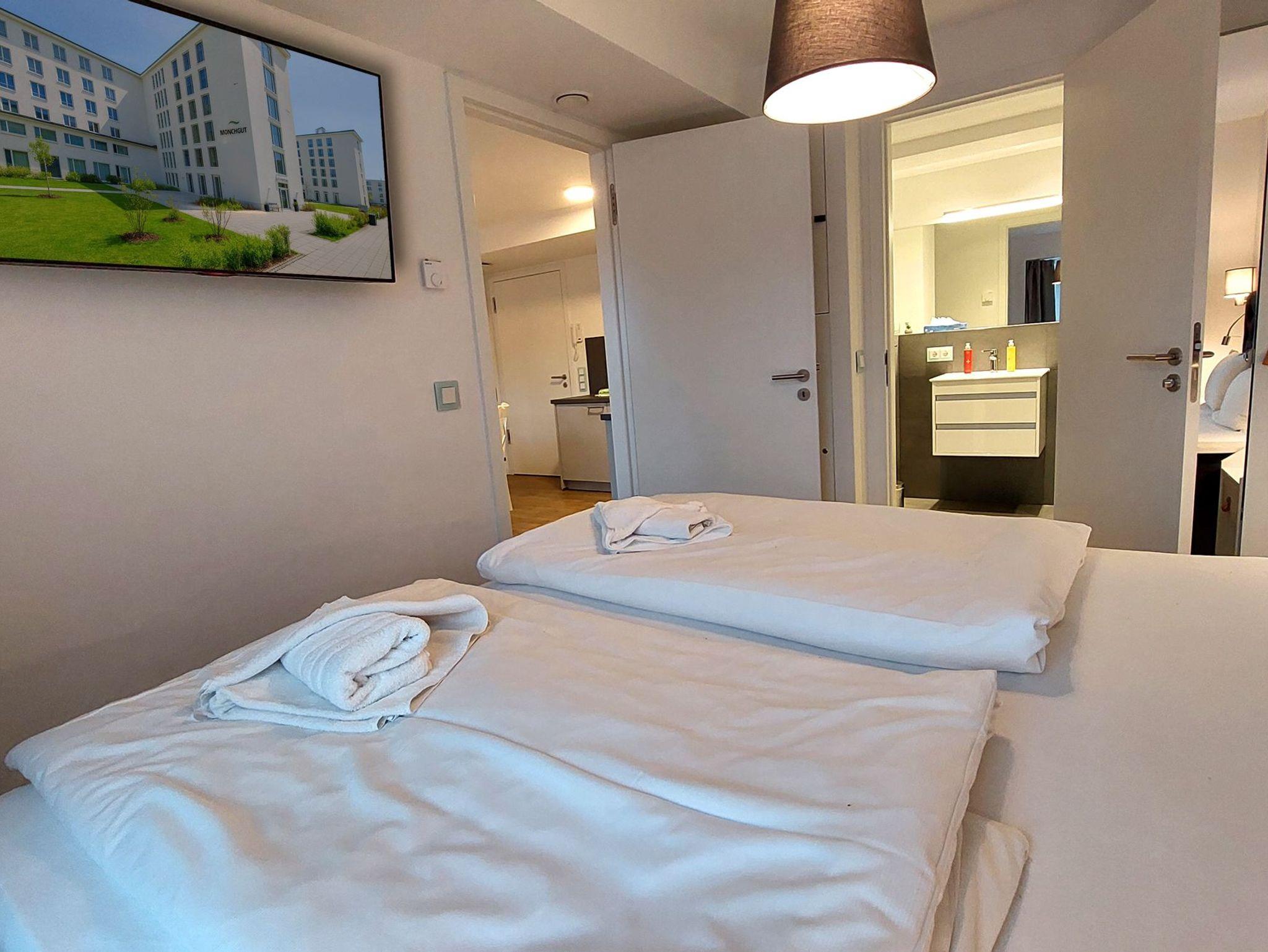 Die Wohnung verfügt über 2 vollwertige Schlafzimmer, jeweils mit einem Doppelbett, Kleiderschrank und eigenem Fernseher. Eines der Schlafzimmer hat außerdem ein eigenes Badezimmer (Bad en Suite). Das zweite Badezimmer ist ebenfalls ausgestattet mit WC, Waschtisch und ebenerdiger Dusche.