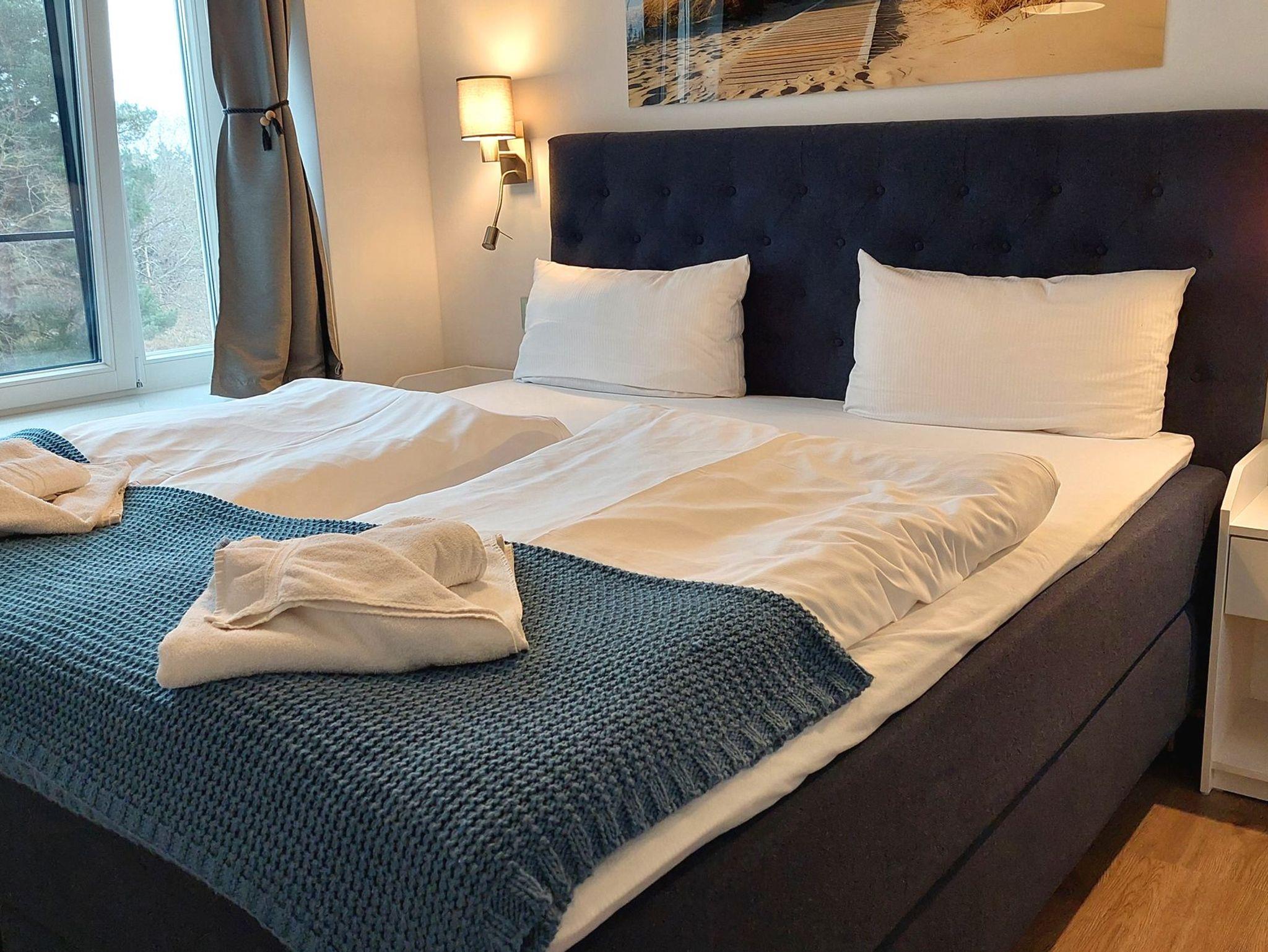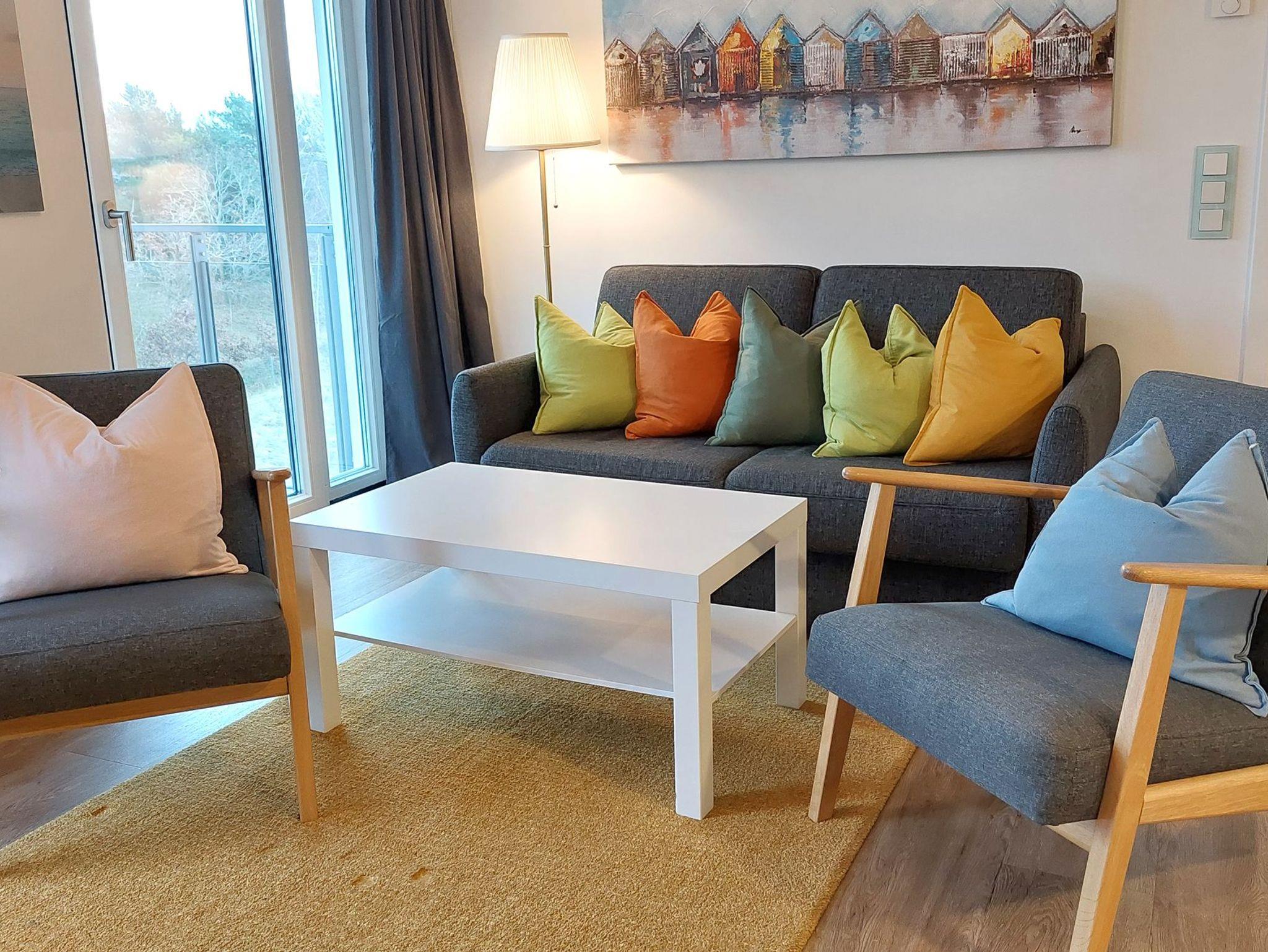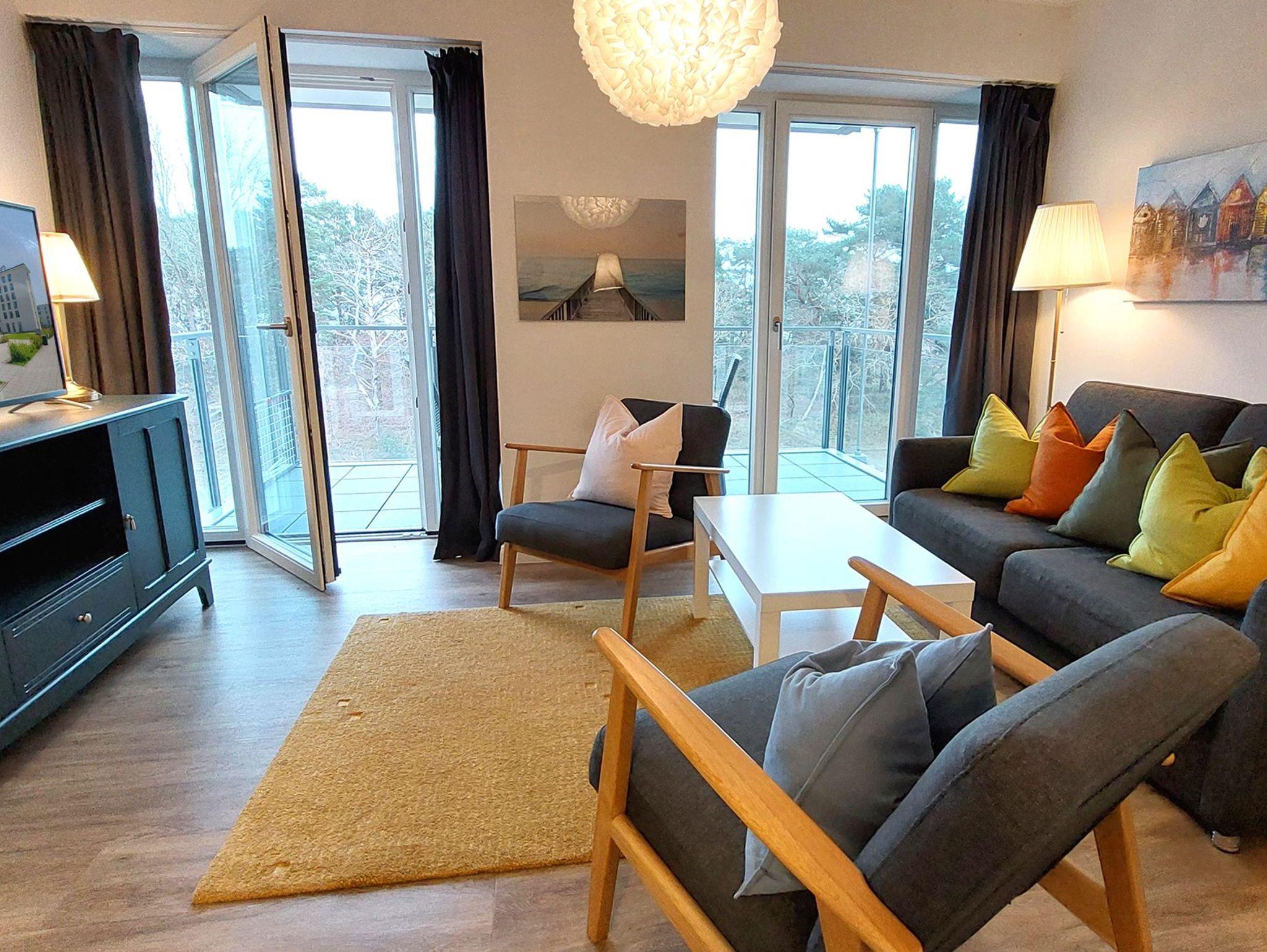 Das Wohn- und Esszimmer ist das Zentrum der Wohnung und lädt mit einer ausklappbaren Sofalandschaft zum Entspannen ein. Für Unterhaltung bei jedem Wetter gibt es einen Smart-TV und kostenfreies WLAN. Der Essbereich bietet Platz für 6 Personen und vom möblierten und überdachten Balkon aus hat man einen Blick auf den angrenzenden Küstenwald und die Ostseedünen.