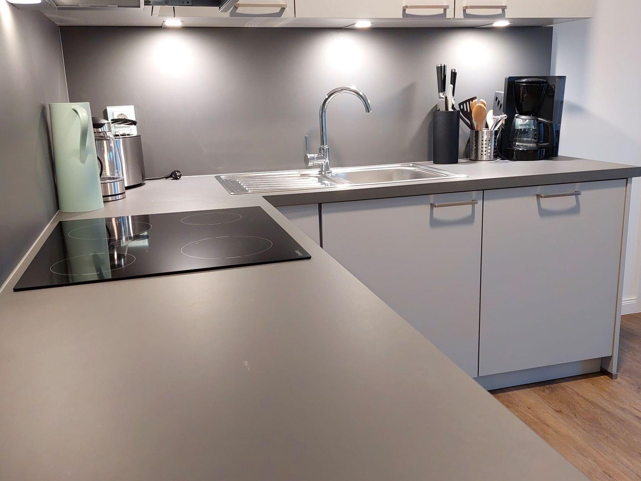 Die moderne Einbauküche ist komplett ausgestattet mit einem Geschirrspüler, einem Kühlschrank mit Gefrierfach, einem Cerankochfeld, einem Toaster, einer Kaffeemaschine und einem Wasserkocher.