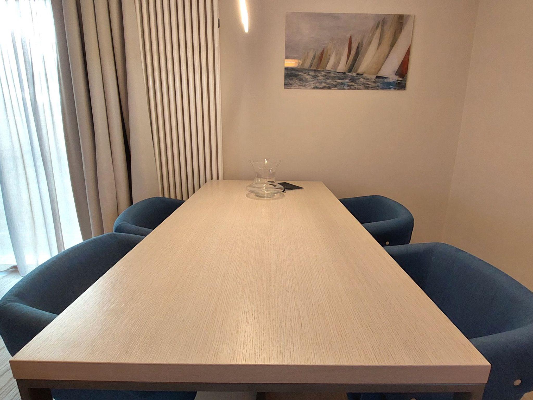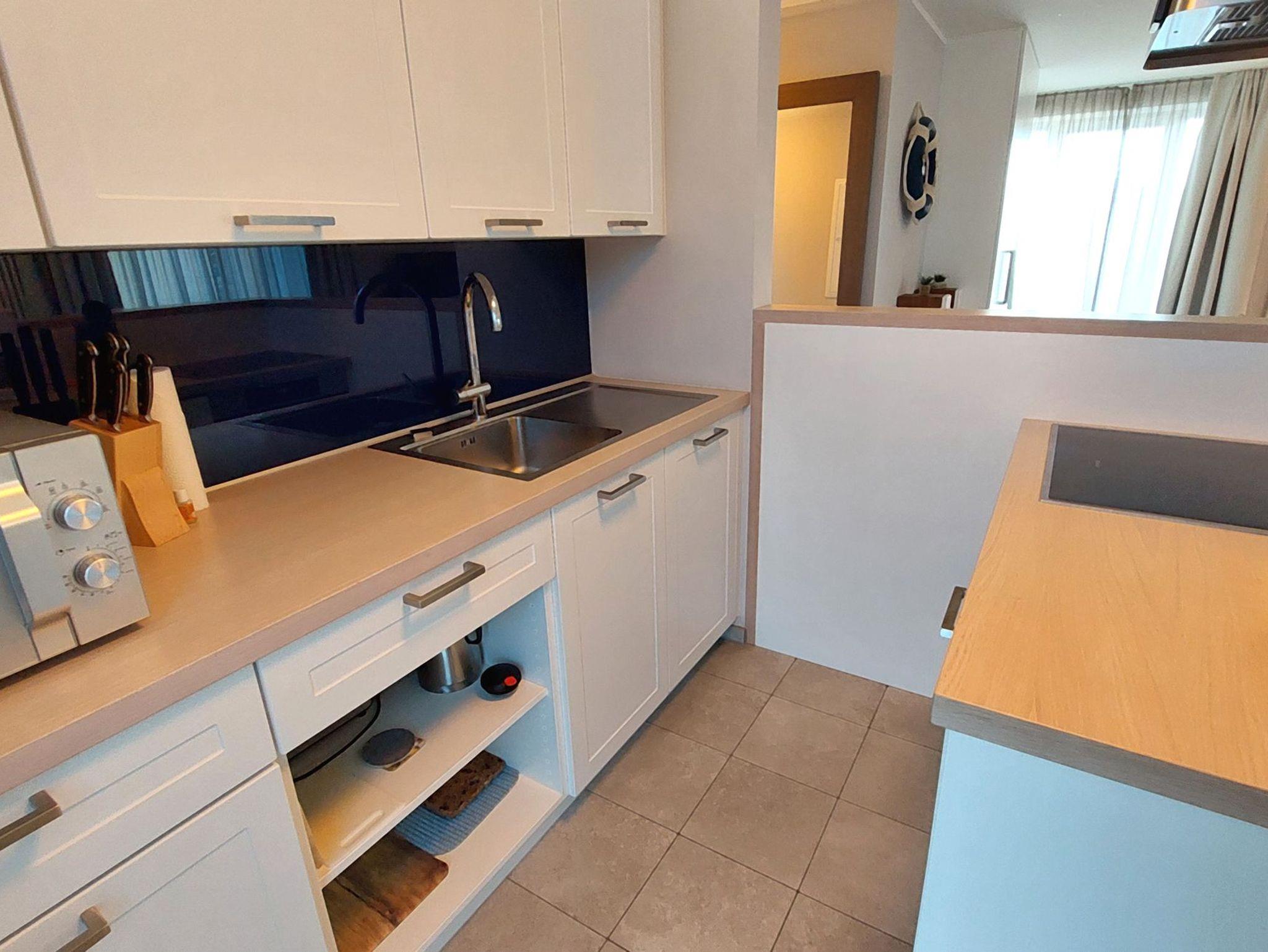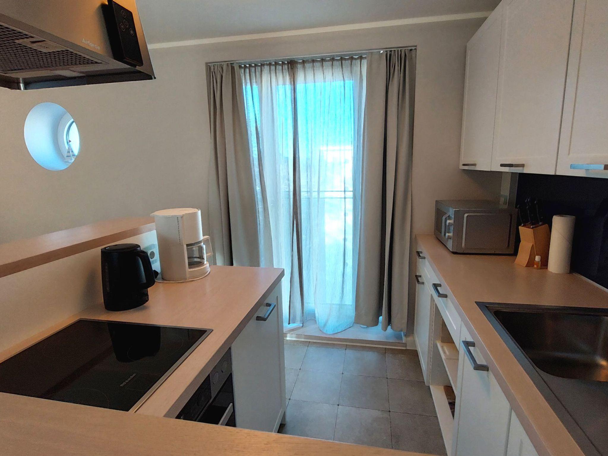 Dort finden Sie Cerankochfeld, Backofen, Mikrowelle, Geschirrspüler, Kühlschrank (mit Gefrierfach) und viele weitere nützliche Küchenhelfer, welche auch im Urlaub die Möglichkeit der Selbstversorgung bietet. Der Esstisch bietet Sitzgelegenheiten für 4 Personen.