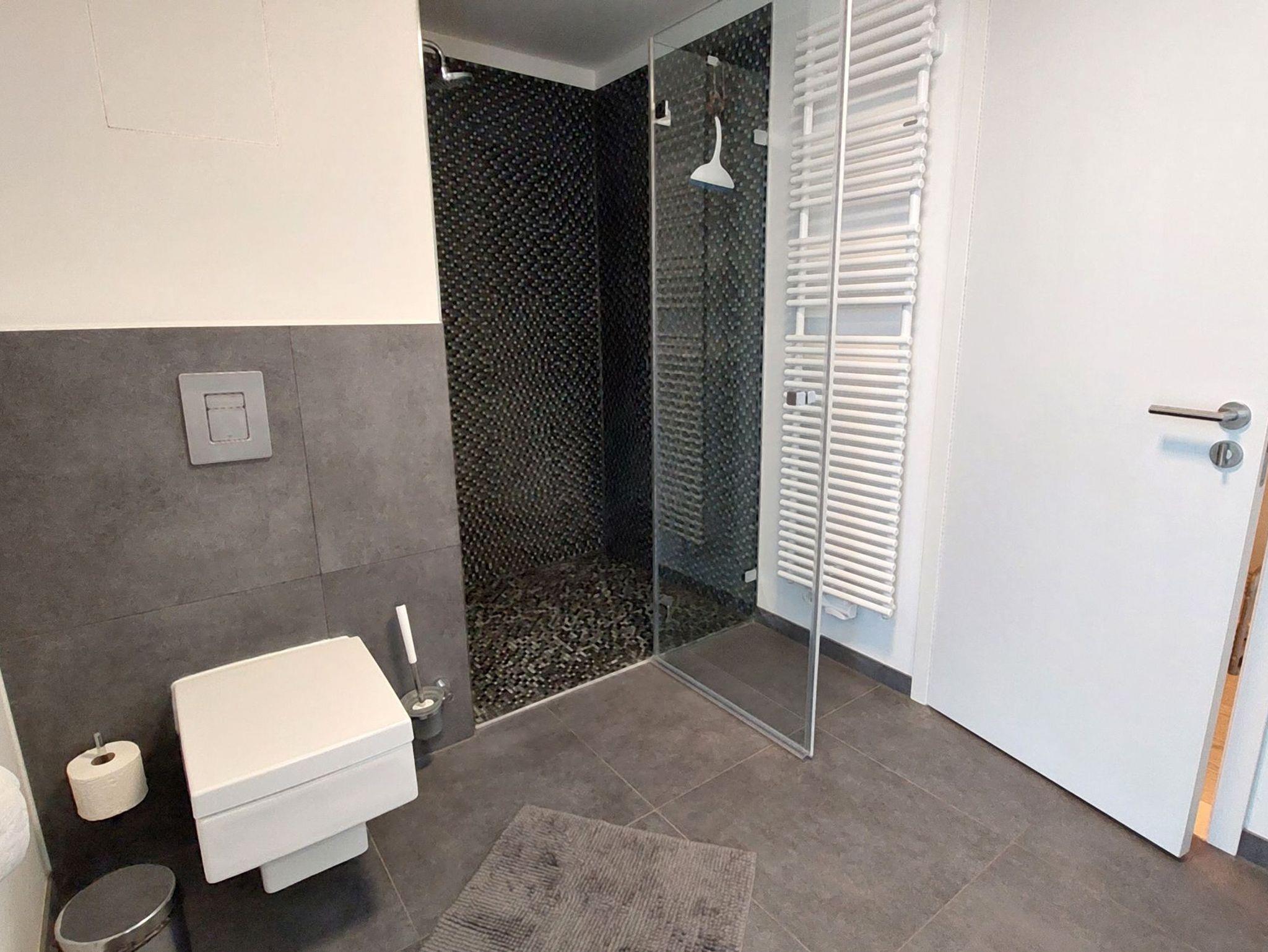 Das geräumige Tageslichtbad verfügt über WC, Waschtisch und großer ebenerdiger Dusche.