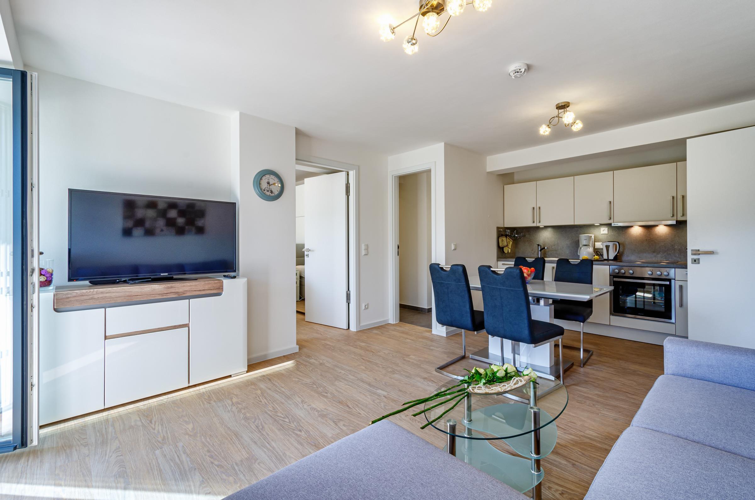 - Wohn/Essbereich: Schlafsofa 160x200, Smart-TV, Esstisch, Zugang zum Balkon