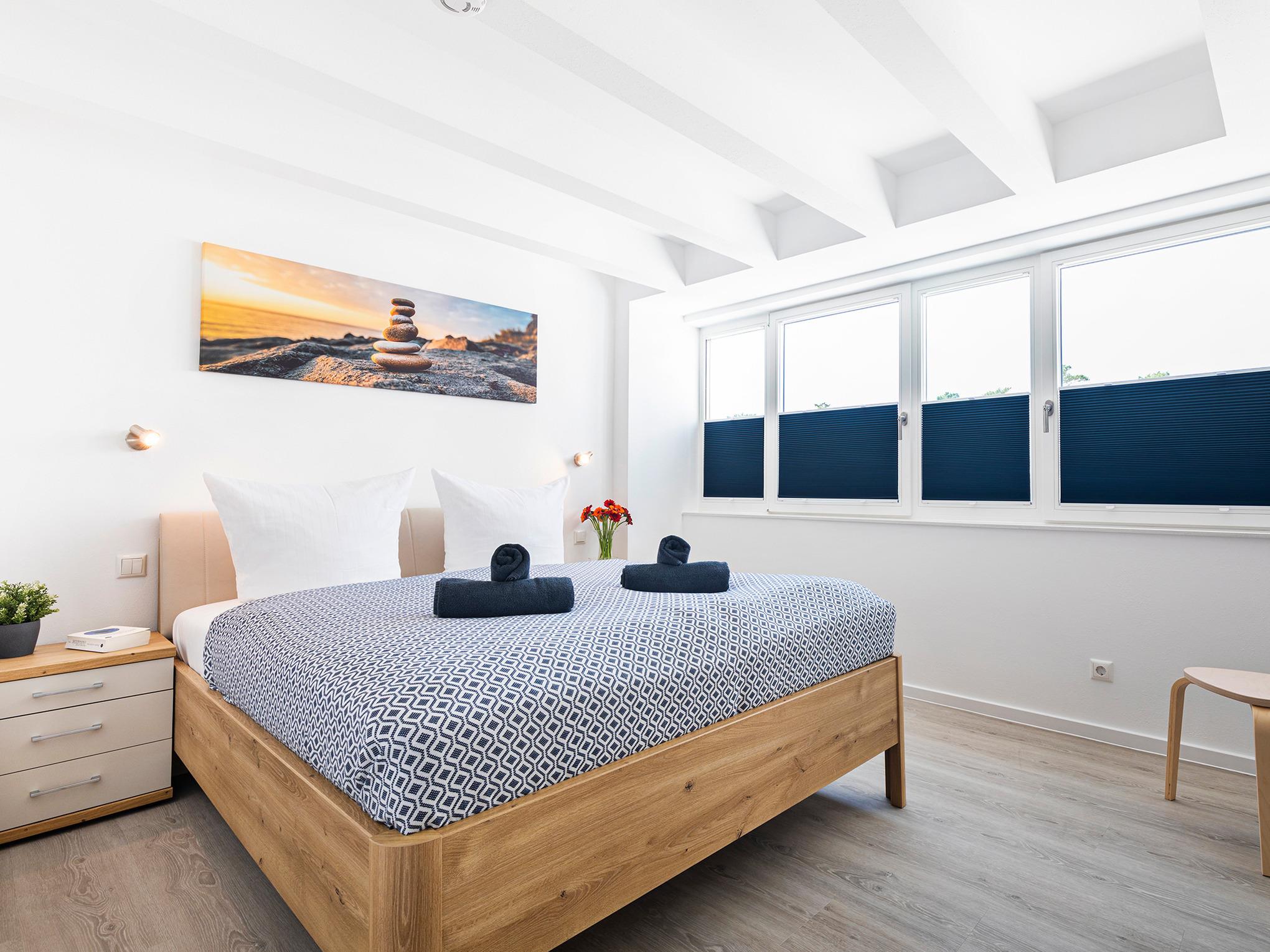 Über eine Treppe gelangen Sie in das 4. Obergeschoss. Hier befinden sich zwei Schlafzimmer mit Doppelbetten und zwei Duschbäder, davon Eines en Suite. Beide Schlafzimmer können verdunkelt werden. Die Fenster bzw. Tür zum Balkon beider Zimmer sind mit Insektenschutz ausgestattet. Das seeseitige Schlafzimmer verfügt ebenfalls über ein Panoramafenster und einen eigenen Balkon. Hier stehen Ihnen ein Tisch mit zwei Sonnenliegen zur Verfügung. Zur weiteren Ausstattung gehört ein Fernseher mit Kabel- und Internetanschluss.
