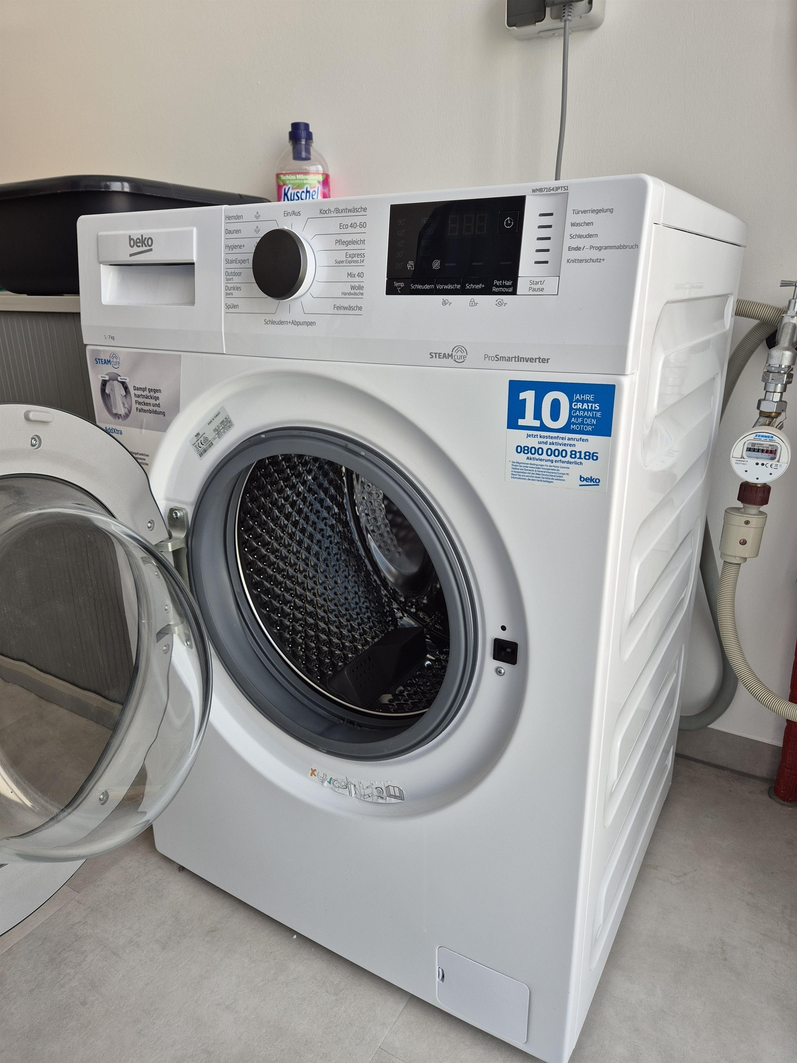 Waschmaschine, Bügelbrett und Bügeleisen im Abstellraum, Minisafe, Staubsauger