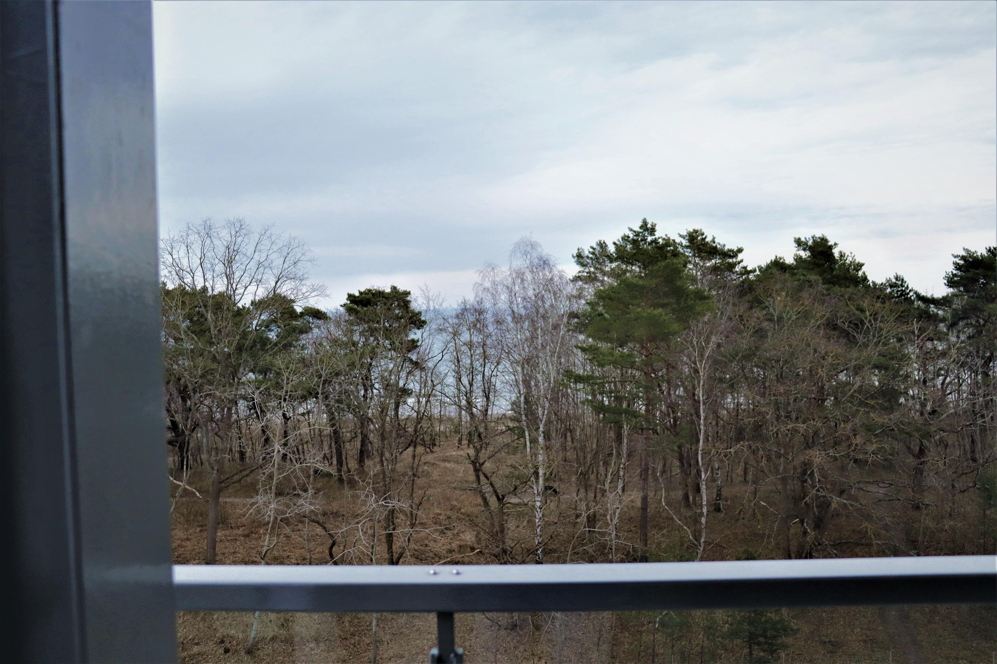Die offene Gestaltung als Teil der Konzeption der Liegehallen spiegelt sich in den Panoramafenstern und den gläsernen Brüstungen der Balkone wieder, die einen großartigen Blick auf den Baumstreifen vor dem Strand erlauben. Wenn Sie auf dem vorgelagerten Balkon stehen, können Sie einen Teil der Binzer Bucht sehen und in der Ferne die Kreidefelsen erahnen.