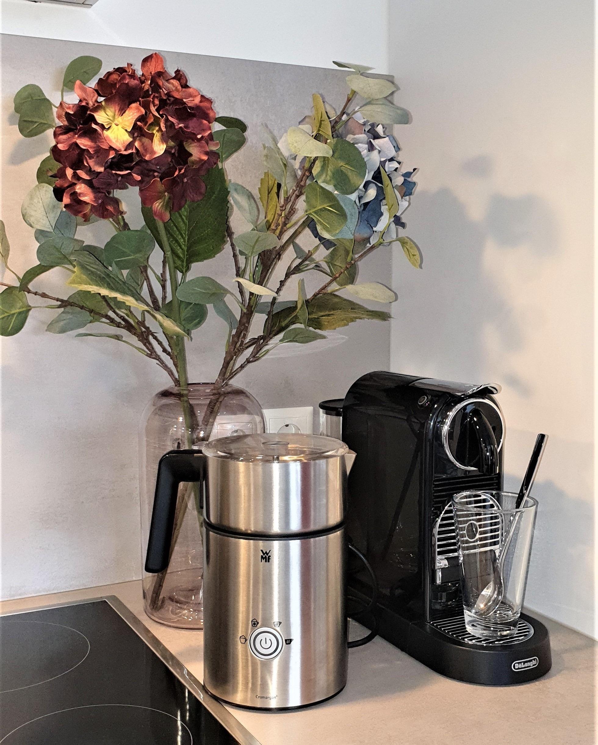 - Vollausgestattete Küche: Kühlschrank mit Gefrierfach, Backofen, Spülmaschine, Geschirr/Besteck, Kochutensilien, Toaster, Mikrowelle, Wasserkocher, Kaffeemaschine mit Filter, Nespresso-Kapselmaschine, elektr. Milchaufschäumer, elektr. Handmixer, Messerblock, Kindergeschirr und Kinderbesteck (je 2x)